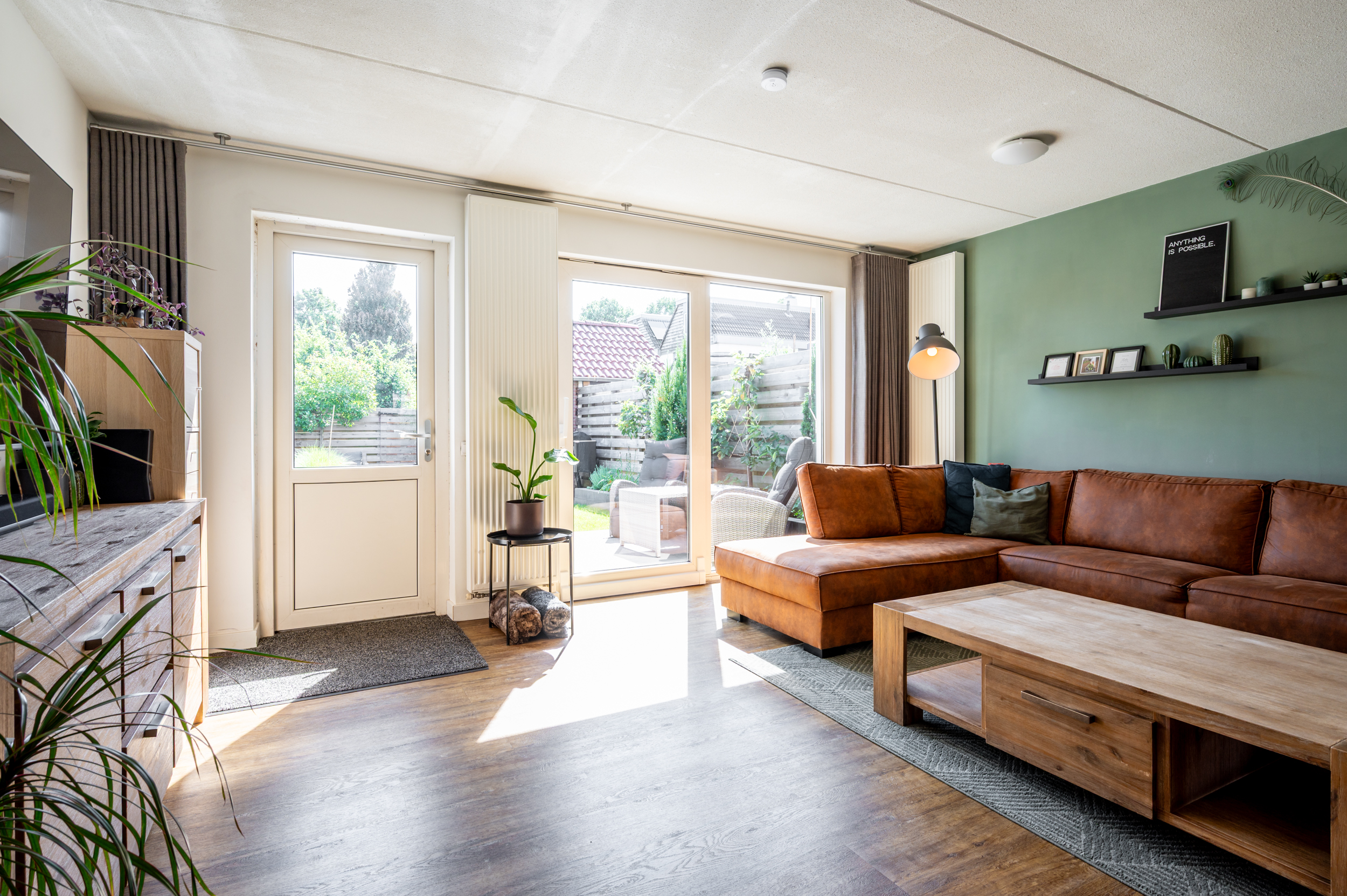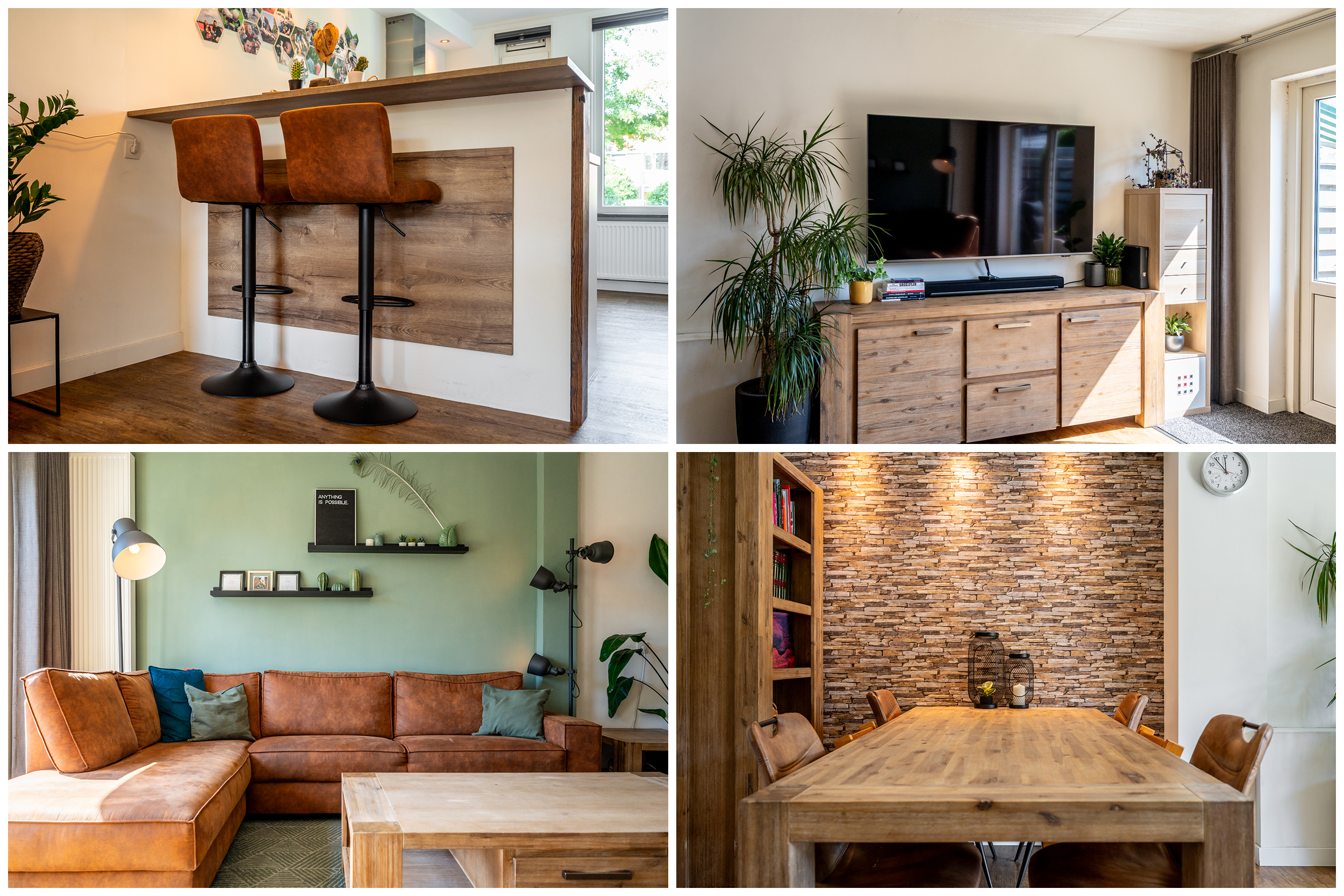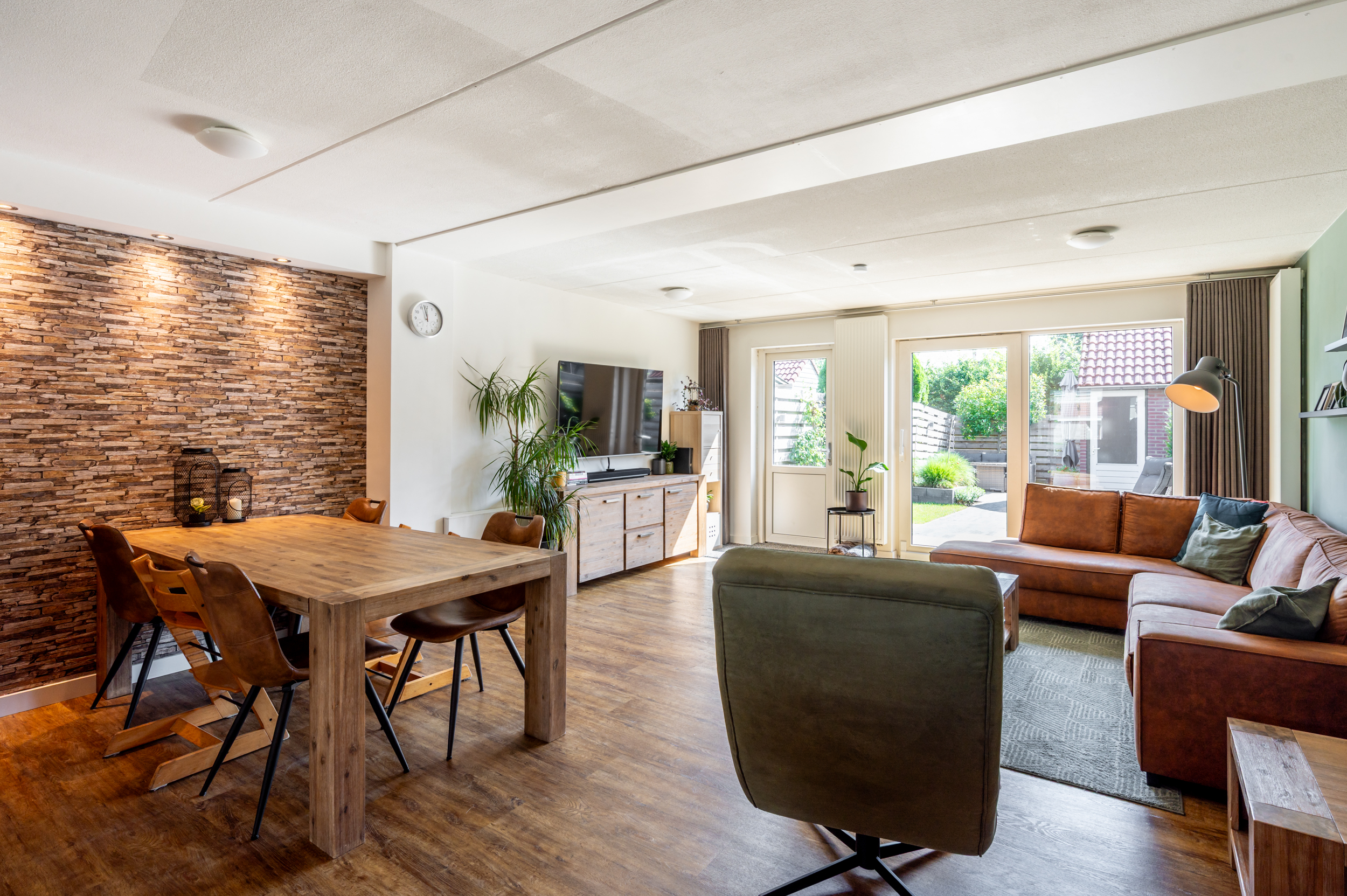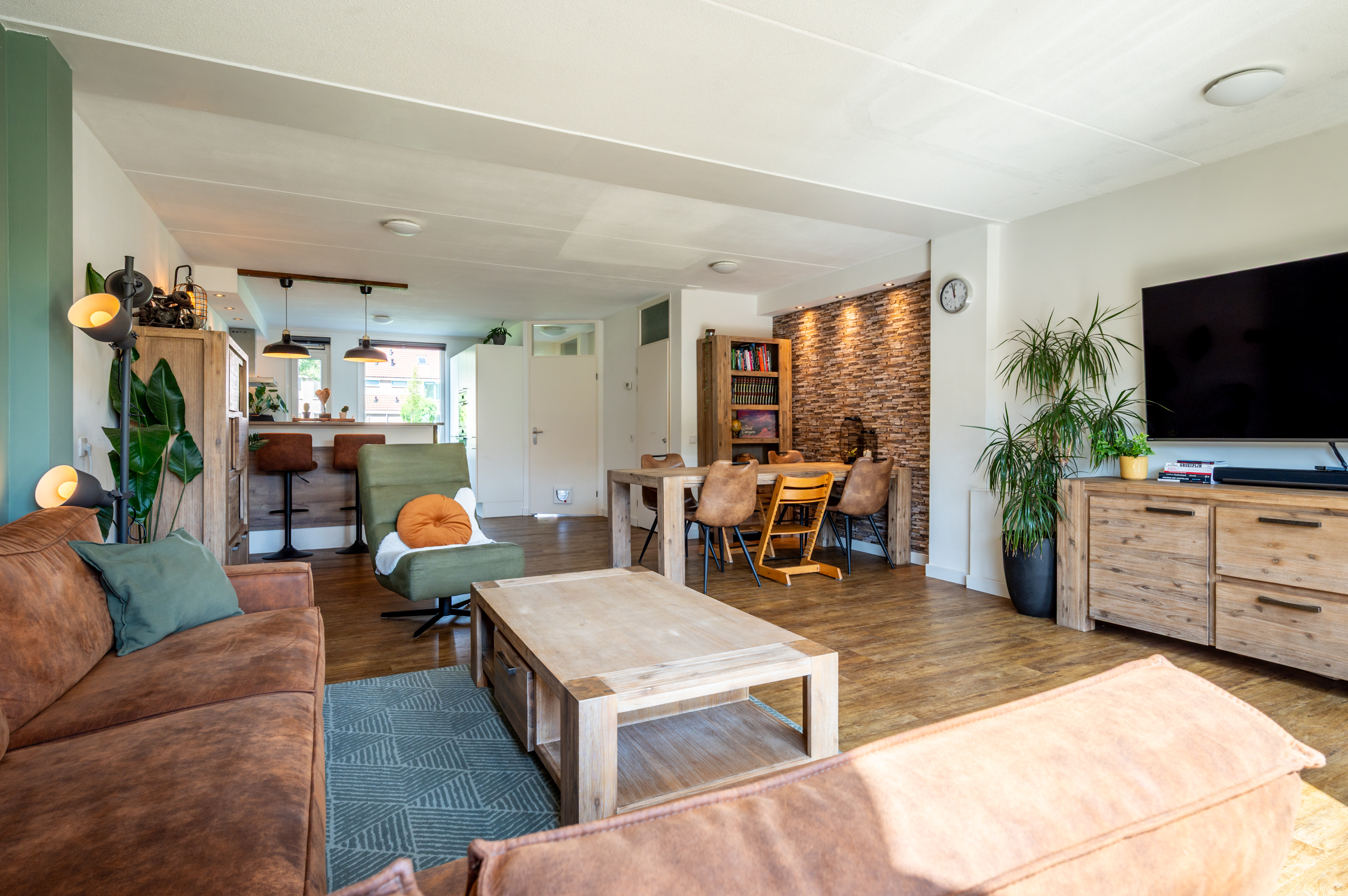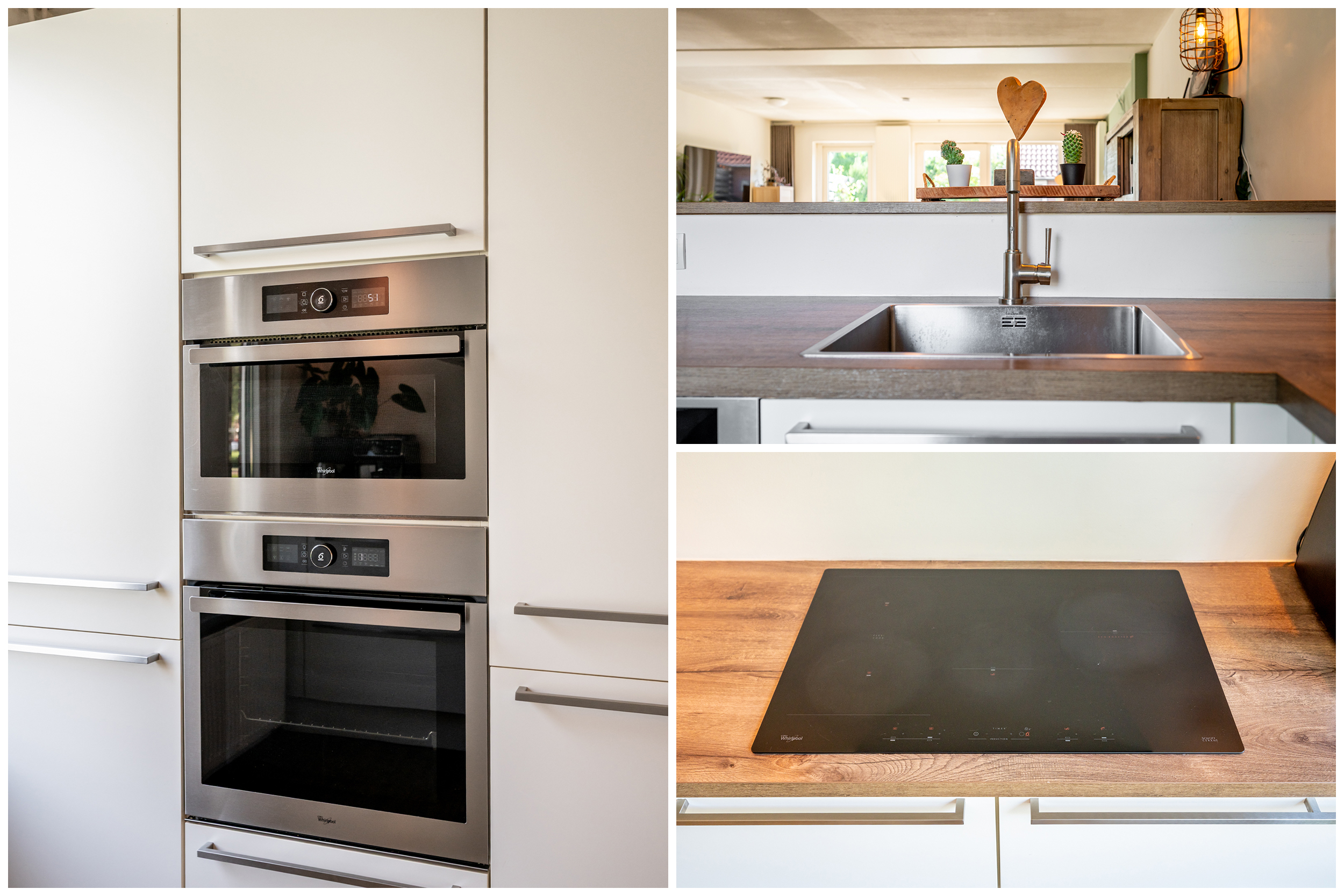 Stap de royale woonkamer binnen, die dankzij de uitbouw extra ruim is geworden. Hier plaats je met gemak een riante zithoek. De schuifpui laat veel natuurlijk licht binnen en geeft toegang tot de tuin. Liever via de loopdeur naar buiten omdat dat beter in je indeling past? Ook dat kan. Naast de woonkamer is er volop ruimte voor een eettafel, perfect om met vrienden of familie gezellig te tafelen. Extra handig is de trapkast: nu ingericht als garderobe, maar ook ideaal als voorraadkast of opbergruimte. Ook de keuken mag er zeker zijn. Deze heeft een grote kastenwand en daar tegenover een royale L-opstelling met bar, waardoor je heerlijk aansluit als iemand aan het koken is of in de ochtend rustig van je ontbijt kunt genieten. In de kastenwand vind je de koelkast, vriezer, combimagnetron en oven. Aan de andere zijde tref je de spoelbak, een 4-pits inductiekookplaat, een rvs-afzuigschouw en een vaatwasser. De combinatie van witte fronten en een houtlook werkblad sluit perfect aan bij de pvc-vloer die door de hele begane grond is gelegd.