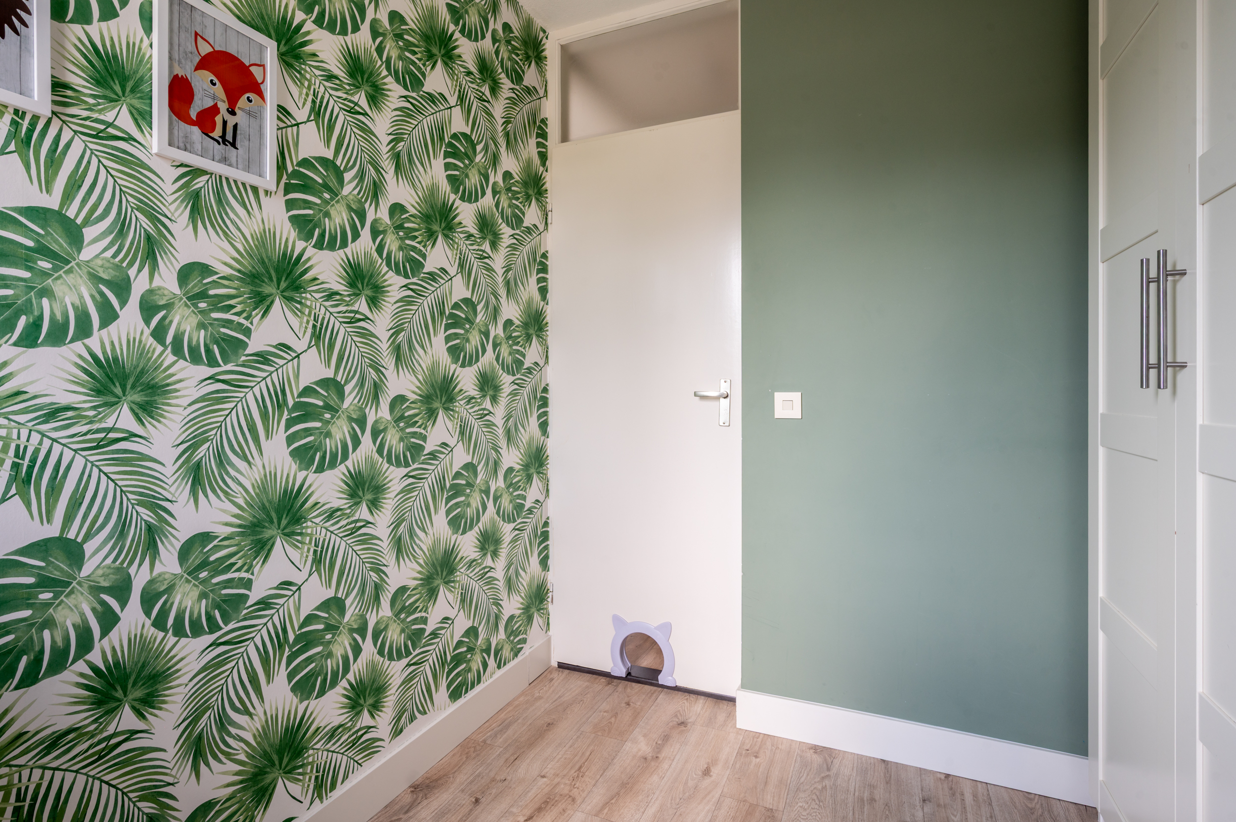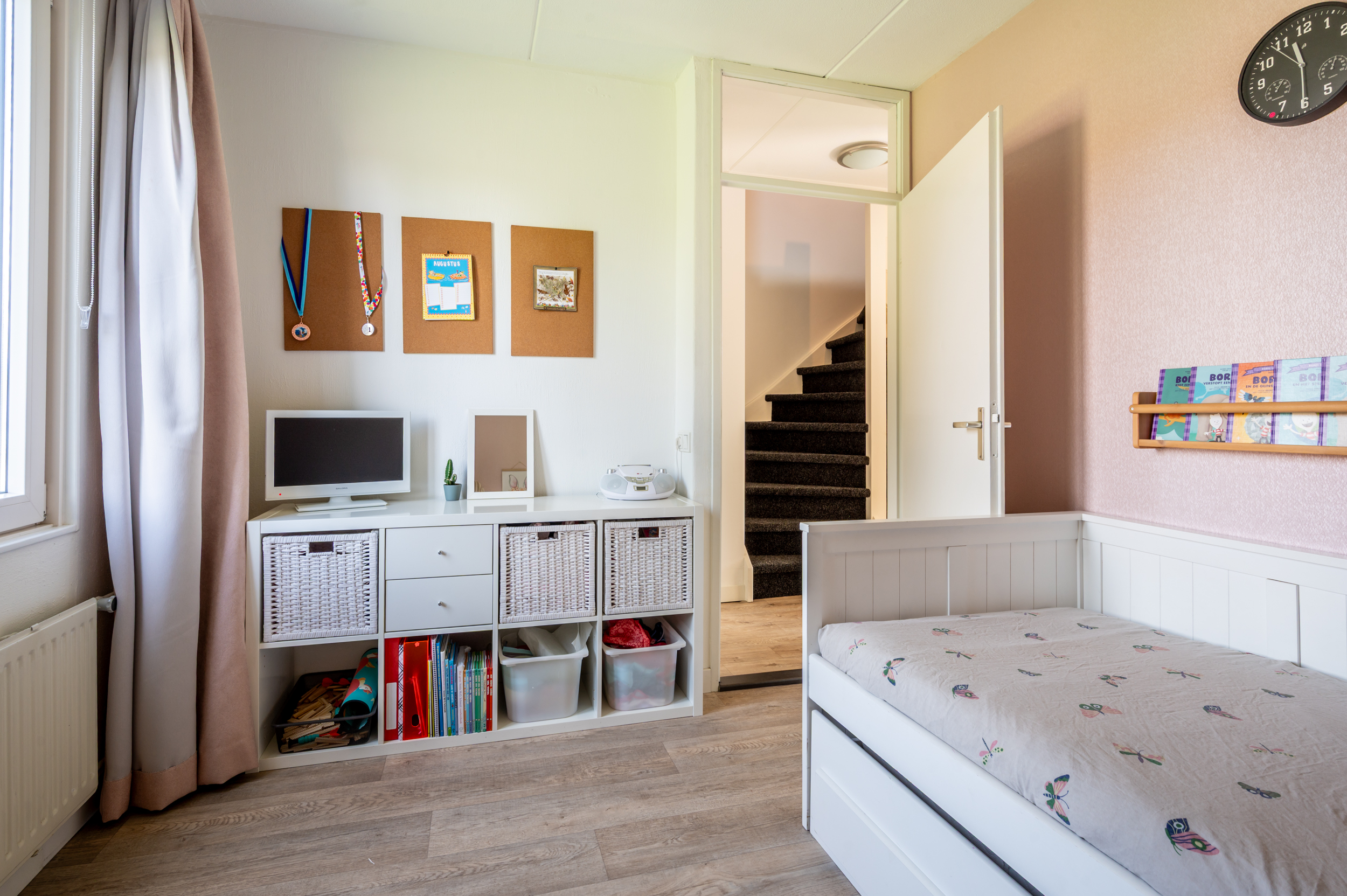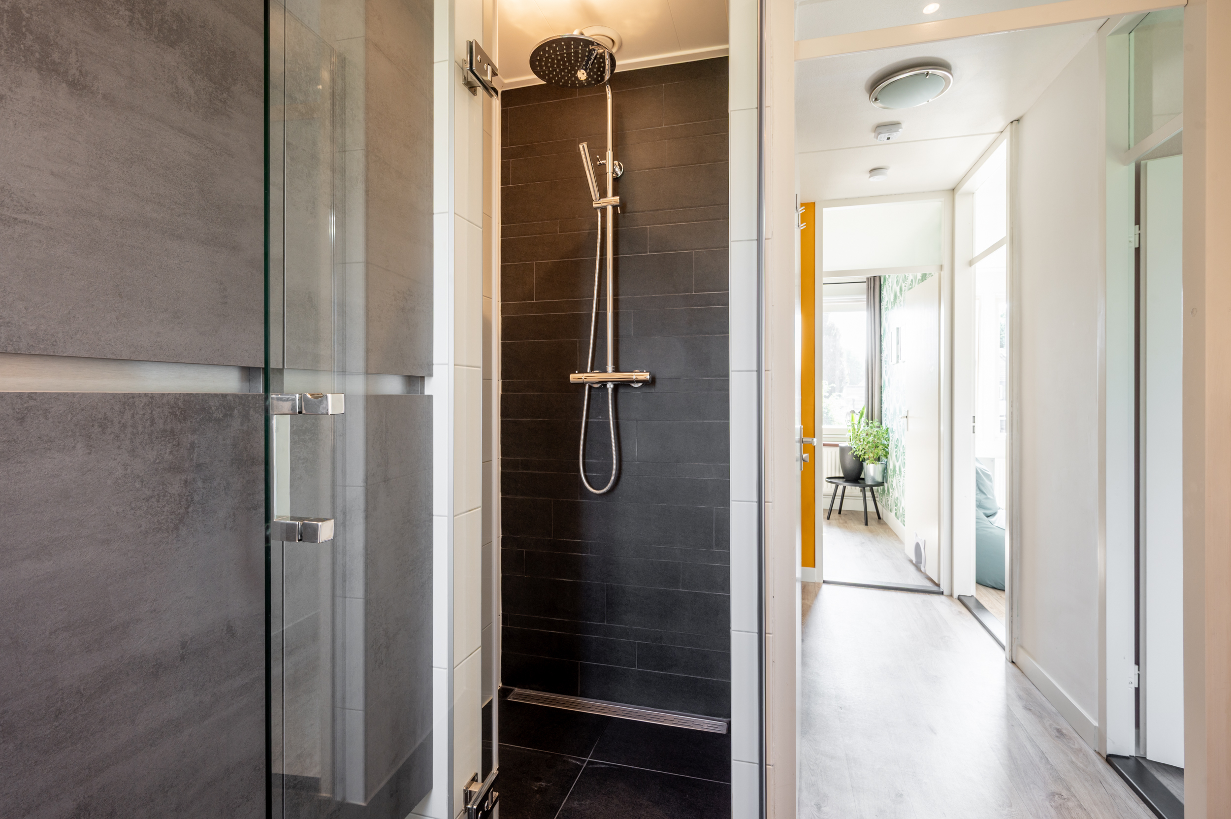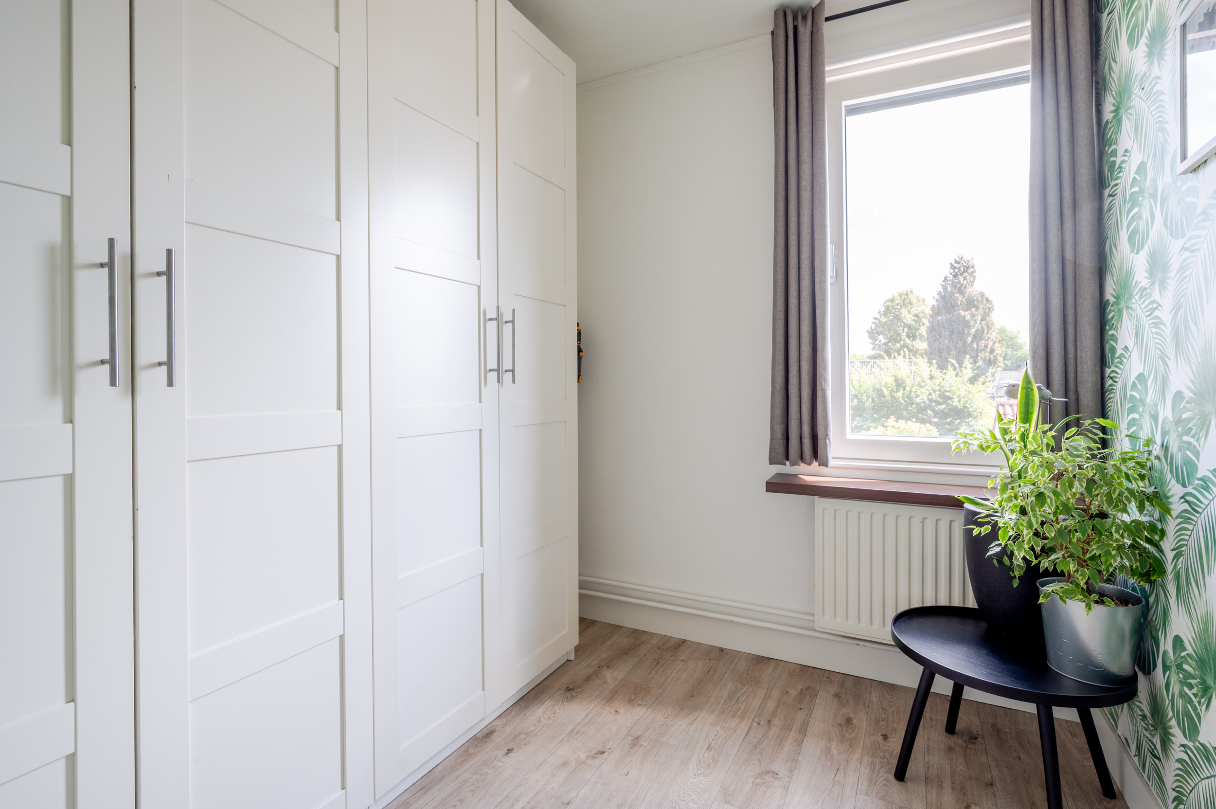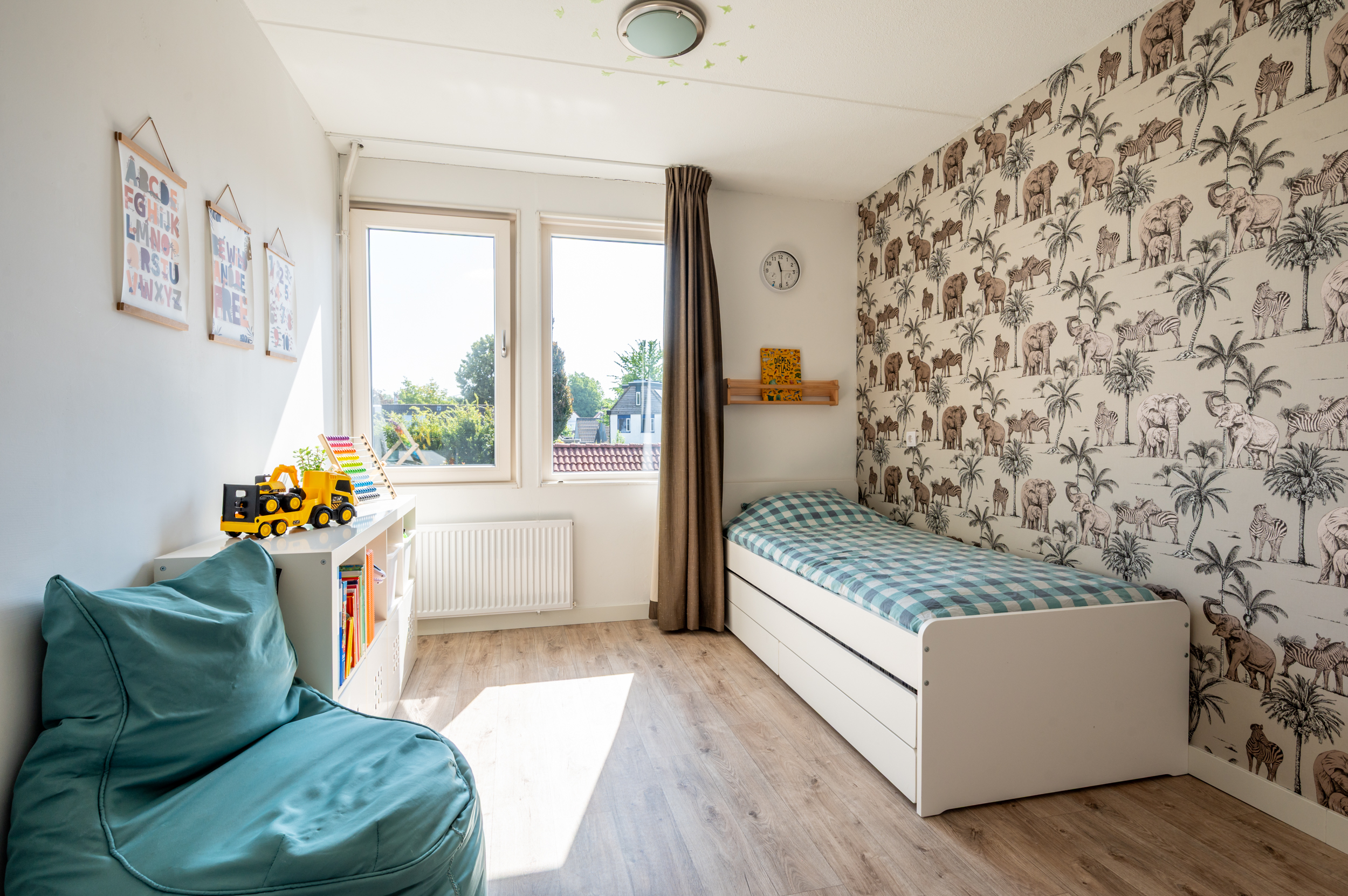 Via de gestoffeerde trap kom je op de overloop die toegang biedt tot de drie slaapkamers en de badkamer. Twee slaapkamers liggen aan de achterzijde en de derde aan de voorzijde van de woning. Alle kamers zijn voorzien van een vinyl vloer en behang, en de kunststof draai-/kiepramen zorgen voor veel licht. De badkamer is in 2021 vernieuwd en modern uitgevoerd. Je vindt hier een inloopdouche met regen- en handdouche, een zwevend toilet(ook deze spoelt extra stil door, handig voor in de nachten), wastafelmeubel met spiegel en verlichting en een designradiator.