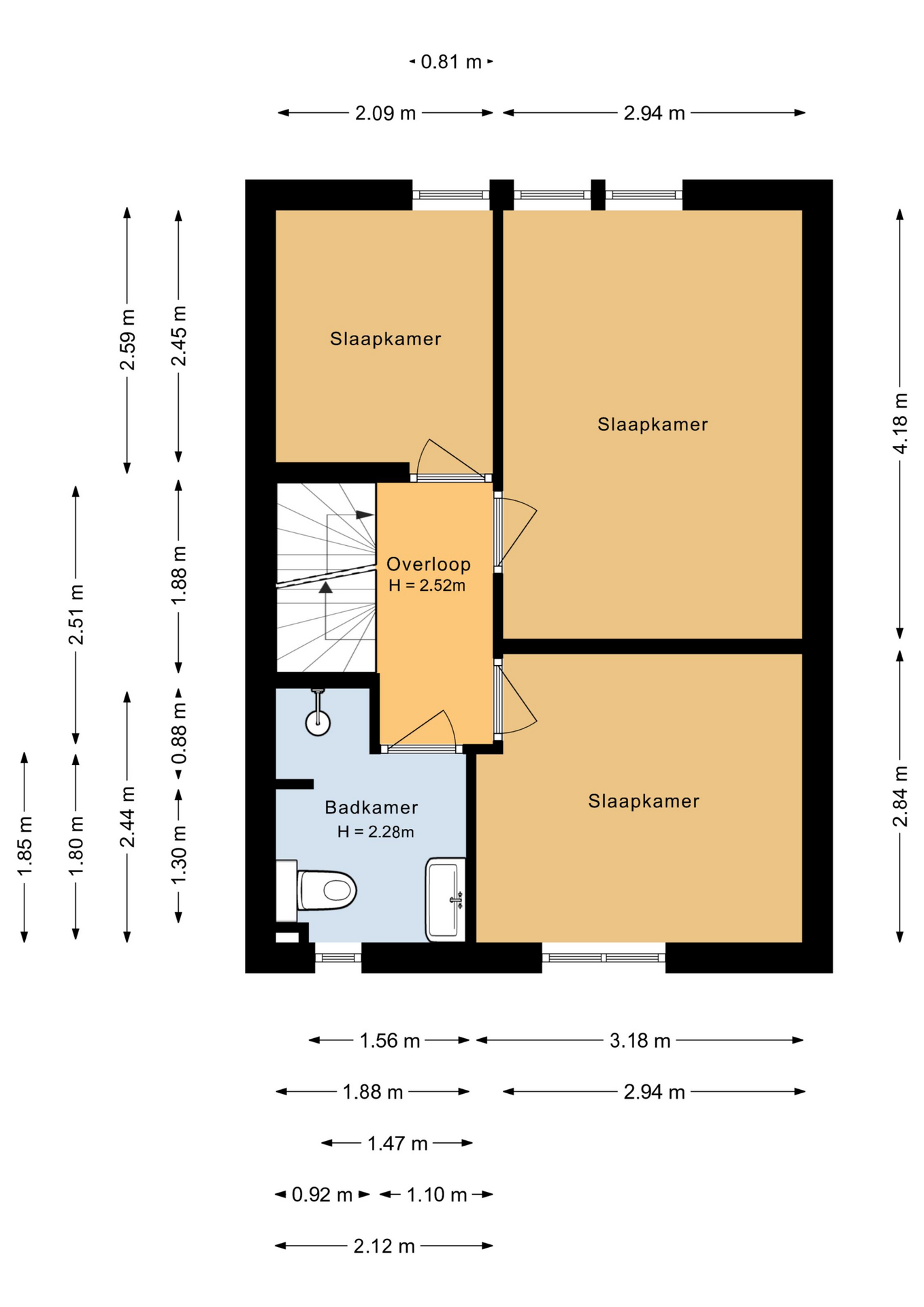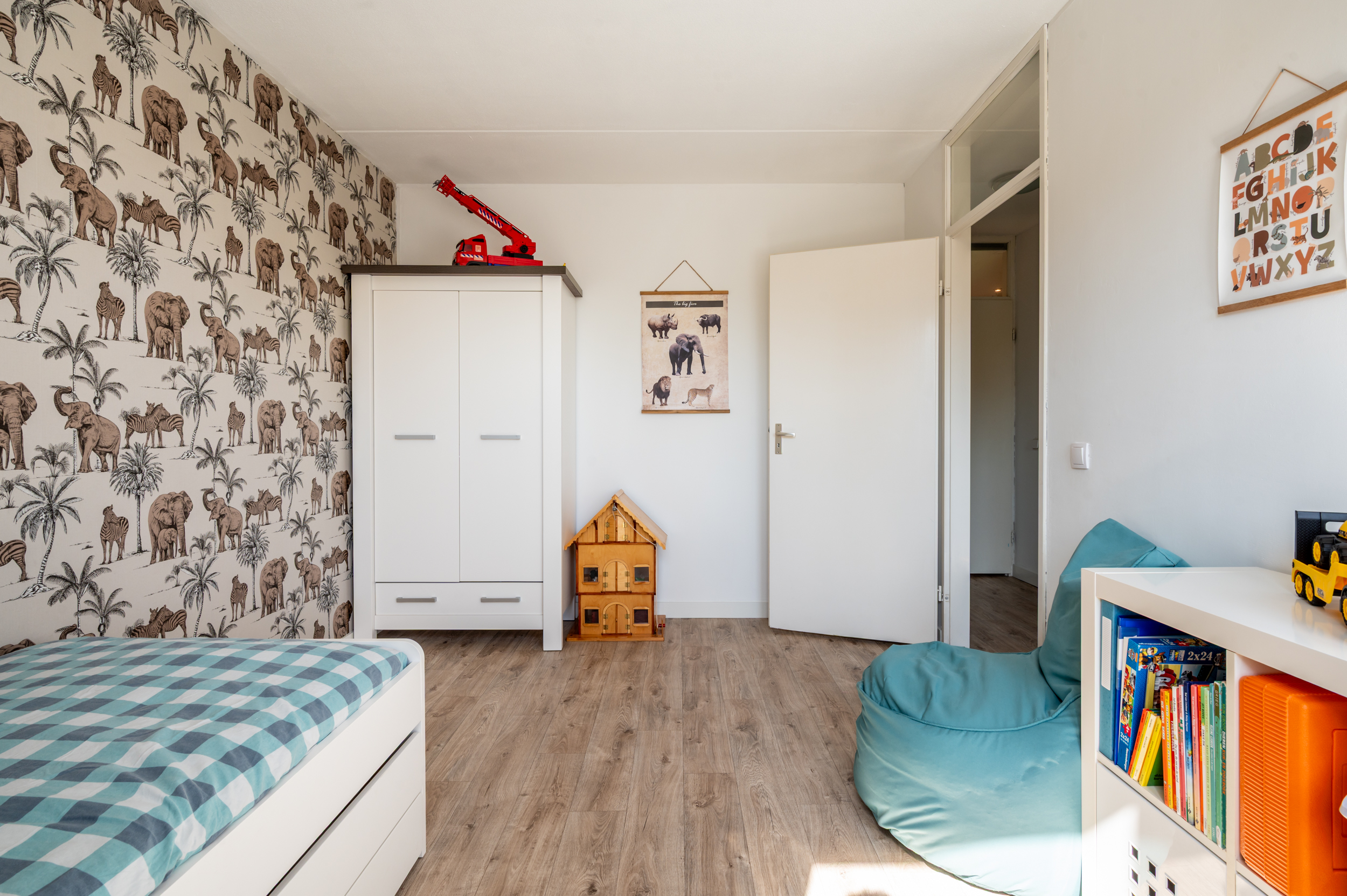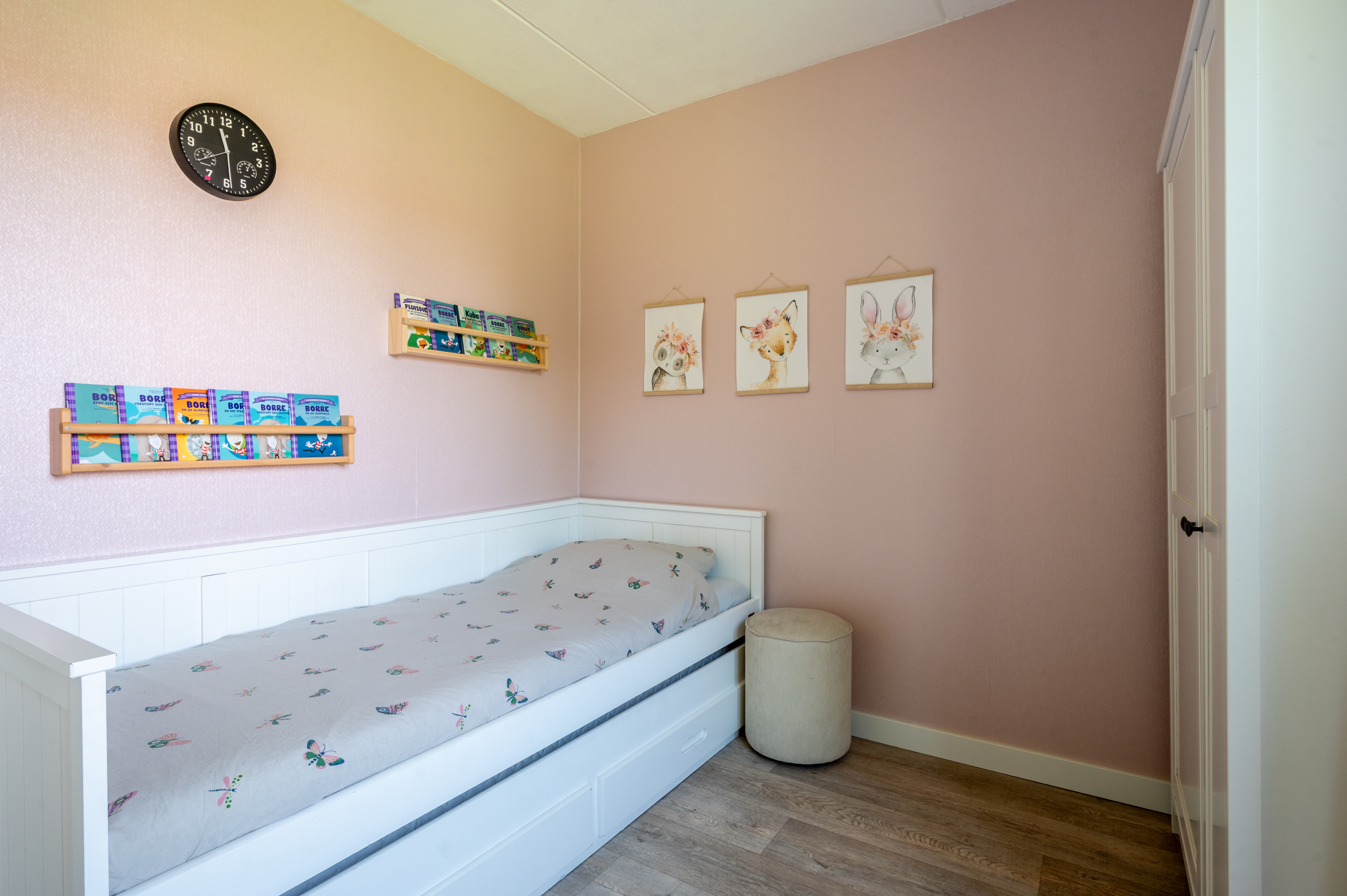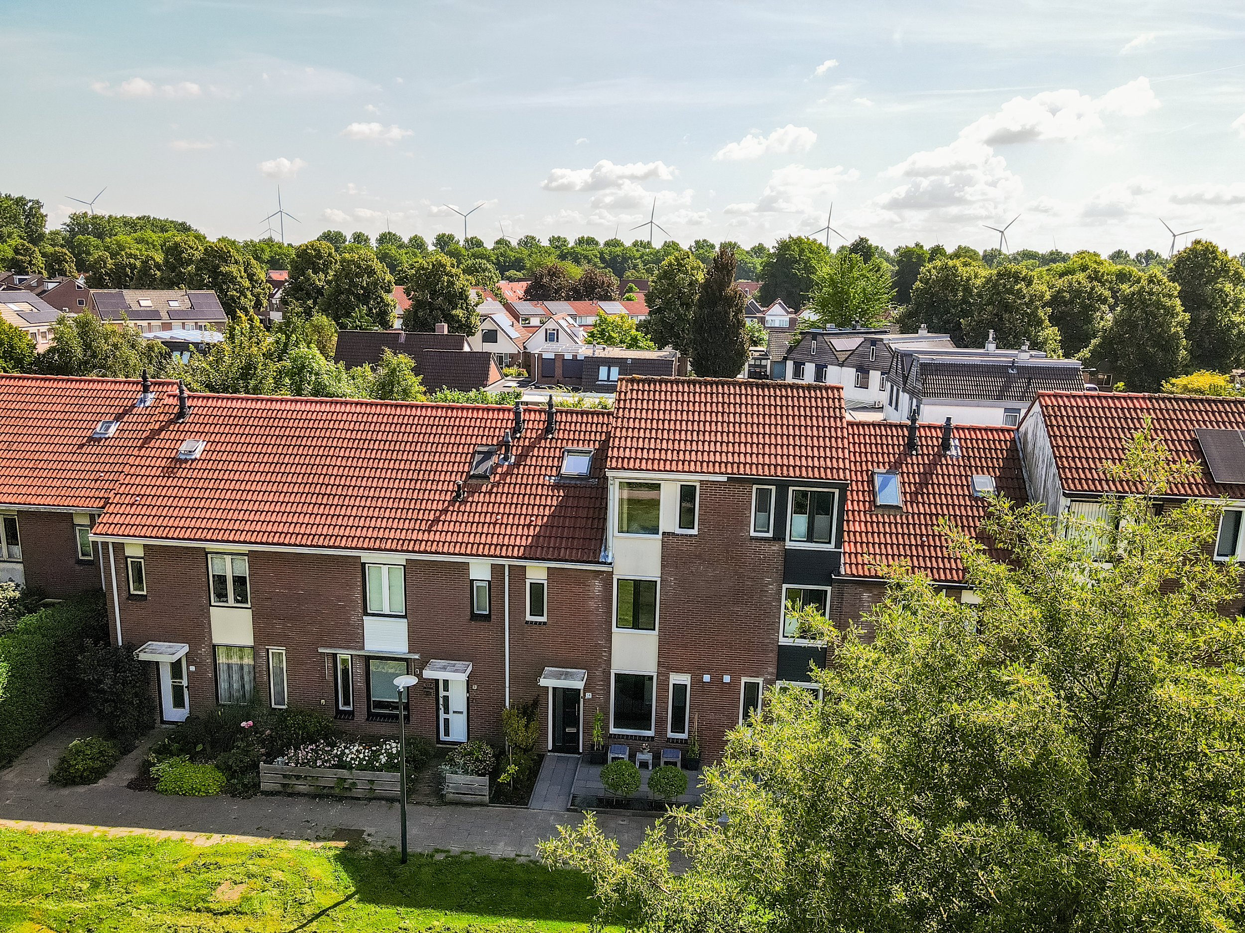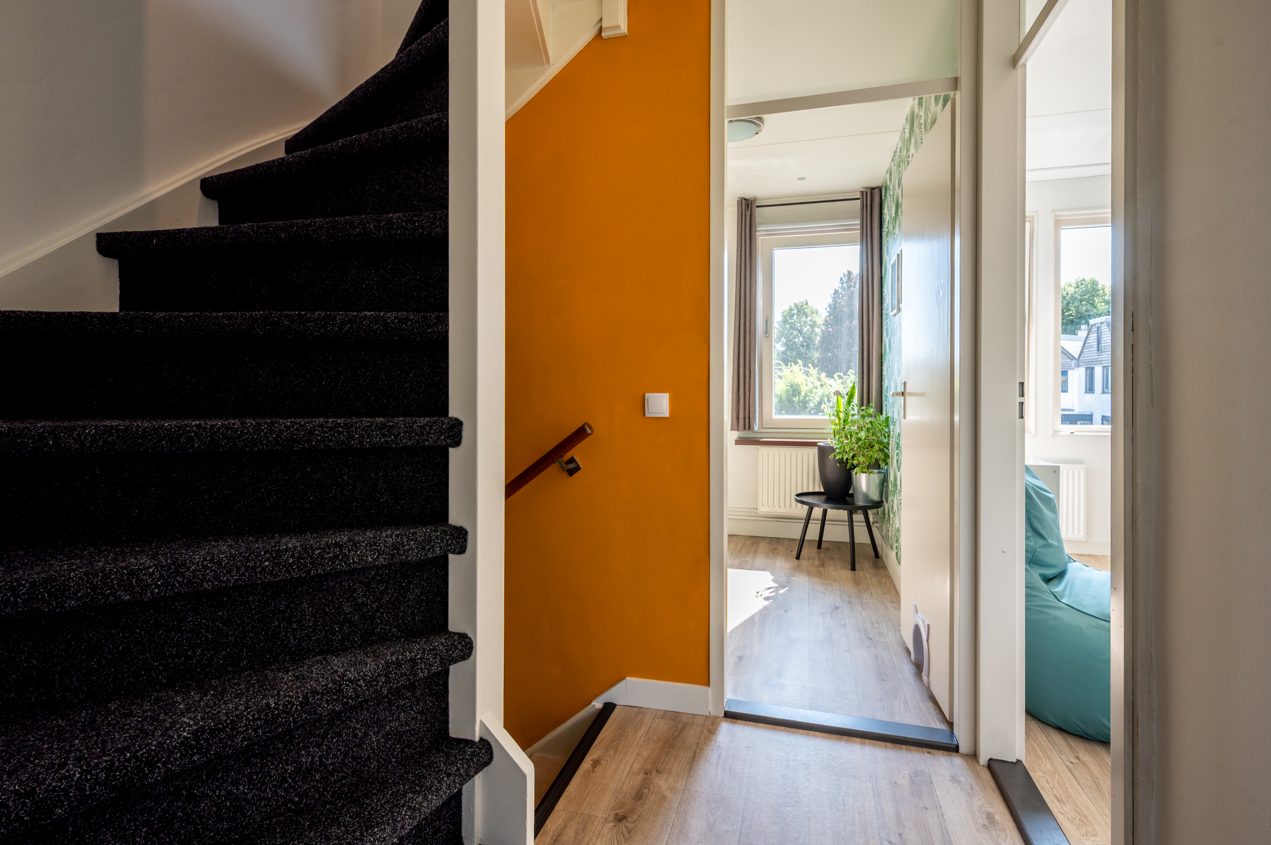 Via de gestoffeerde trap kom je op de overloop die toegang biedt tot de drie slaapkamers en de badkamer. Twee slaapkamers liggen aan de achterzijde en de derde aan de voorzijde van de woning. Alle kamers zijn voorzien van een vinyl vloer en behang, en de kunststof draai-/kiepramen zorgen voor veel licht. De badkamer is in 2021 vernieuwd en modern uitgevoerd. Je vindt hier een inloopdouche met regen- en handdouche, een zwevend toilet(ook deze spoelt extra stil door, handig voor in de nachten), wastafelmeubel met spiegel en verlichting en een designradiator.