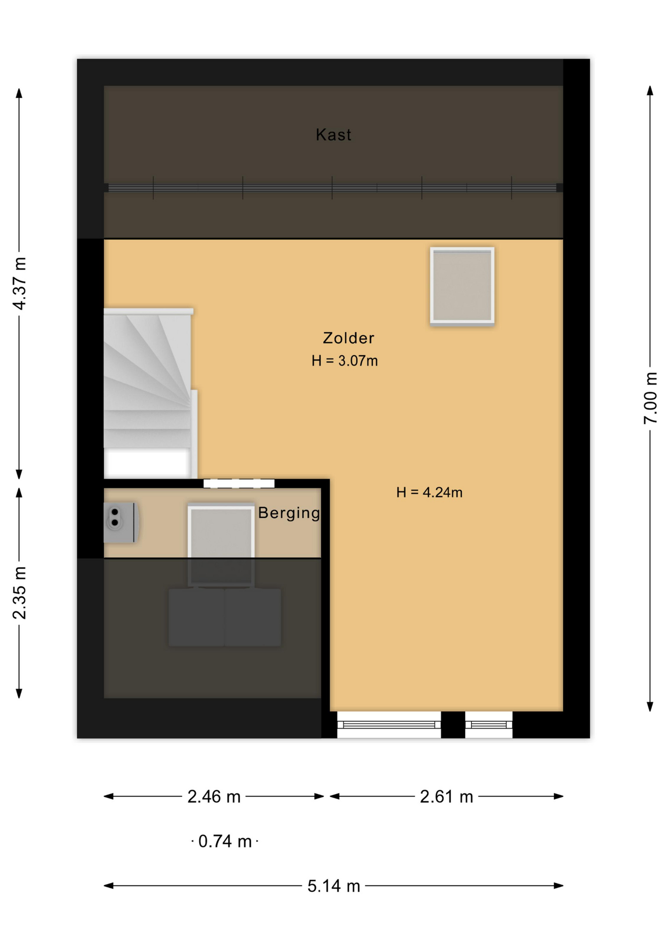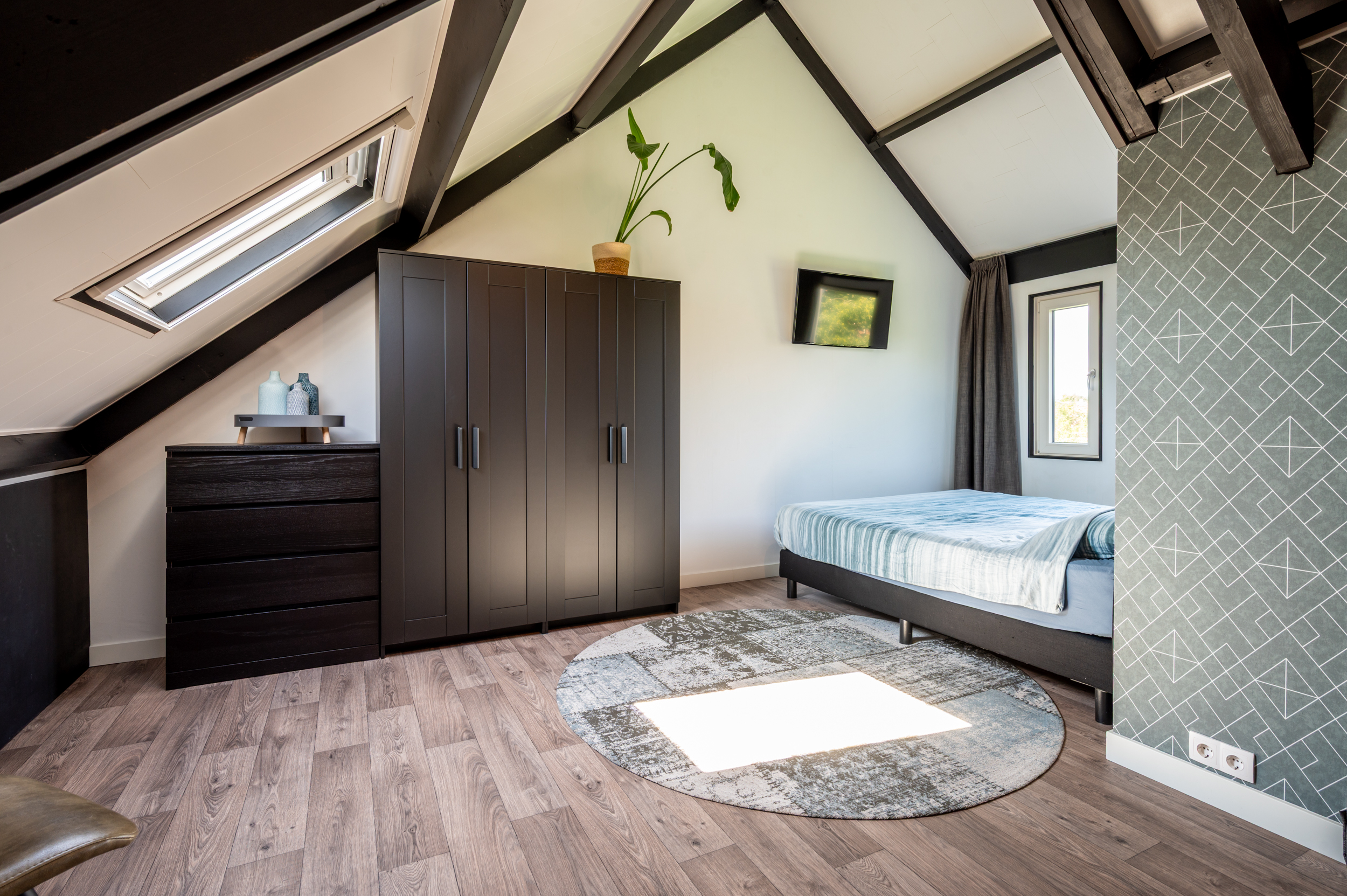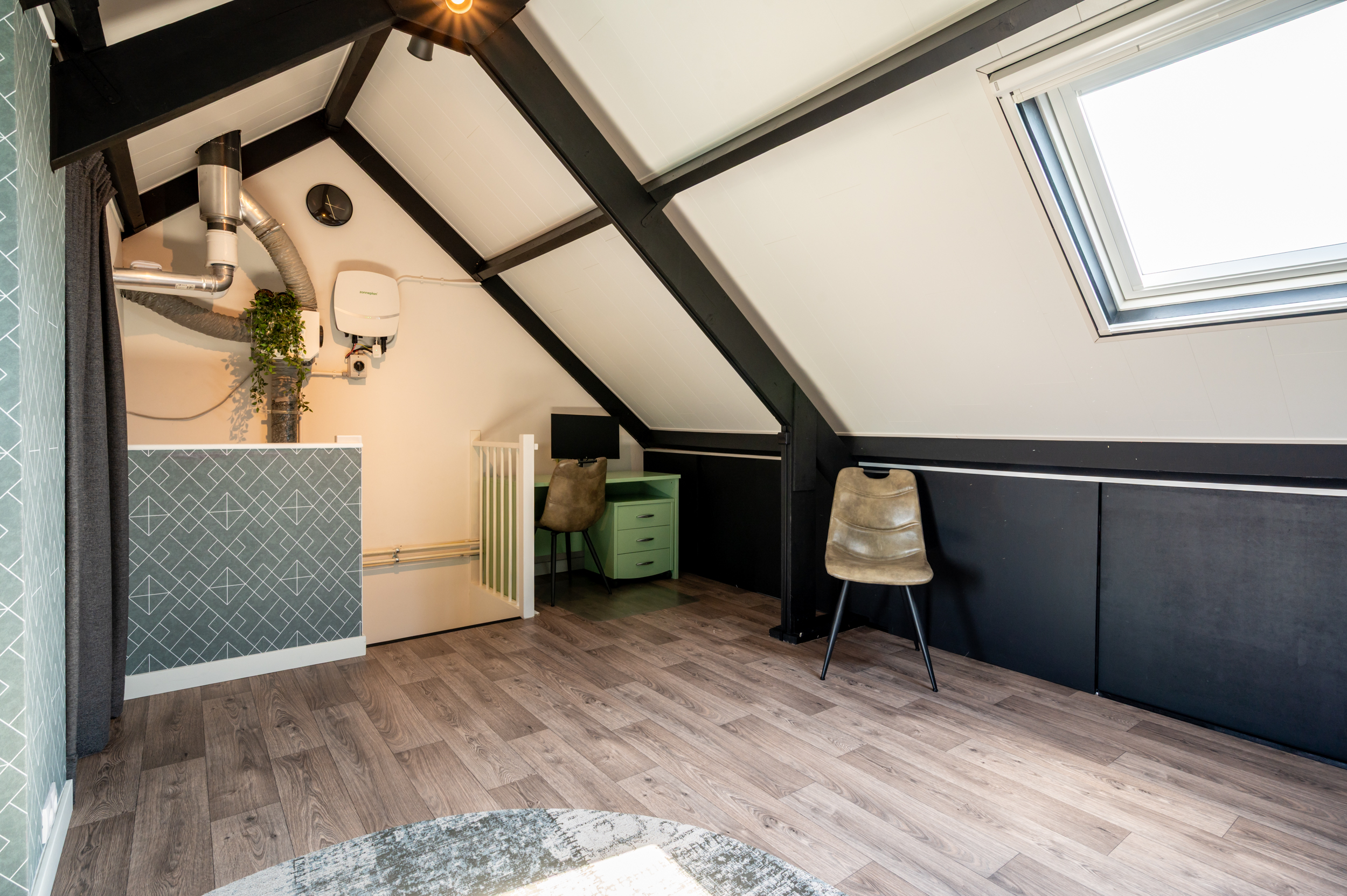 De vaste trap brengt je naar de royale en keurig afgewerkte zolder. Dankzij de dakopbouw is dit een volwaardige verdieping geworden en momenteel in gebruik als vierde slaapkamer en kantoor. Verder is er volop bergruimte achter de knieschotten en tref je hier de omvormer voor de zonnepanelen en de mechanische ventilatie. In de aparte afgesloten ruimte staan de cv-installatie en de wasmachine-aansluiting, zelfs hier is een dakraam aanwezig.