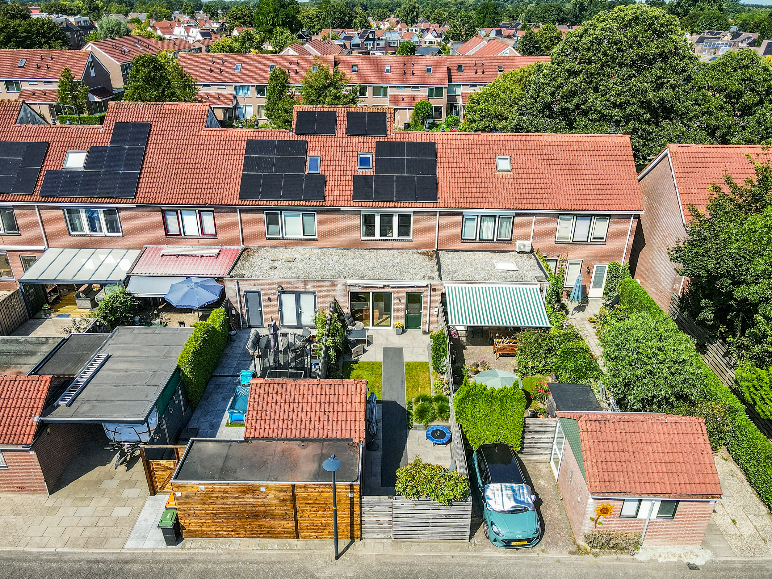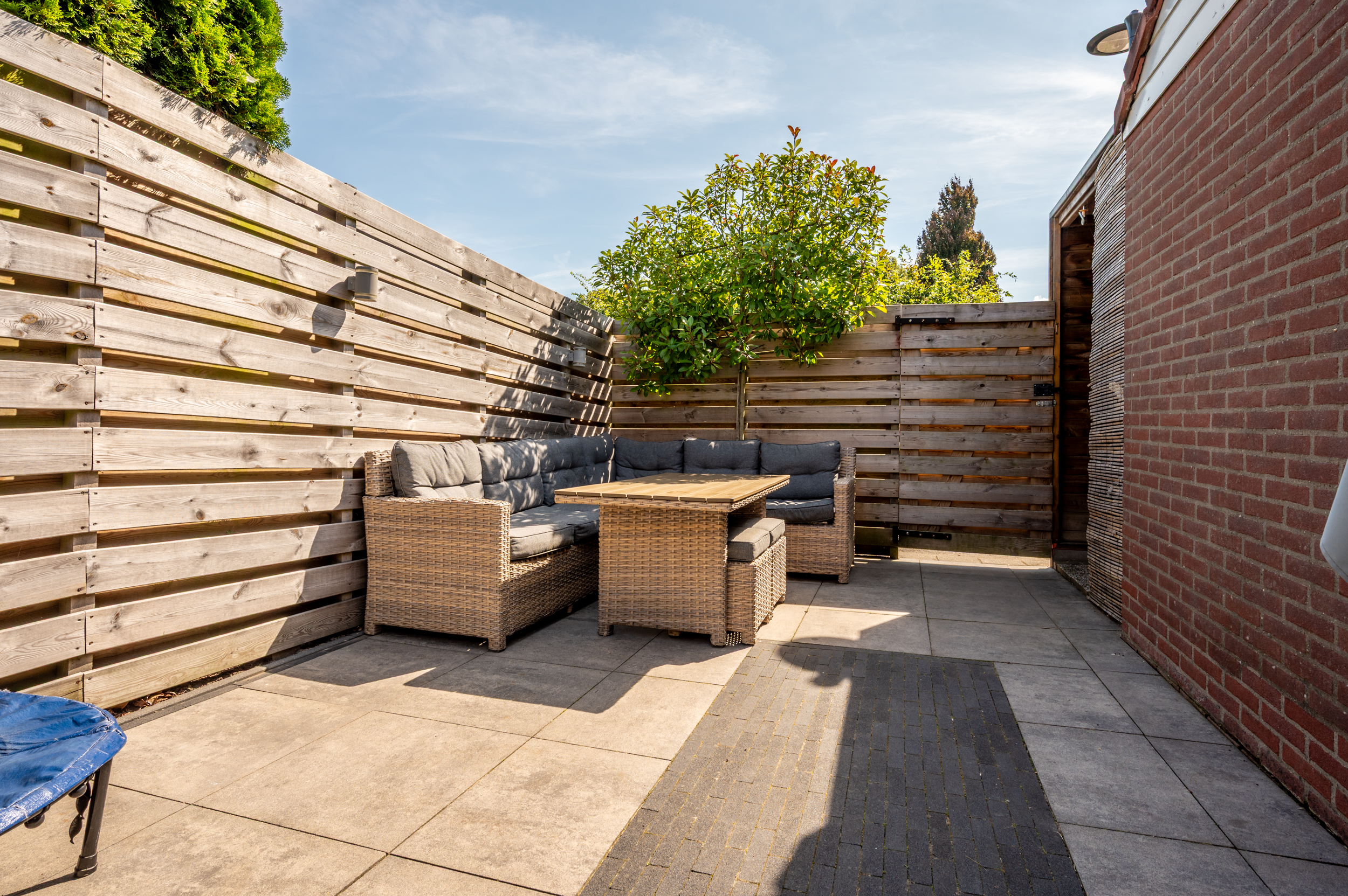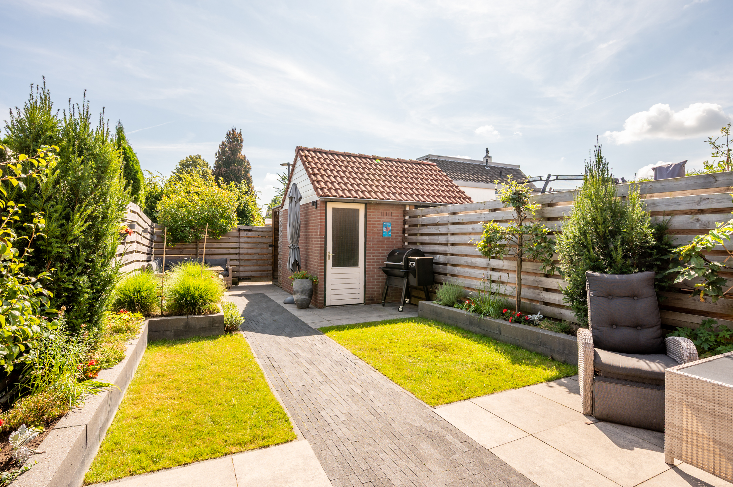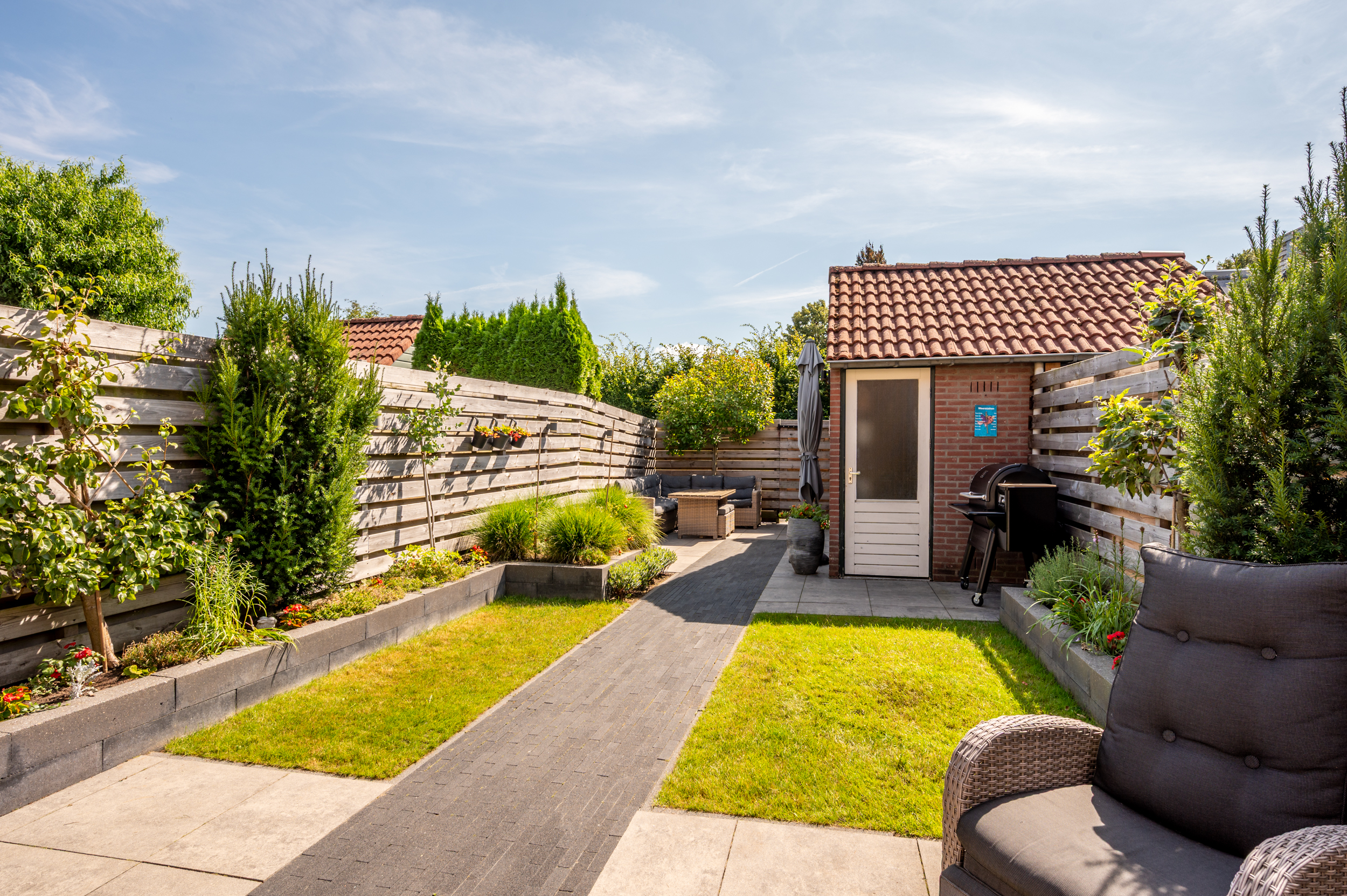 De tuin is netjes onderhouden en biedt terrassen aan zowel de voor- als achterzijde. Zo kies je zelf of je liever in de zon of in de schaduw zit. Verder is de tuin aangelegd met vaste beplanting, gras en bestrating. Achterin staat een ruime berging met overkapping, ideaal om bijvoorbeeld de containers uit het zicht te plaatsen. Via de achterom kom je op de parkeerplaats terecht waar je gemakkelijk je auto parkeert.