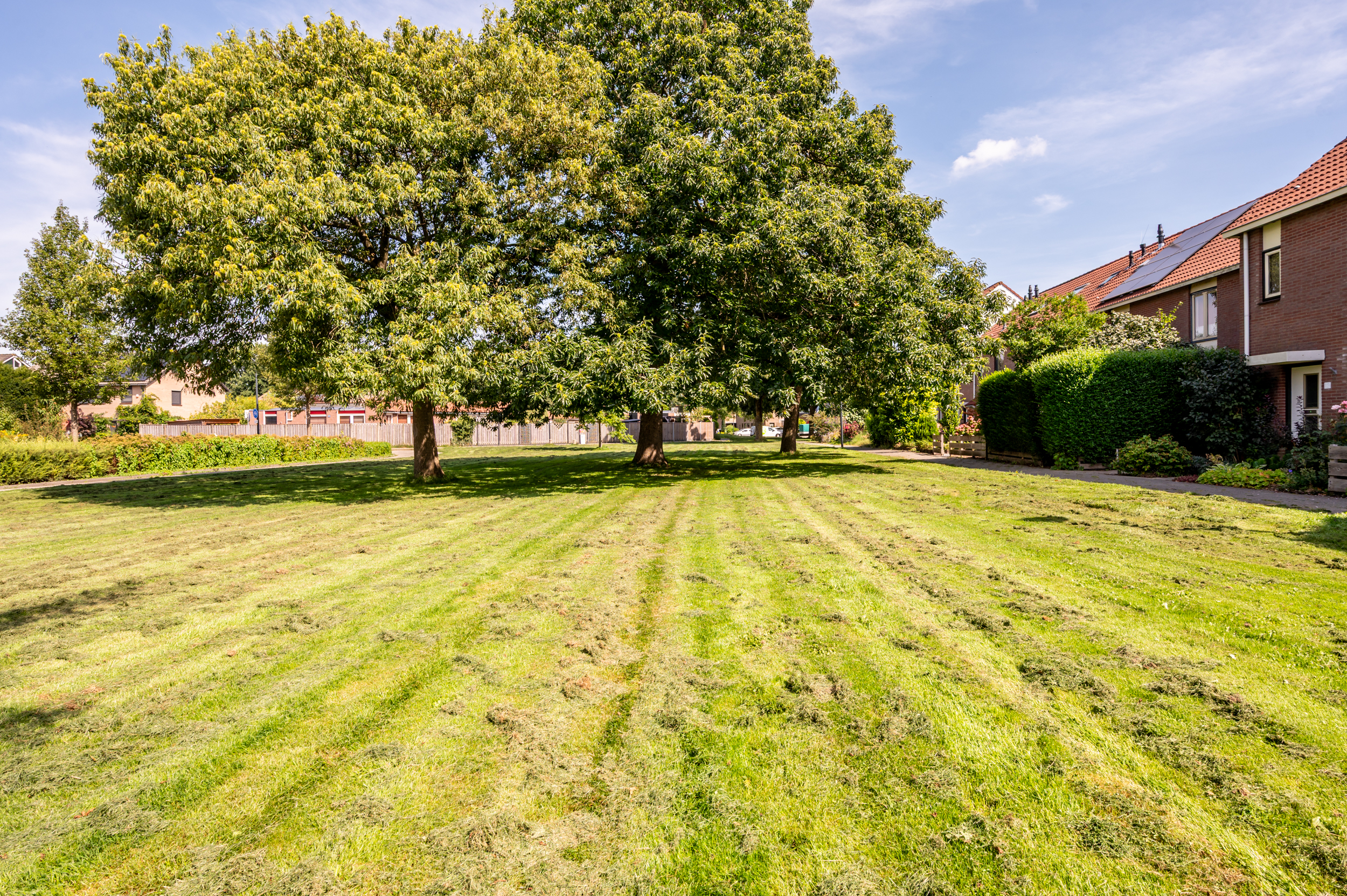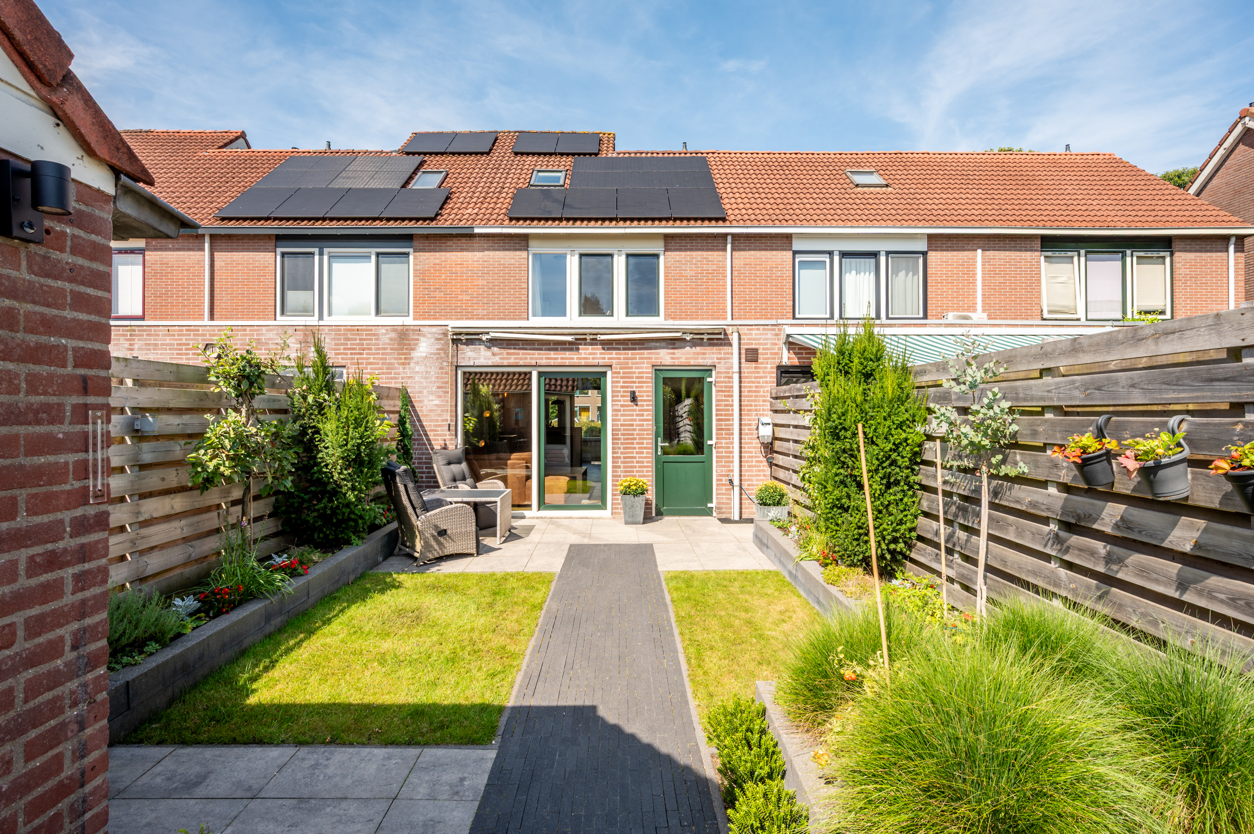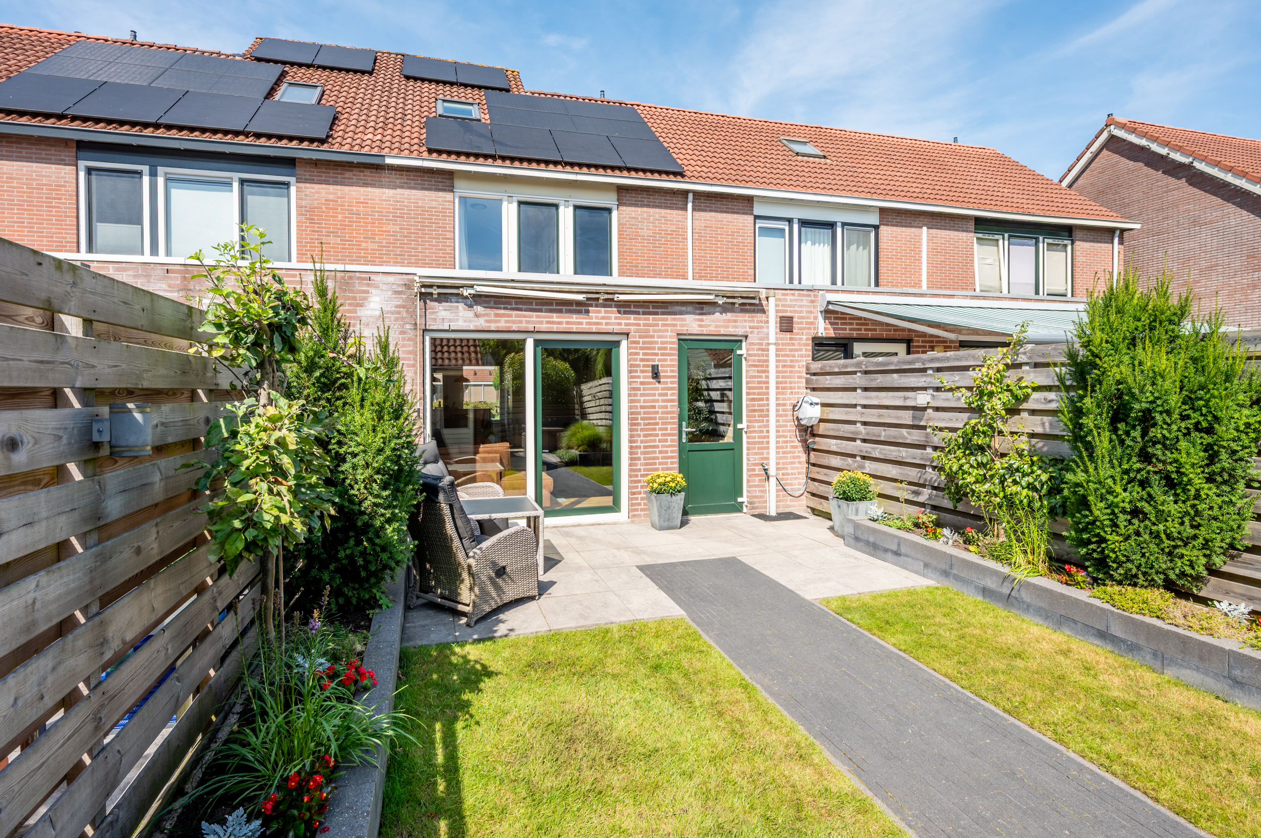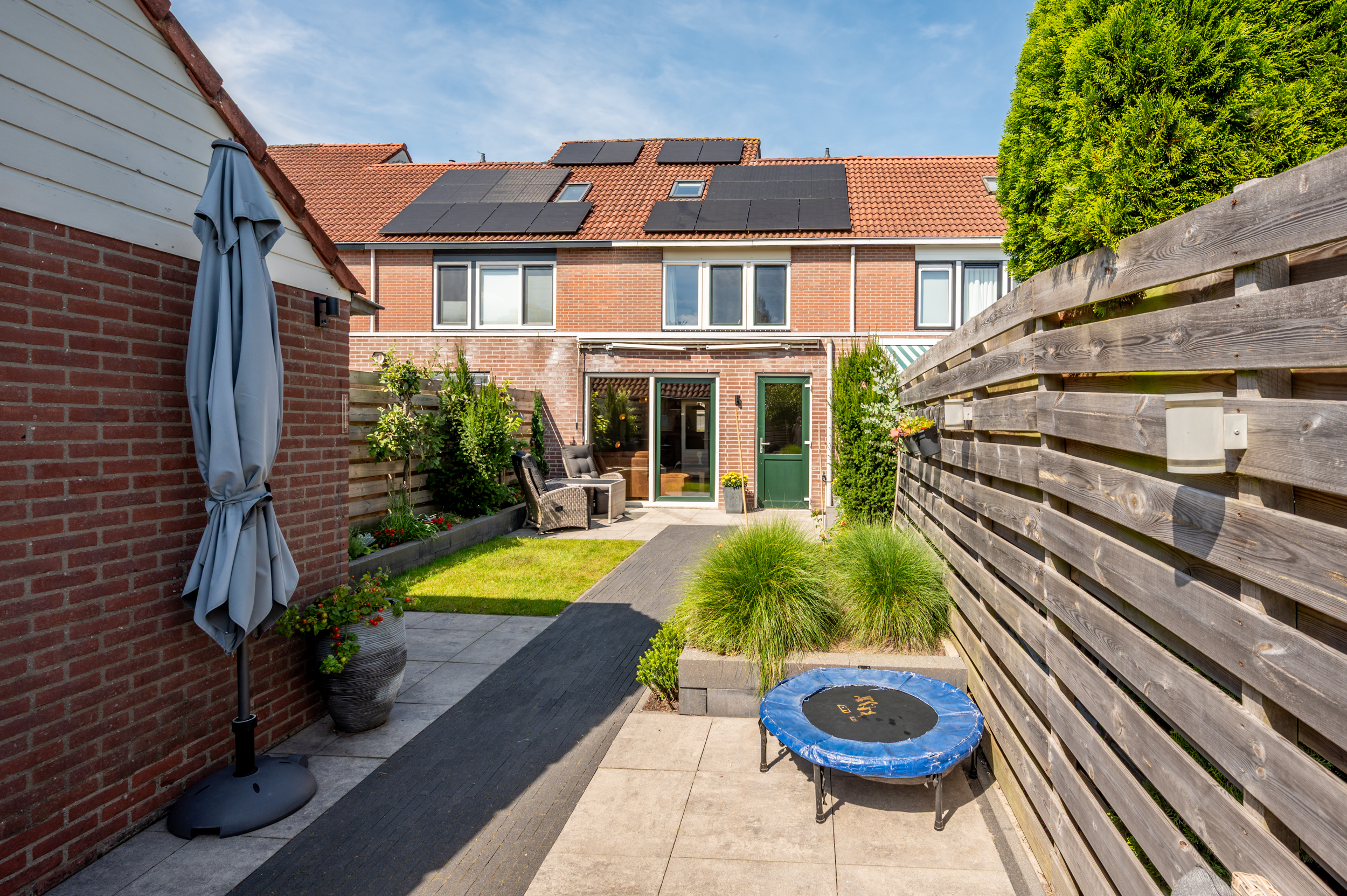 De tuin is netjes onderhouden en biedt terrassen aan zowel de voor- als achterzijde. Zo kies je zelf of je liever in de zon of in de schaduw zit. Verder is de tuin aangelegd met vaste beplanting, gras en bestrating. Achterin staat een ruime berging met overkapping, ideaal om bijvoorbeeld de containers uit het zicht te plaatsen. Via de achterom kom je op de parkeerplaats terecht waar je gemakkelijk je auto parkeert.