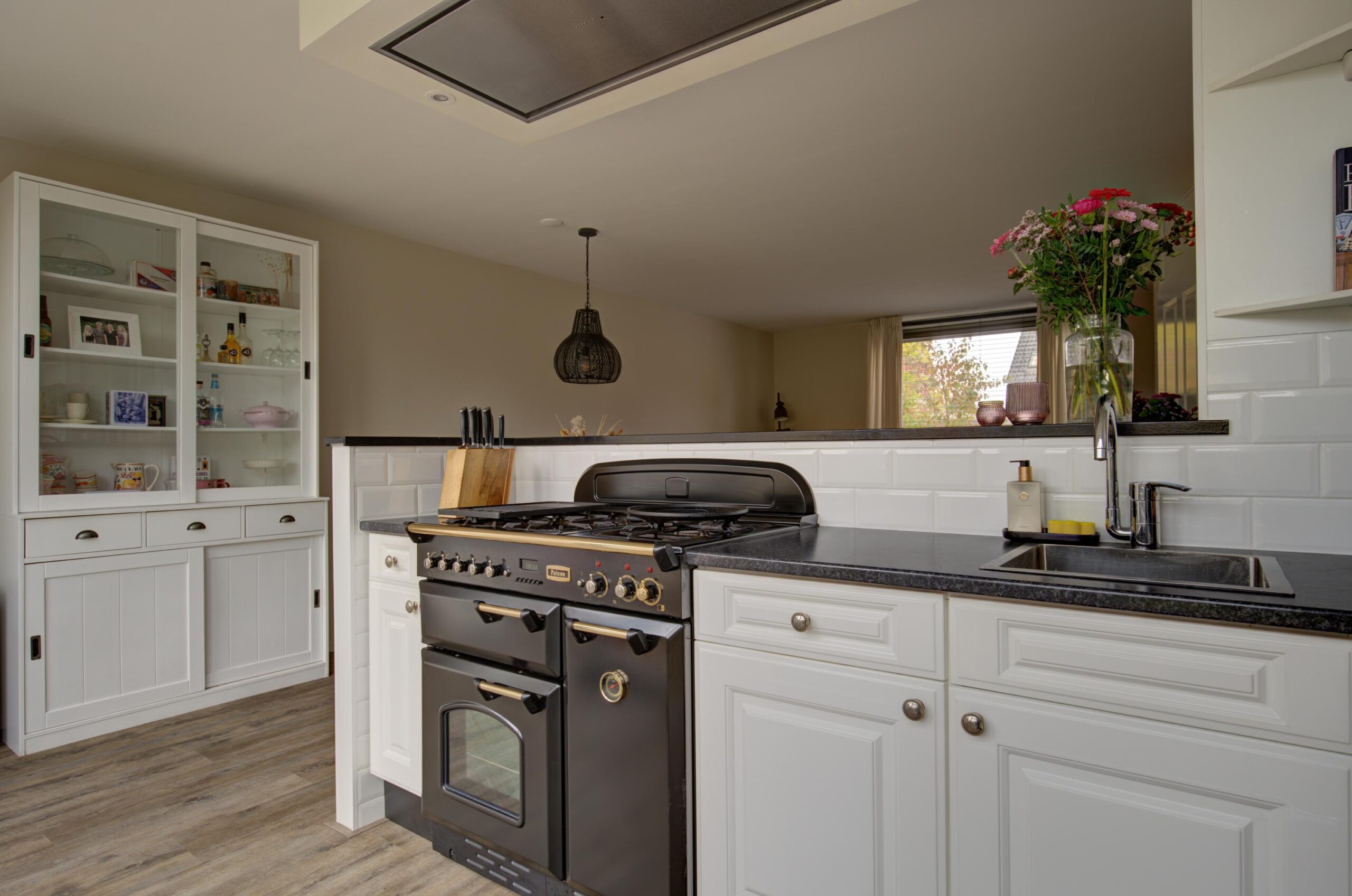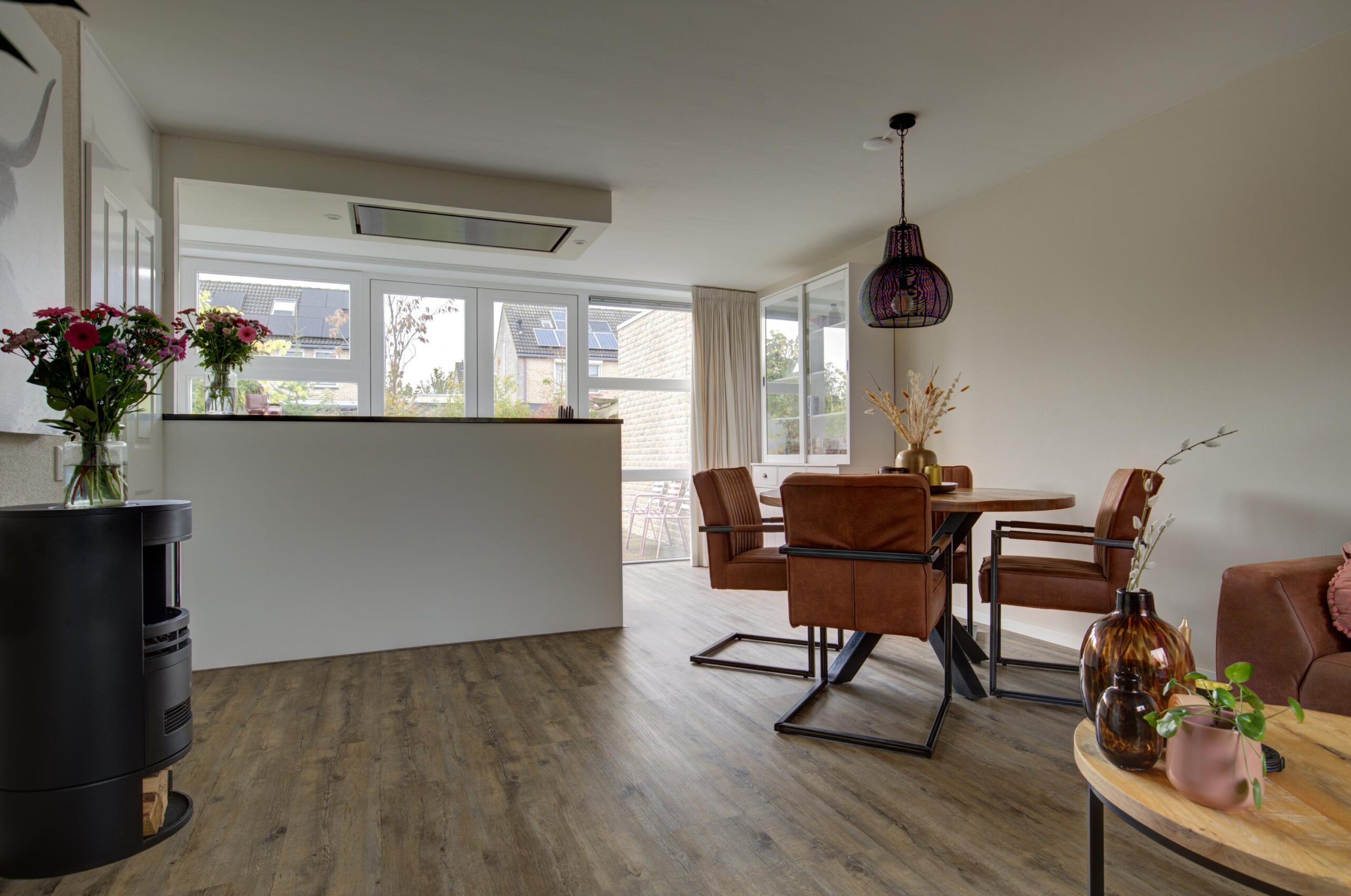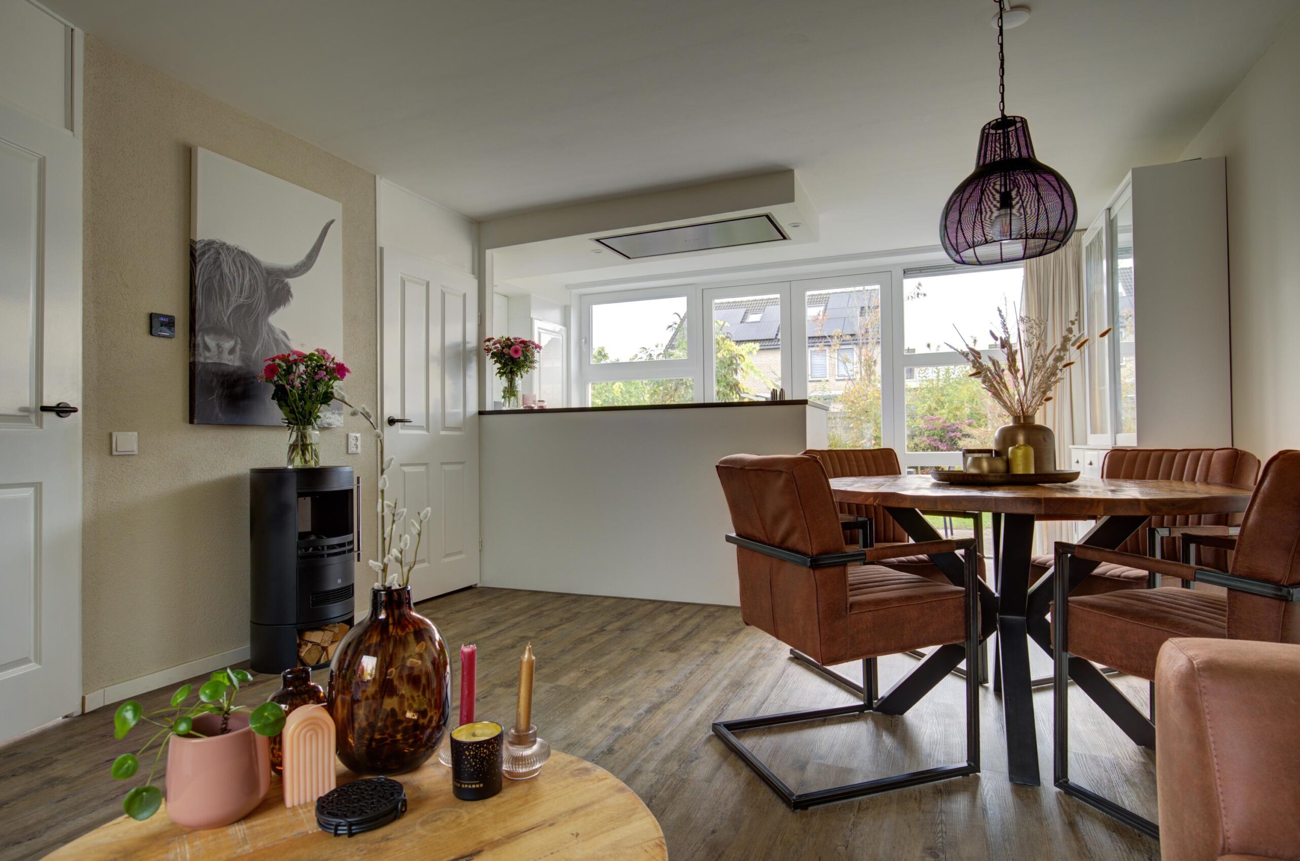 Stap de sfeervolle woonkamer binnen met strak afgewerkte wanden, een stijlvolle pvc-vloer die doorloopt door de gehele woning, wat een fijne en rustige uitstraling geeft. Aan de straatzijde vind je de zithoek, die dankzij de diepe en groene voortuin zorgt voor veel privacy en een fijn uitzicht. In het midden van de woonkamer is ruimte genoeg voor een grote eettafel waar je gezellig kunt tafelen en in directe verbinding staat met de open, tuingerichte keuken. Wat een fantastische lichtinval heb je hier! De recent vernieuwde achterpui, met veel glas en voorzien van openslaande deuren, zorgt voor een prachtige verbinding met de tuin. De keuken is geplaatst in een L-opstelling en ingericht met een koel-vriescombinatie, een spoelbak, een vaatwasser, in plafond ingebouwde afzuiging en een luxe gasfornuis met maar liefst 3 ovens; ideaal als je graag kookt voor een groot gezelschap. Verder is er nog een handige trapkast voor extra bergruimte.