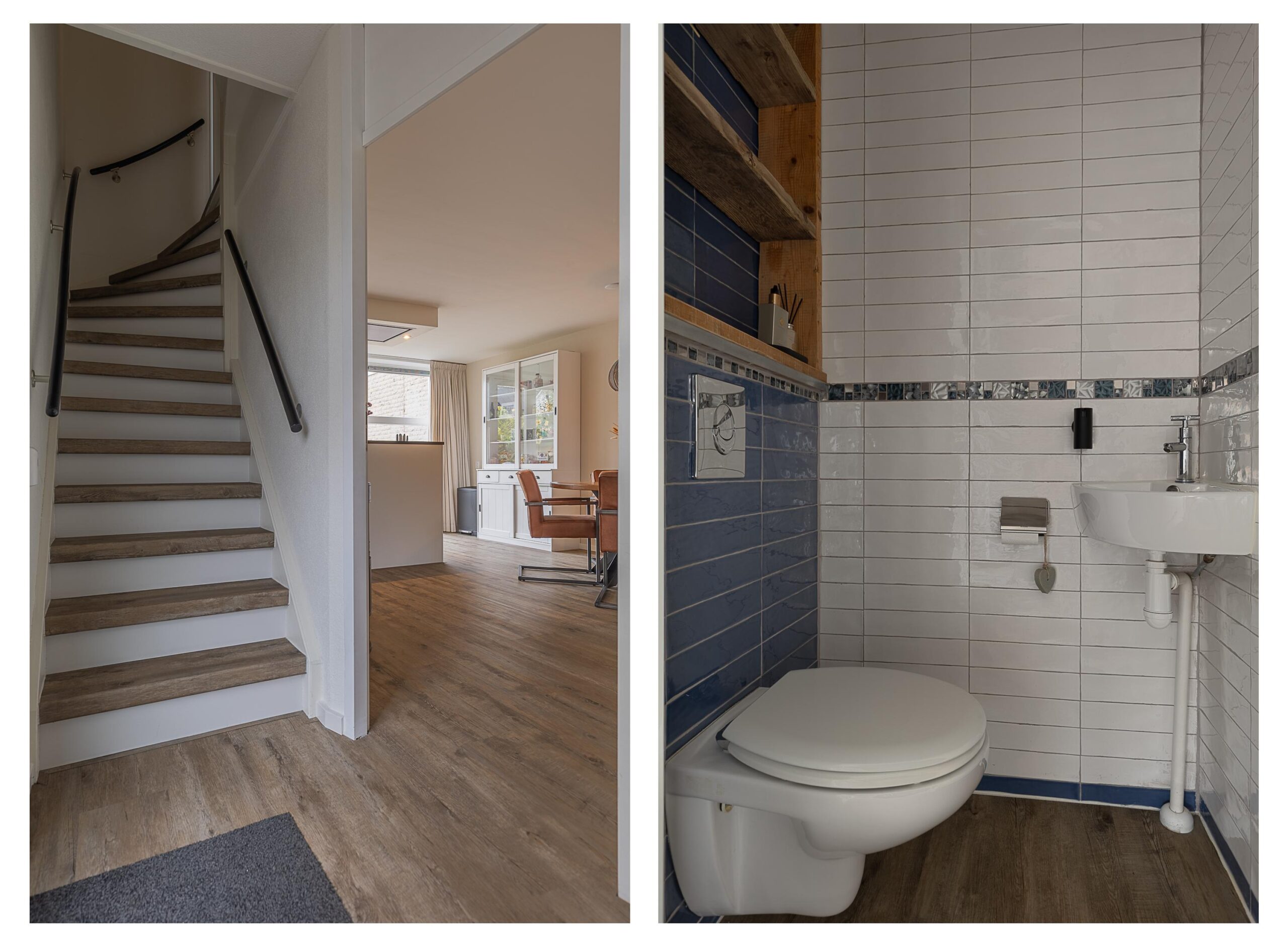 Bij binnenkomst in de hal tref je de meterkast, de trapopgang, de toegang tot de woonkamer en de toiletruimte. De toiletruimte is volledig betegeld in een mix van blauwe en witte kleuren en voorzien van een pvc-vloer, een zwevend toilet, legplanken en een fonteintje.