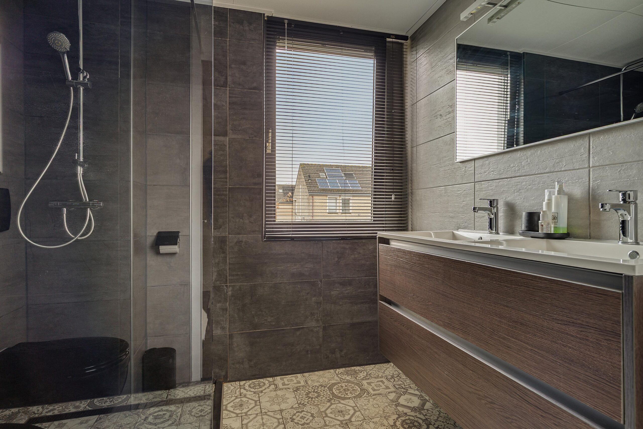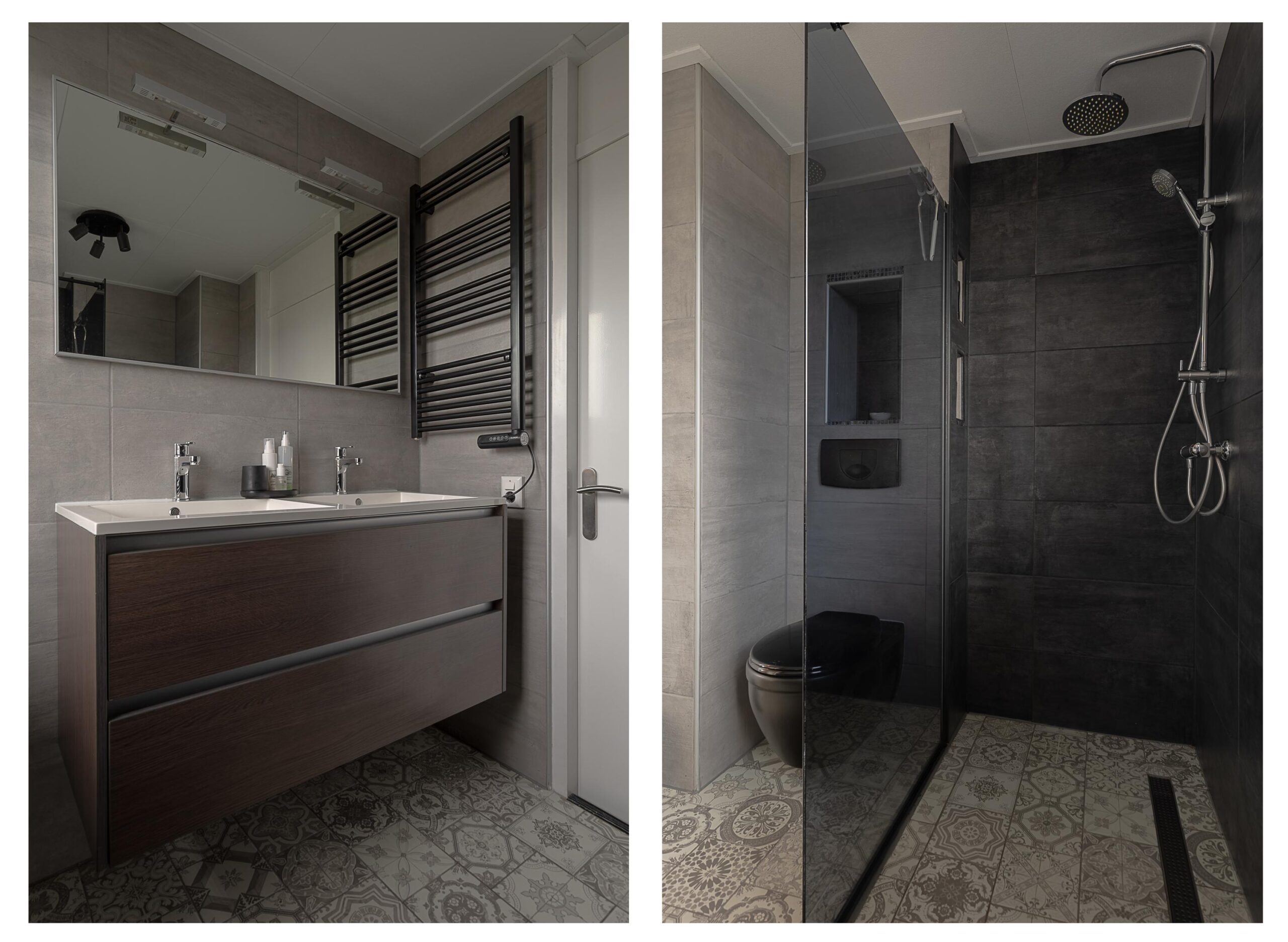 De badkamer is modern en stijlvol afgewerkt met lichte en donkere antracietkleurige tegels en op de vloer prachtige Portugese tegels. Verder beschikt de badkamer over een wastafelmeubel met dubbele waskom, een designradiator, een zwevend toilet en een inloopdouche met regen- en handdouche.