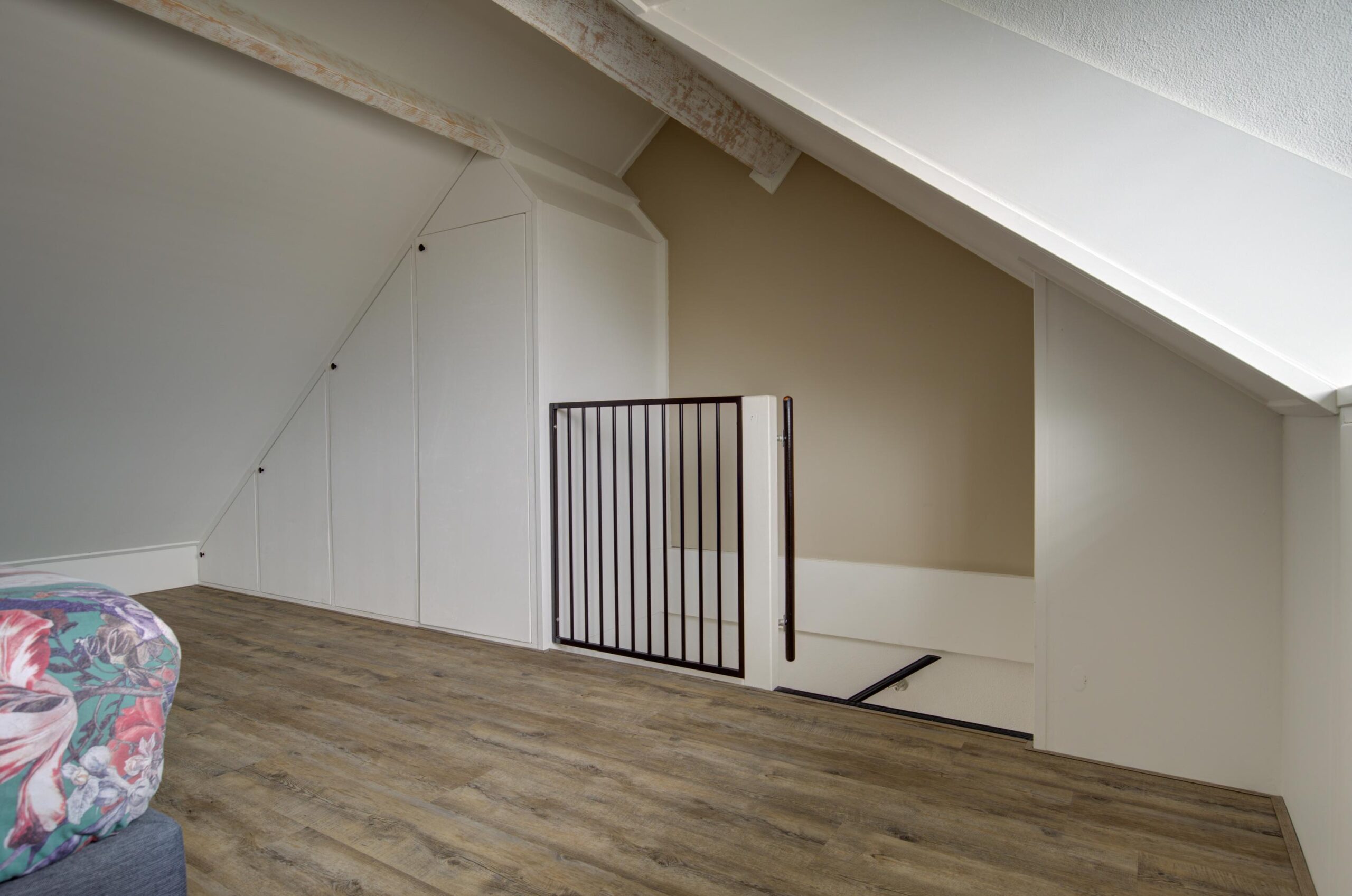 Via een vaste trap, ook deze is keurig afgewerkt met pvc, kom je op de ruime zolder. Het eerste wat opvalt is de hoeveelheid licht dankzij de dakkapel. Dit maakt de ruimte niet alleen licht, maar ook extra ruim.