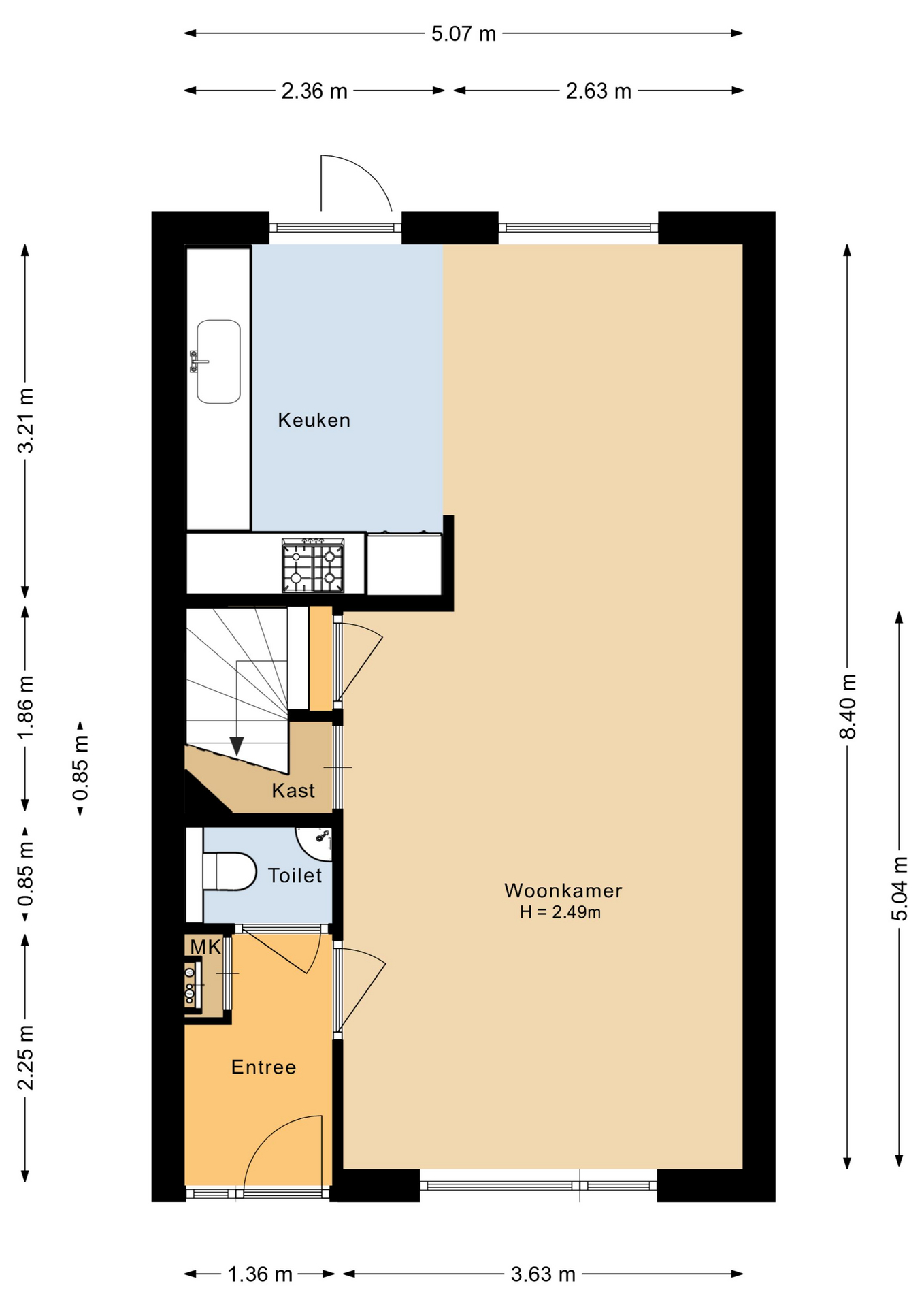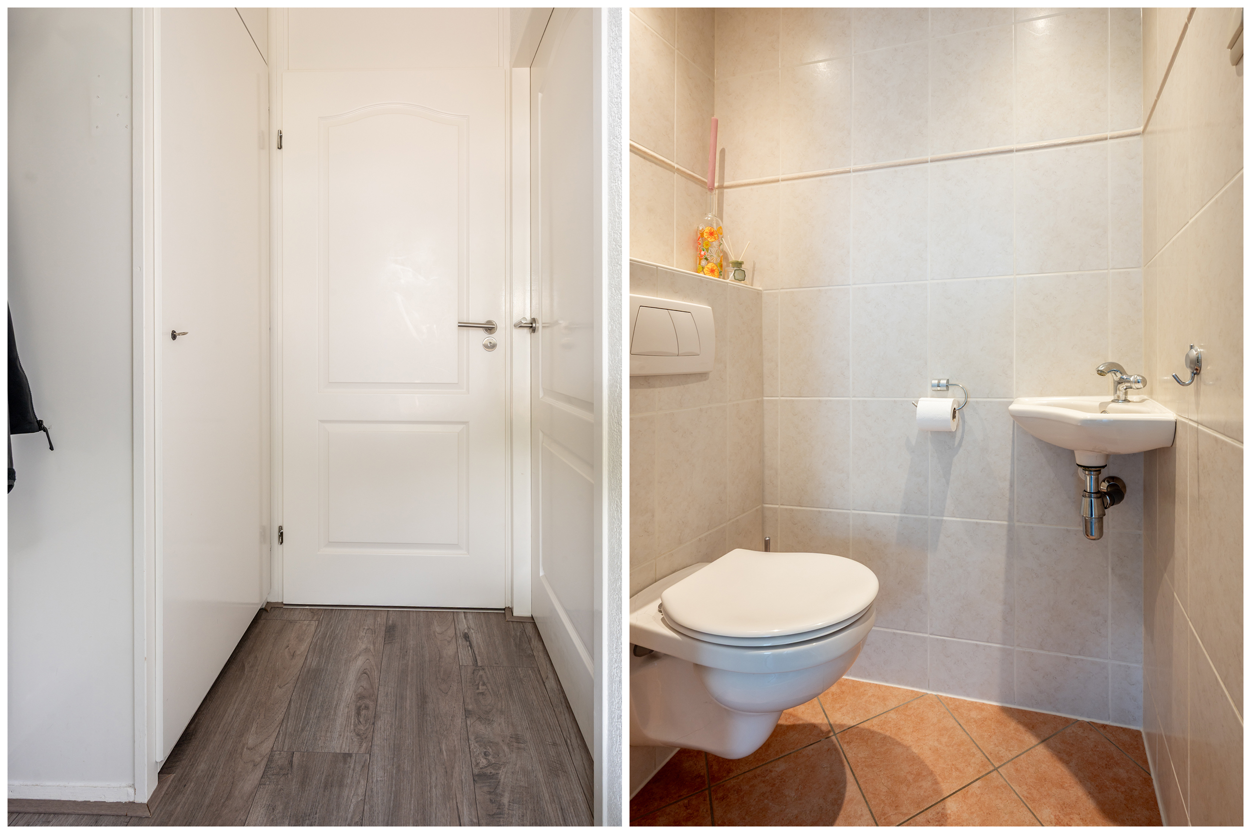 Je stapt binnen in de hal, waar je de garderobe, meterkast, toegang tot de woonkamer en de toiletruimte vindt. De toiletruimte is volledig betegeld en voorzien van een fonteintje en zwevend toilet. De laminaatvloer in de hal loopt door in de woonkamer, wat zorgt voor een rustige en nette uitstraling.