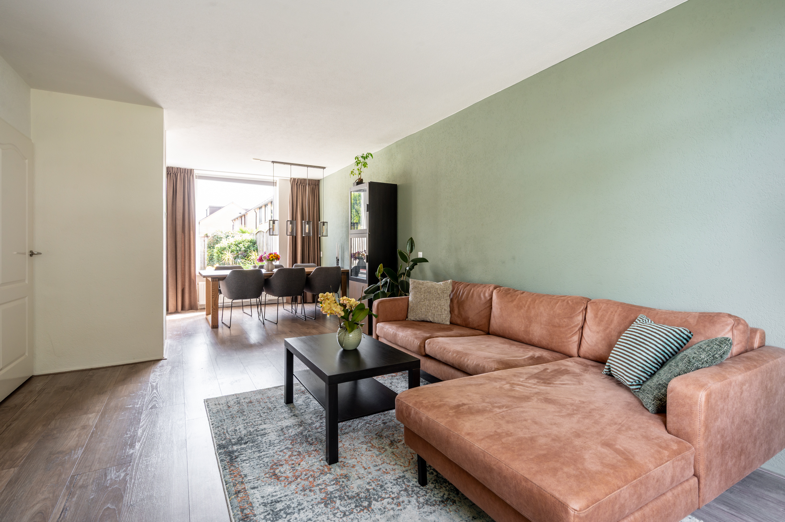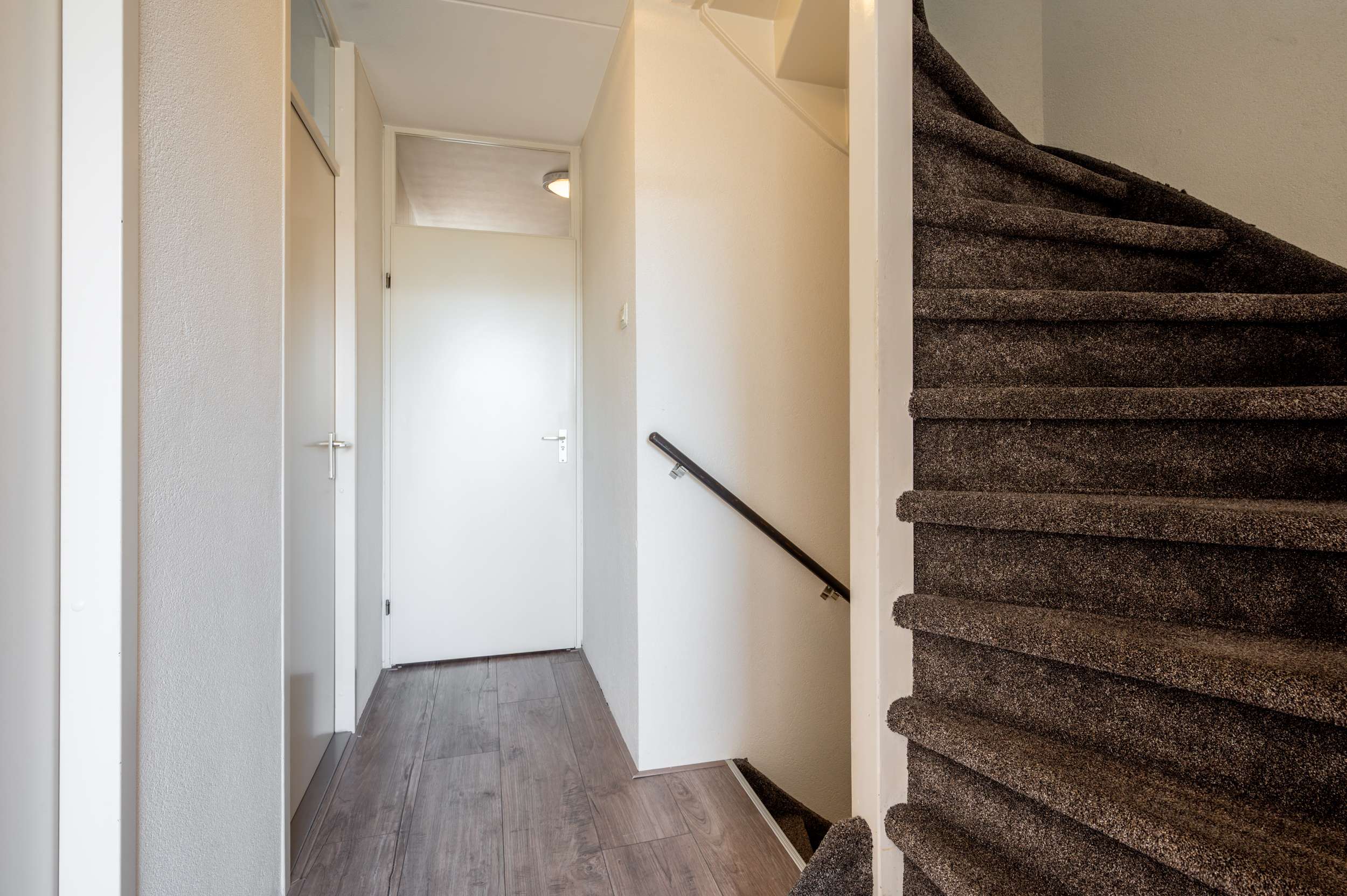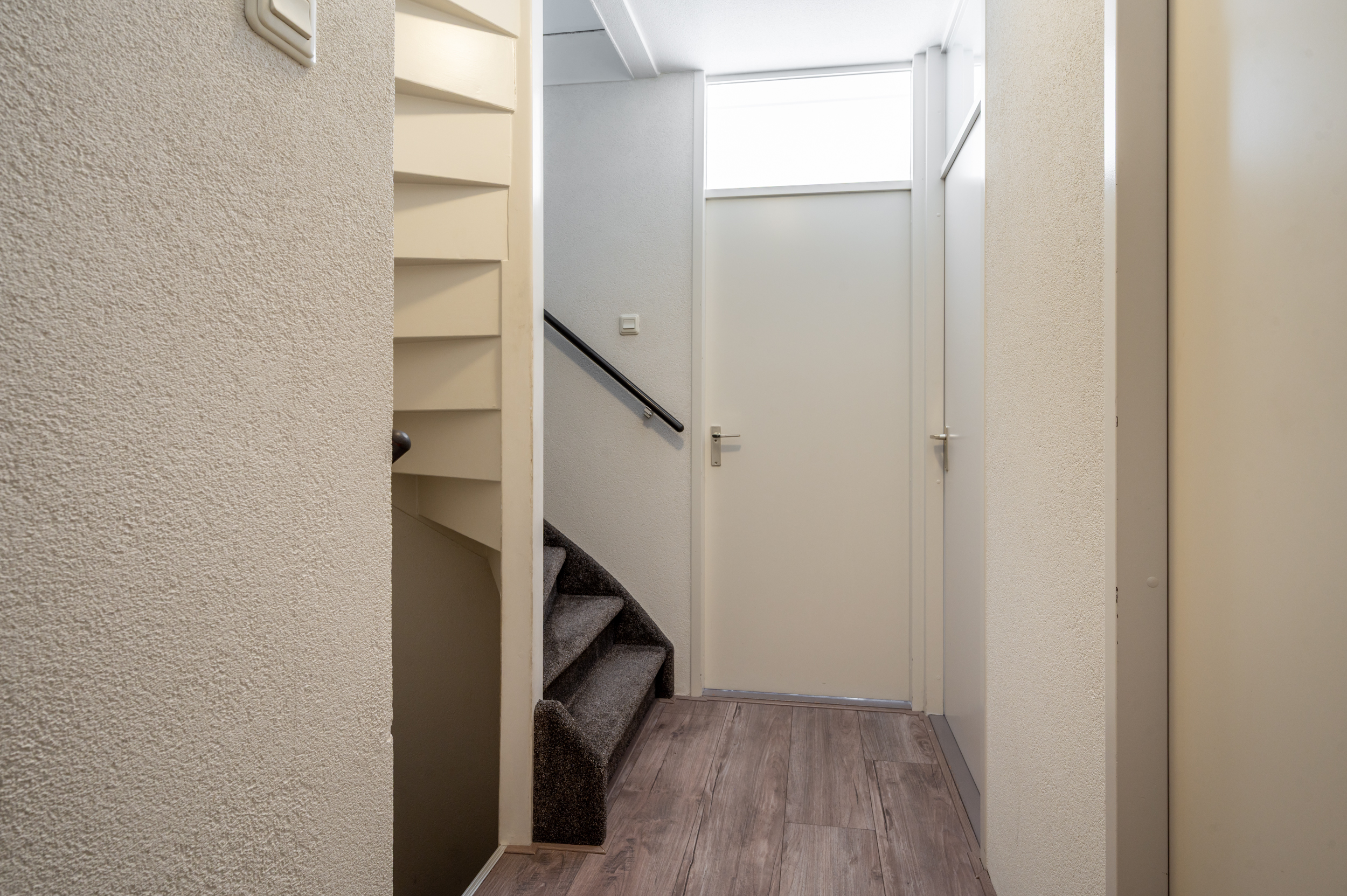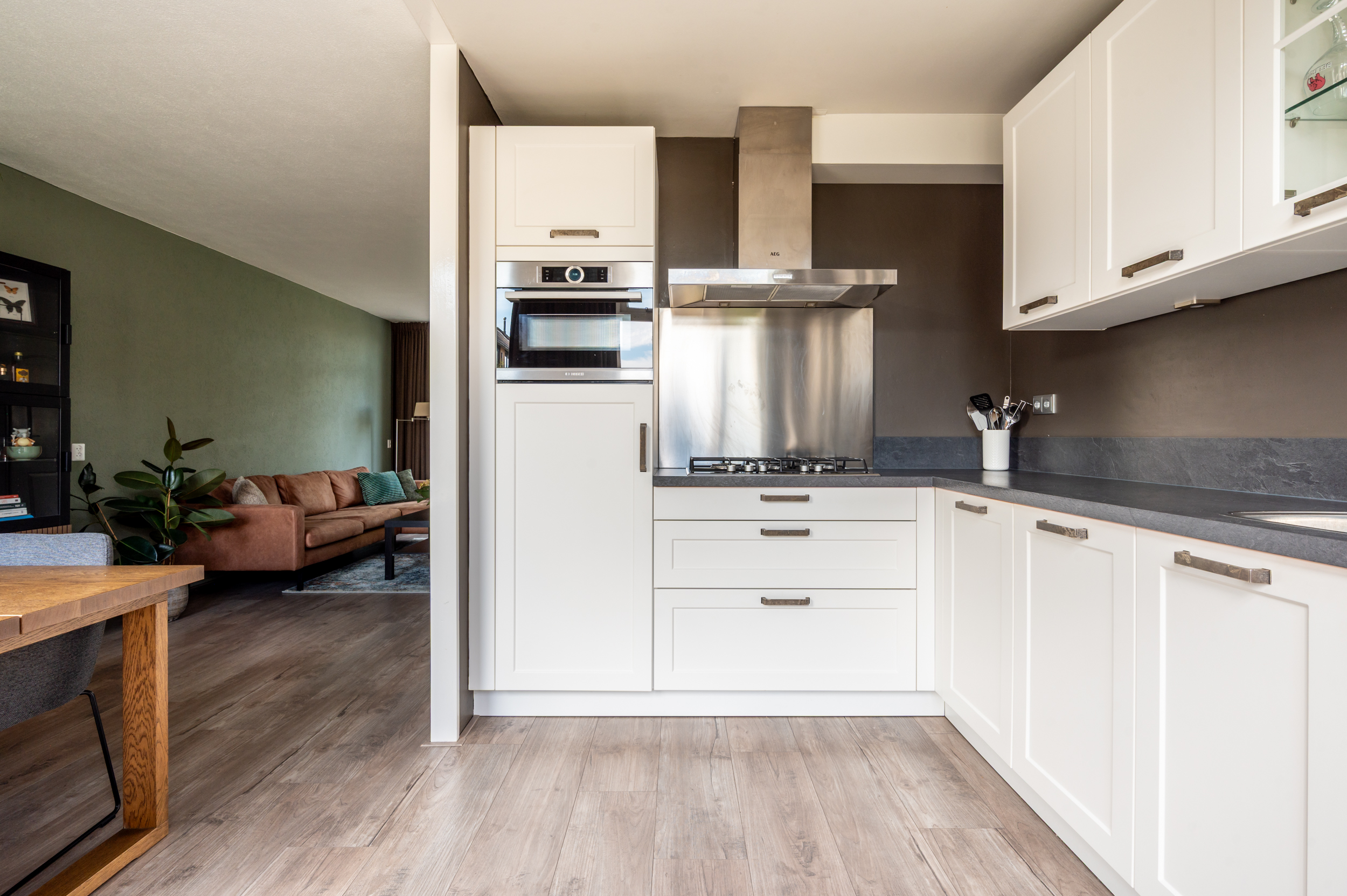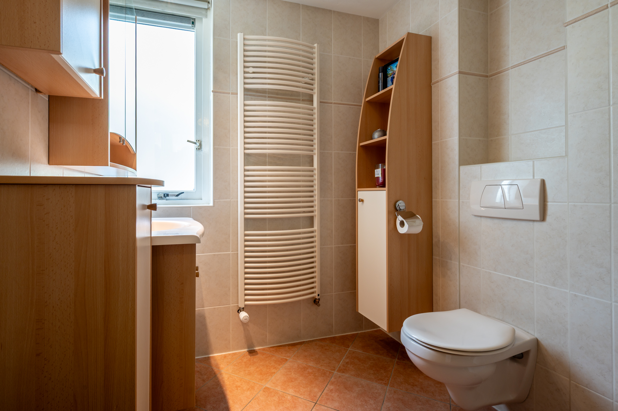 De zithoek is straatgericht en biedt dankzij de grote raampartij uitzicht op het openbaar groen. Vanuit de woonkamer is er toegang tot een handige trapkast, ideaal voor extra voorraad, schoonmaakspullen of de stofzuiger. Naast de trapkast bevindt zich de afgesloten trapopgang.