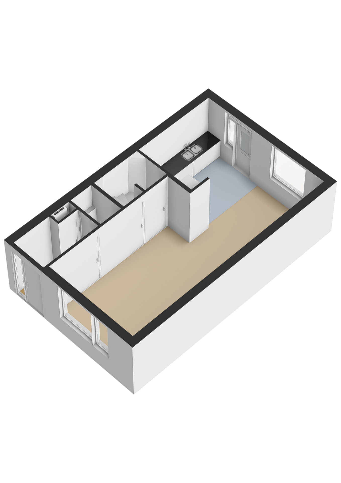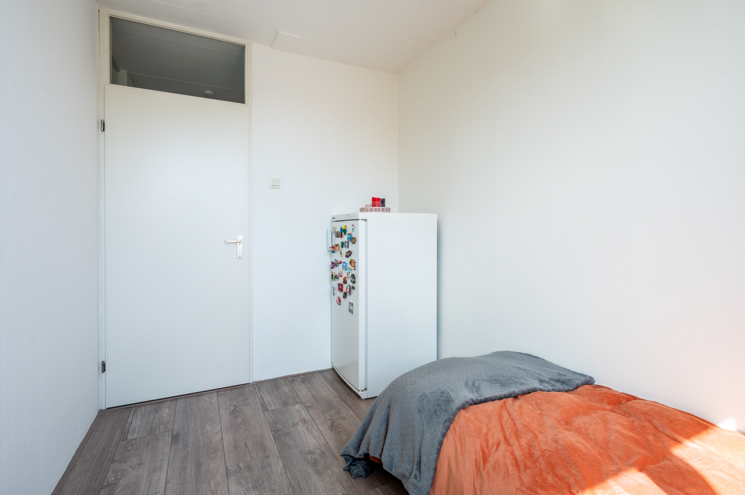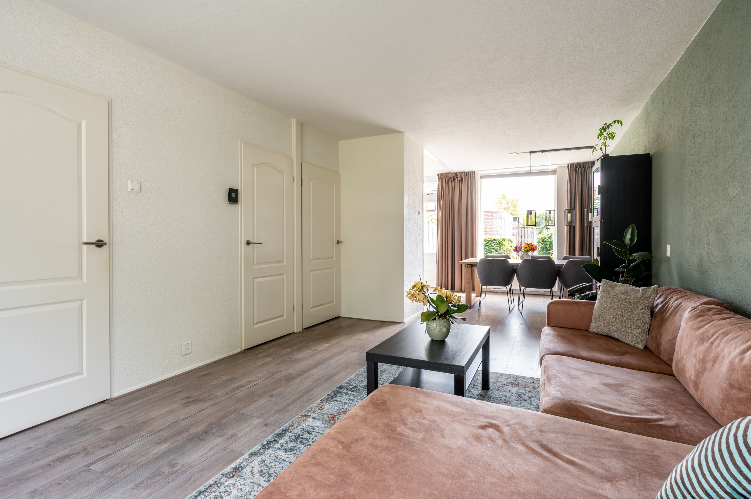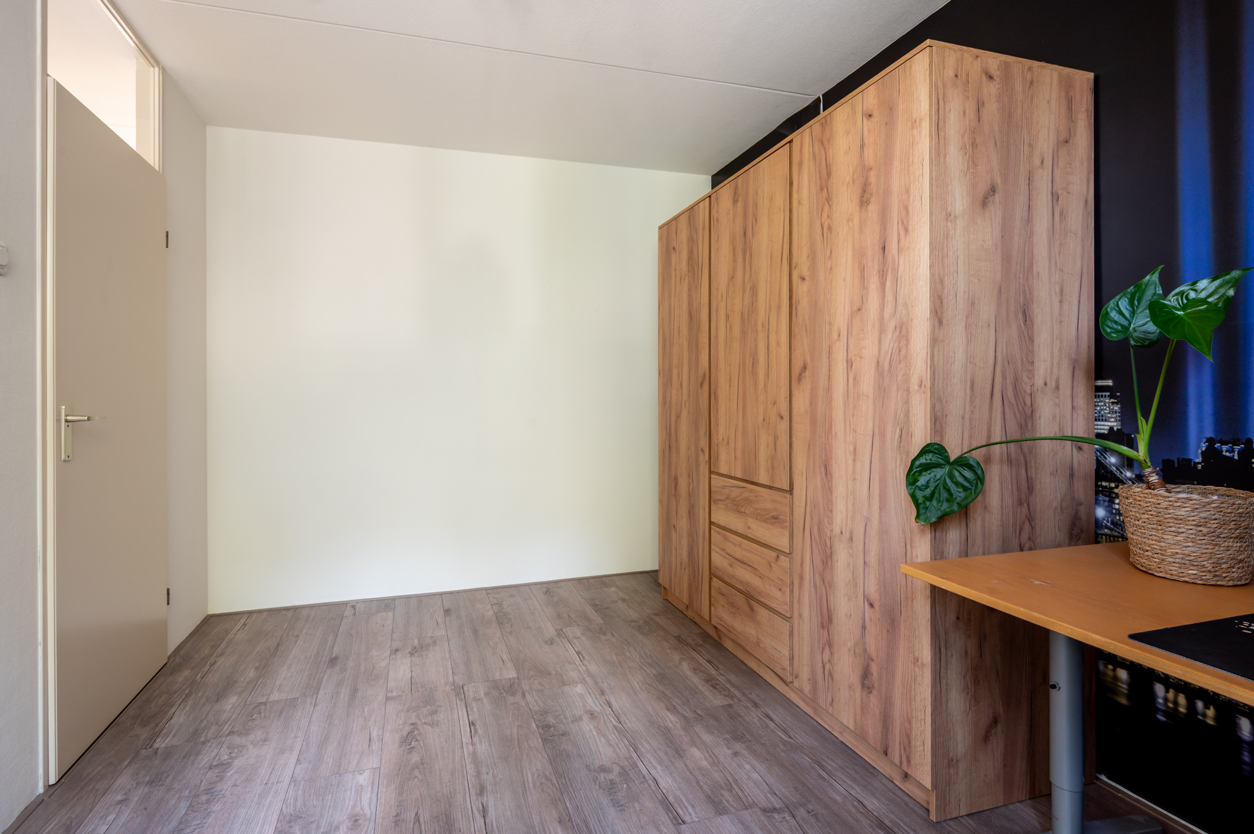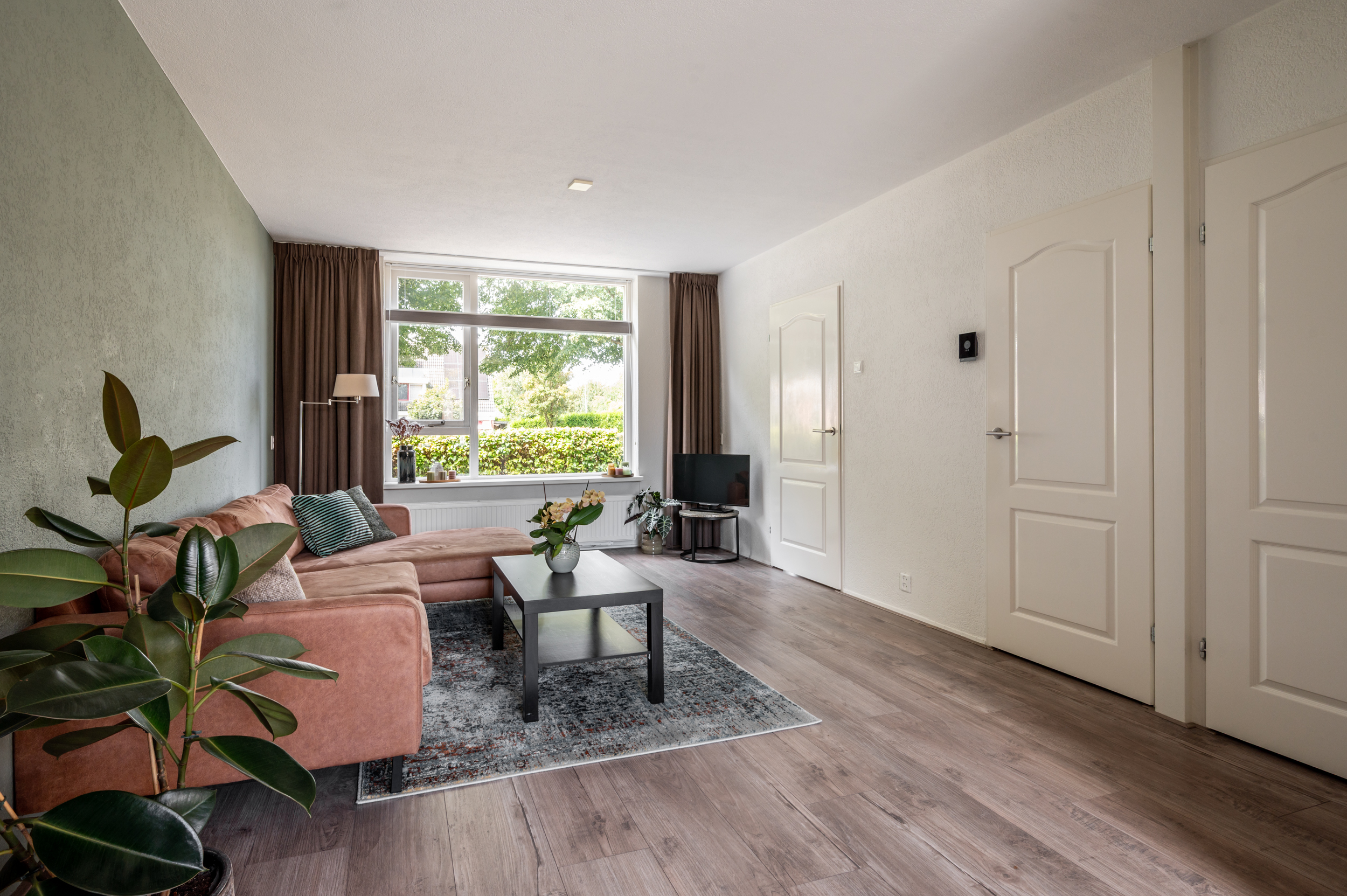 De zithoek is straatgericht en biedt dankzij de grote raampartij uitzicht op het openbaar groen. Vanuit de woonkamer is er toegang tot een handige trapkast, ideaal voor extra voorraad, schoonmaakspullen of de stofzuiger. Naast de trapkast bevindt zich de afgesloten trapopgang.