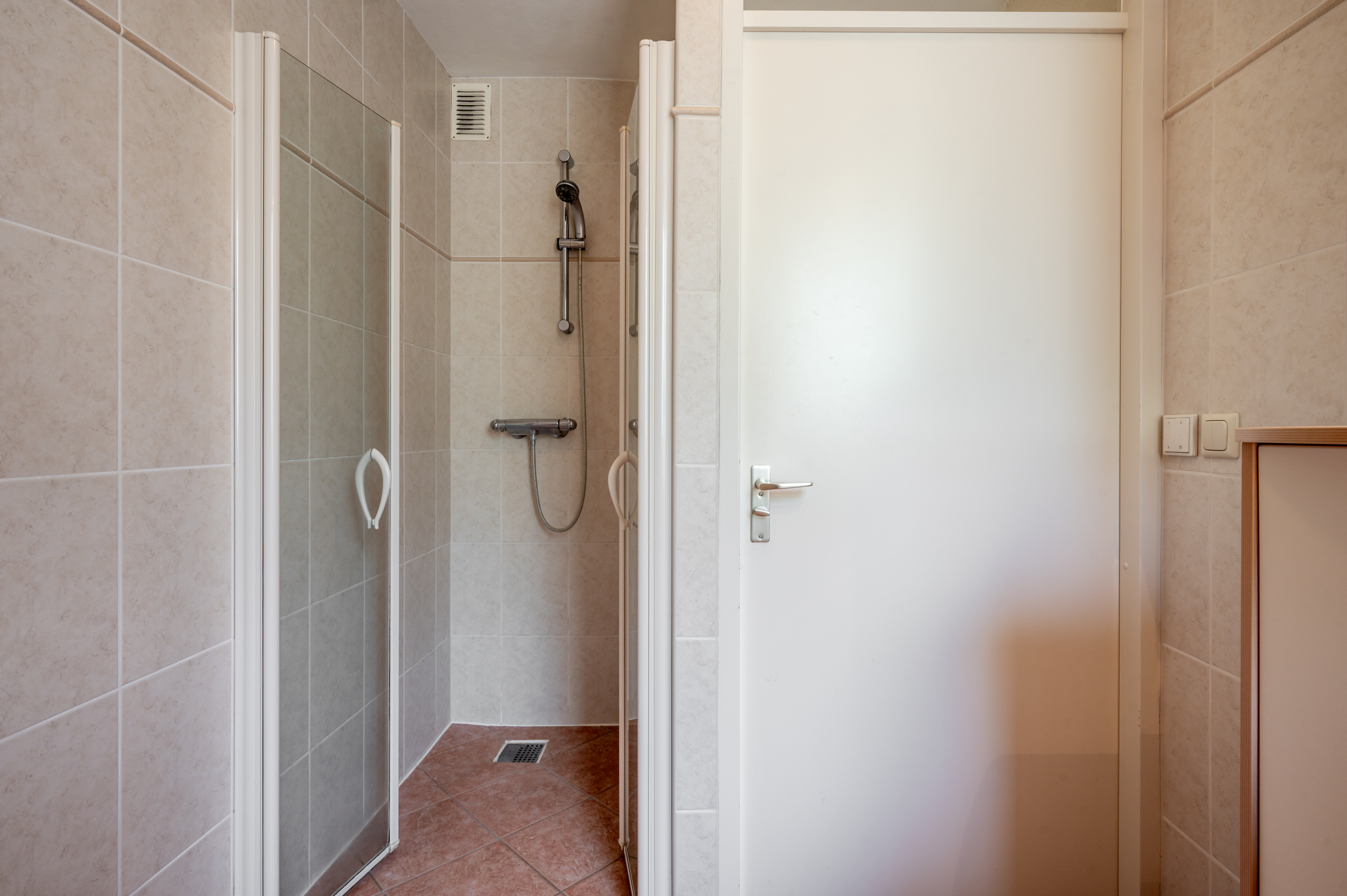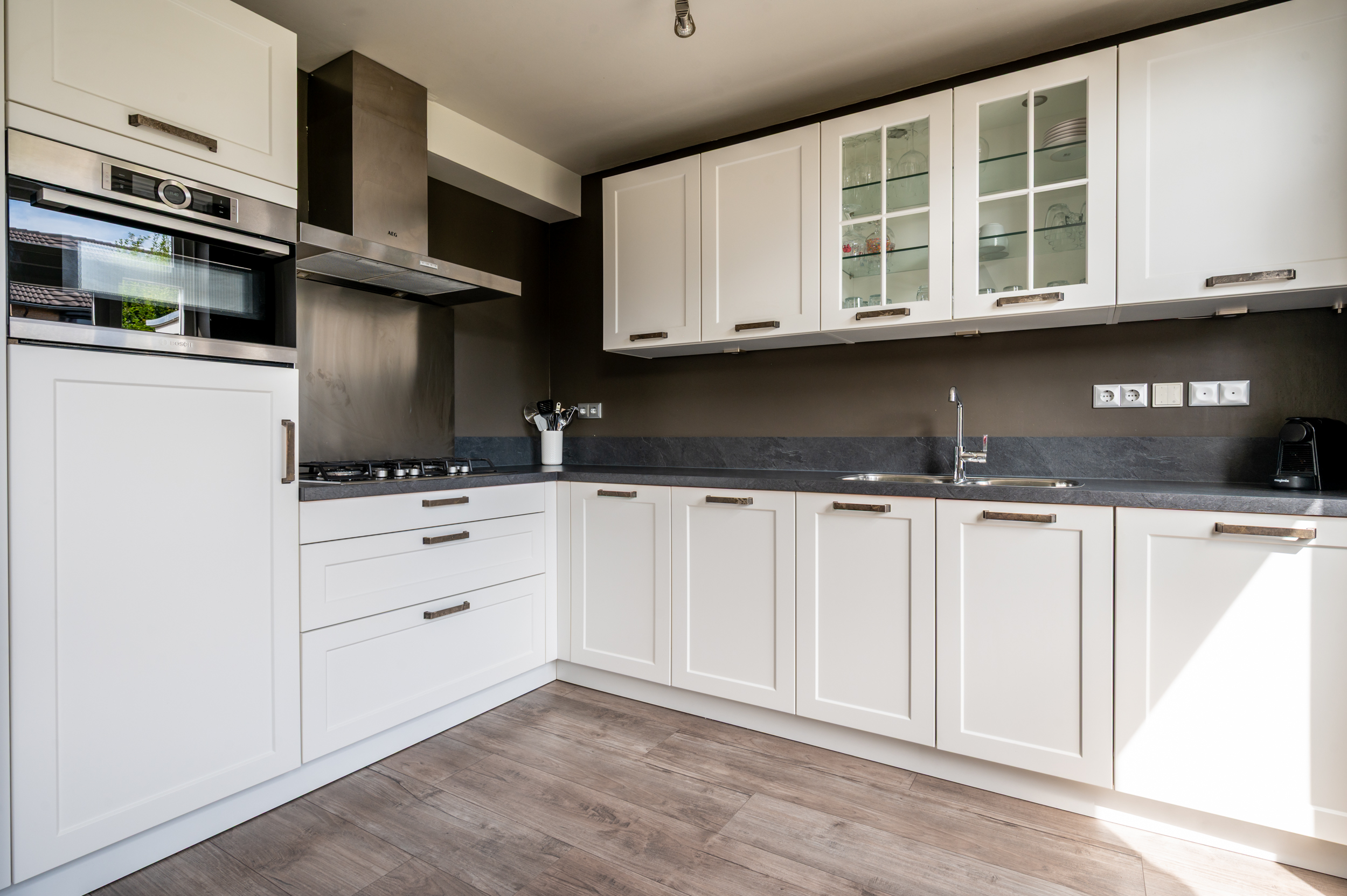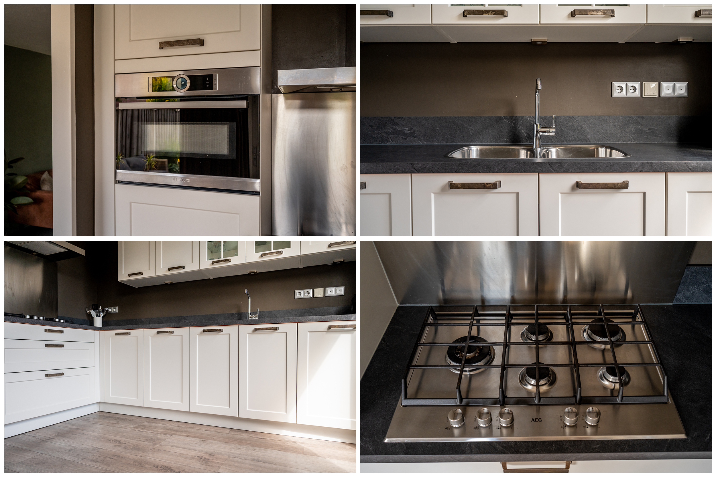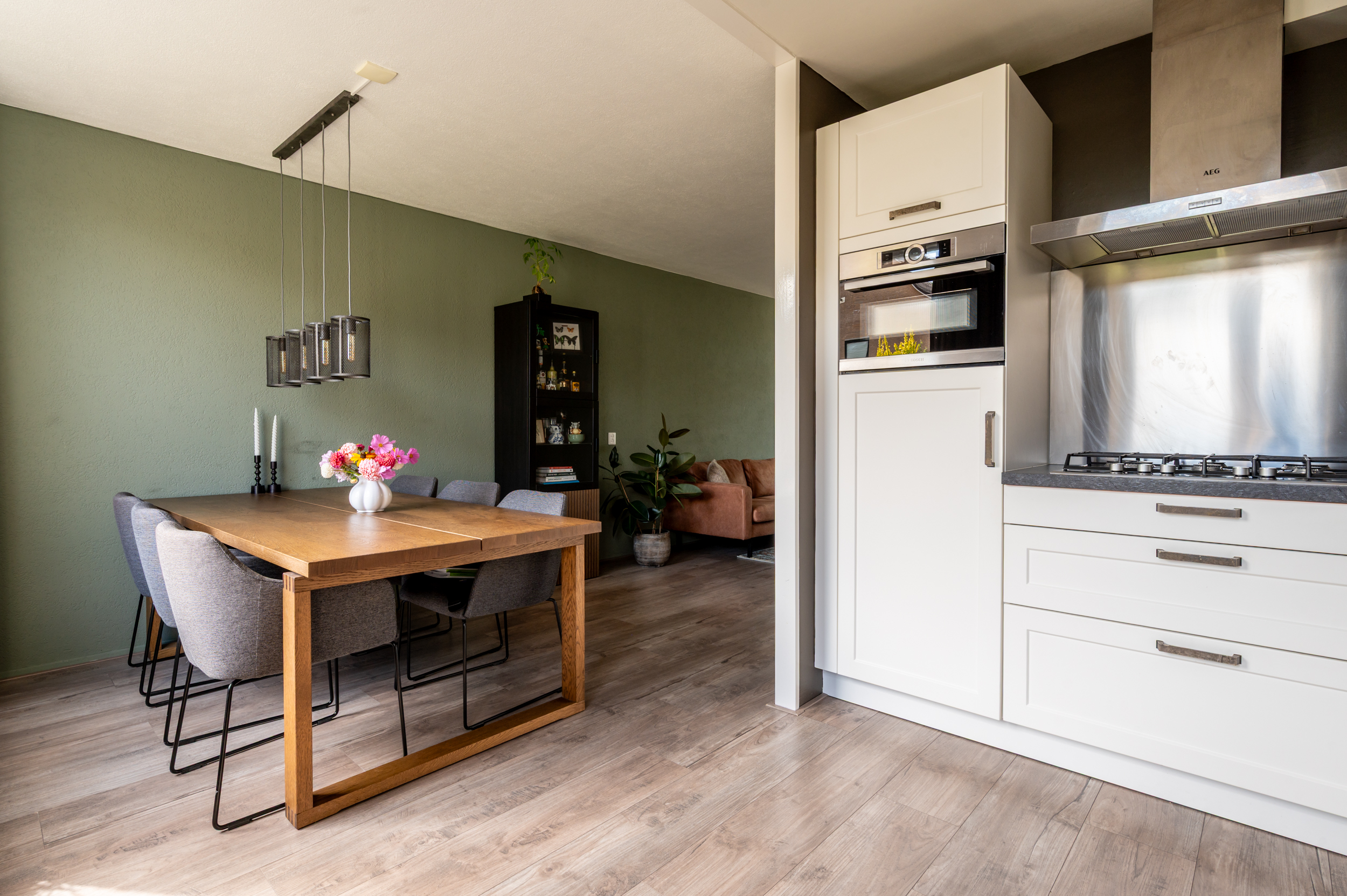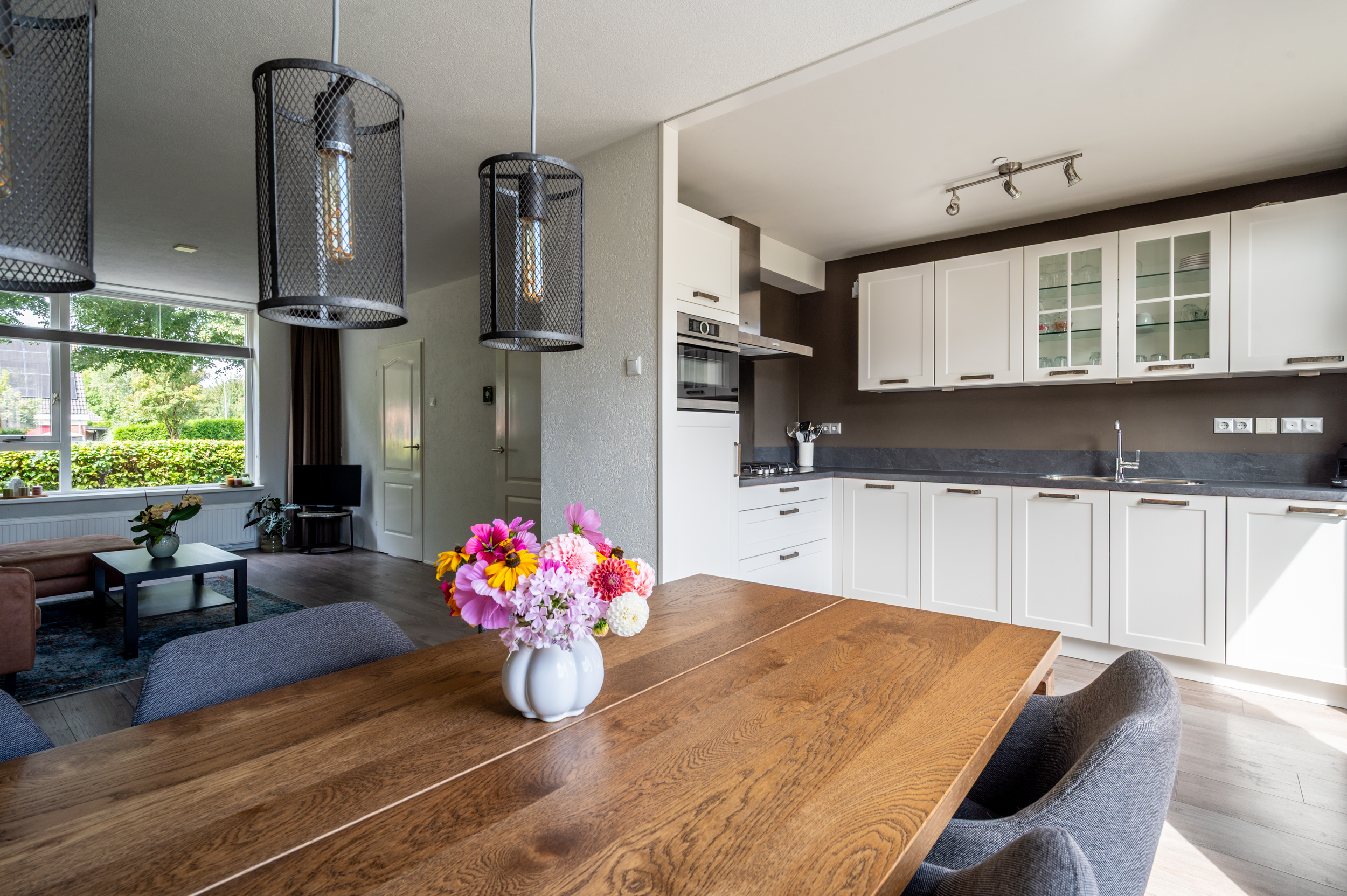 De eethoek ligt tuingericht en biedt ruimte voor een 6-persoons eettafel. De open keuken staat in verbinding met de eetruimte, waardoor je tijdens het koken gezellig in contact blijft met je gezelschap. De keuken is uitgevoerd in een hoekopstelling en is voorzien van een koelkast, een 5-pits gaskookplaat, een afzuigschouw, een combimagnetron, een vaatwasser en een dubbele spoelbak. Vanuit de keuken loop je doormiddel van een loopdeur de tuin in.