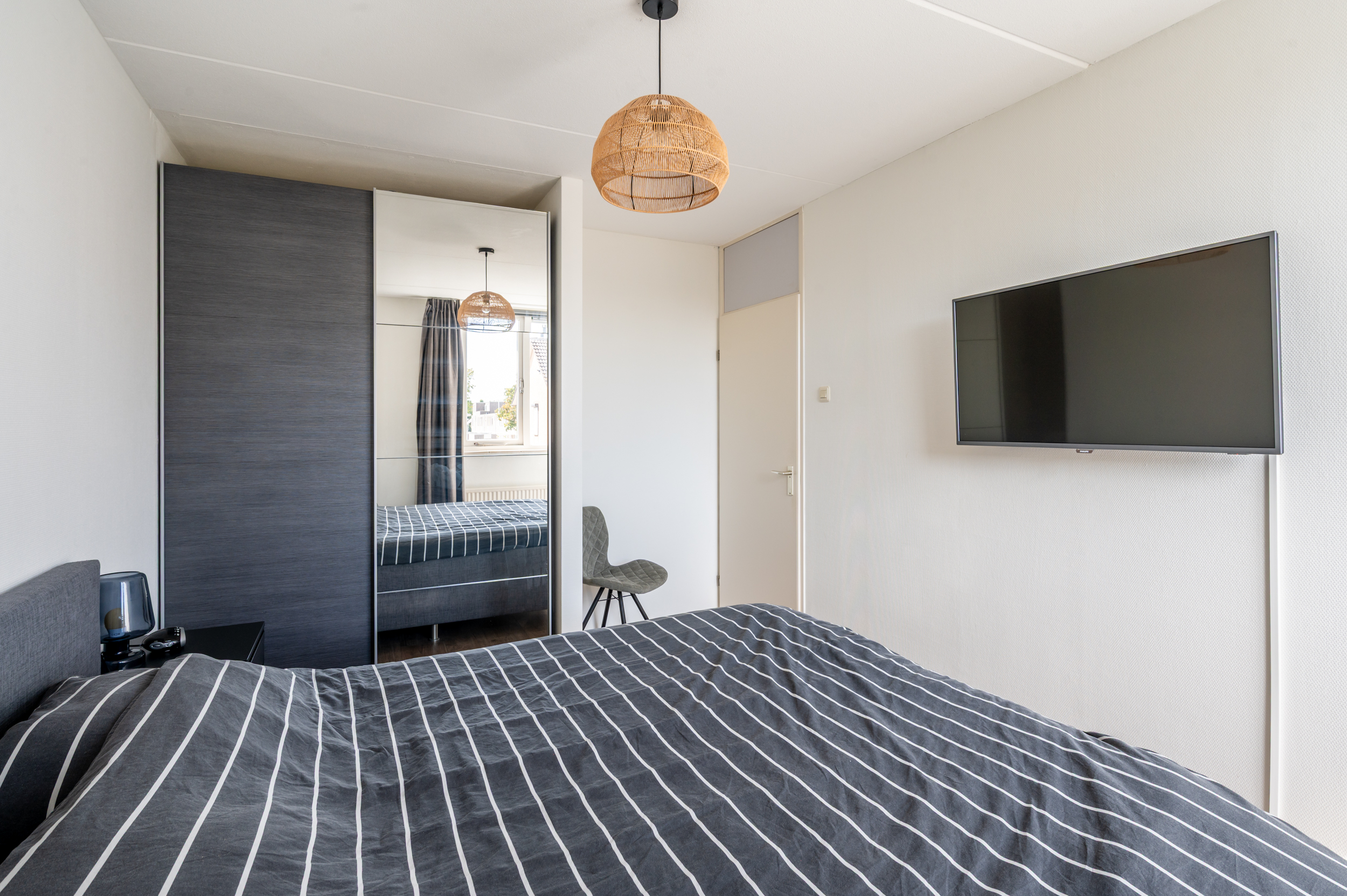 Via de gestoffeerde trap bereik je de overloop. Alle kozijnen op deze verdieping zijn voorzien van HR++ beglazing. Hier vind je tevens de vaste trapopgang naar de tweede verdieping. Aan de achterzijde bevinden zich twee slaapkamers, en aan de voorzijde een derde slaapkamer en de badkamer. Alle slaapkamers zijn voorzien van een laminaatvloer en (scan)behang. De volledig betegelde badkamer beschikt over een inloopdouche, een zwevend toilet, een wastafel met meubel, een extra opbergkast en een designradiator.