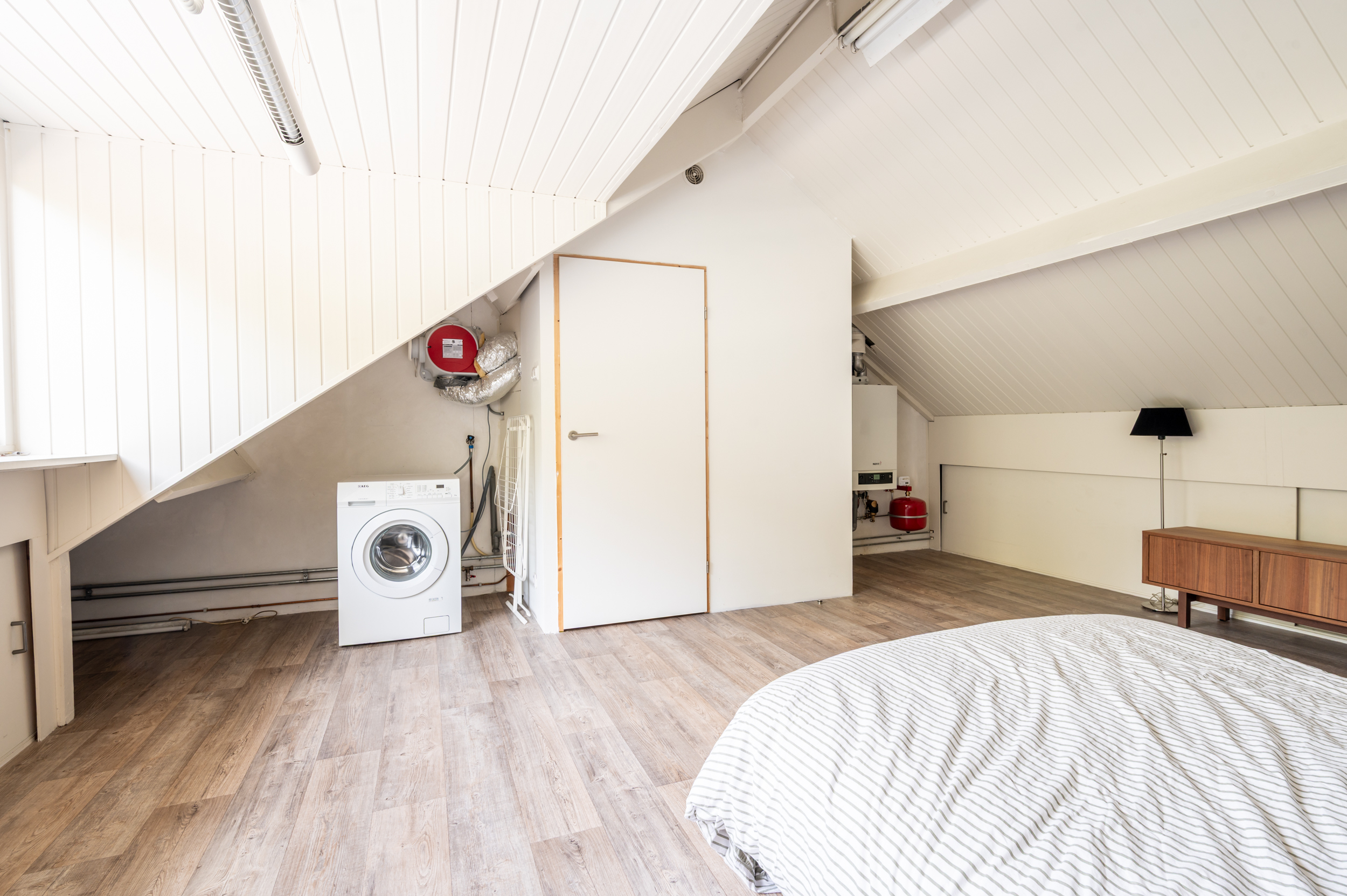 Daarnaast vind je hier de wasmachineaansluiting, cv-ketel, MV-unit en extra bergruimte achter de knieschotten. De verdieping is voorzien van een vinylvloer.