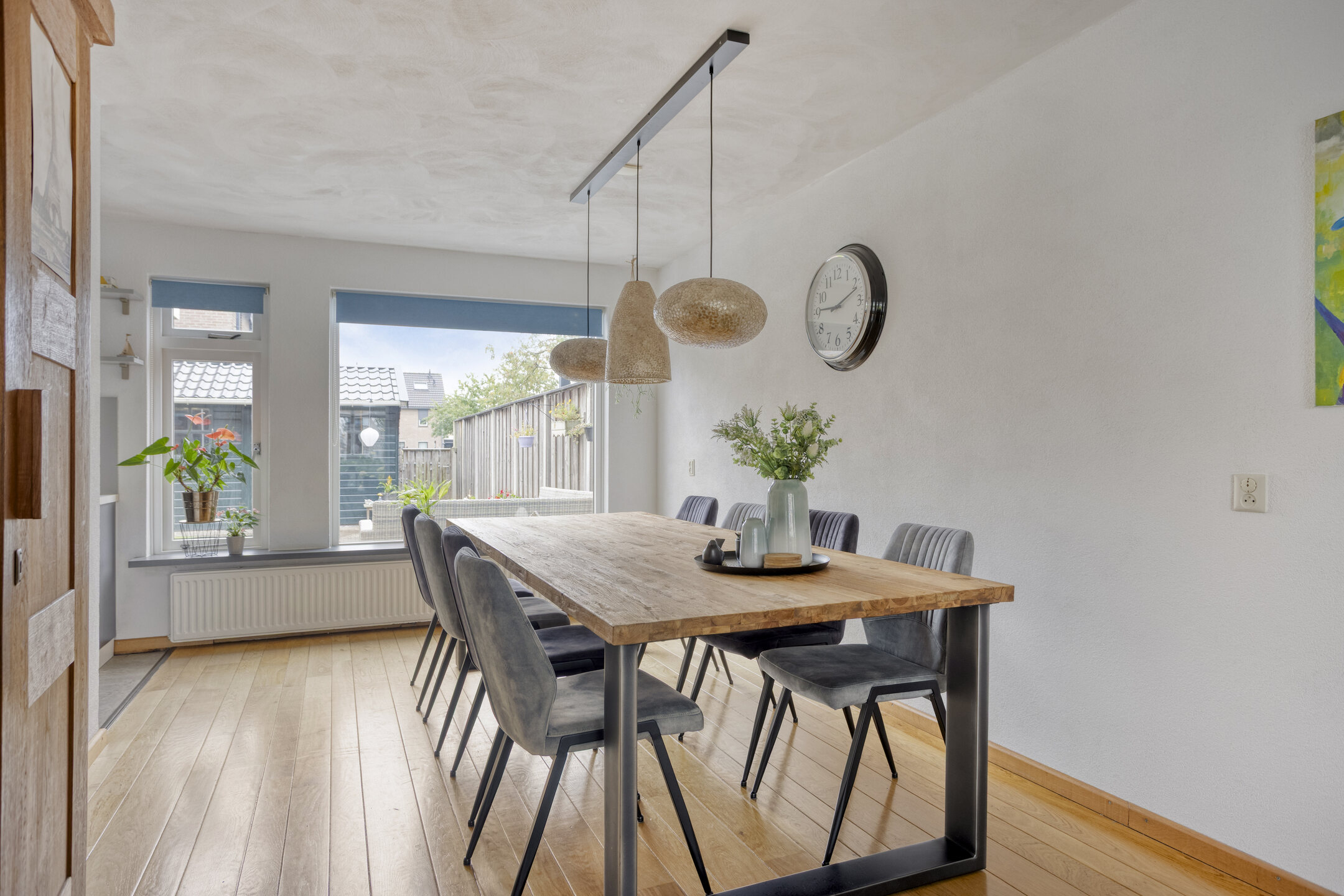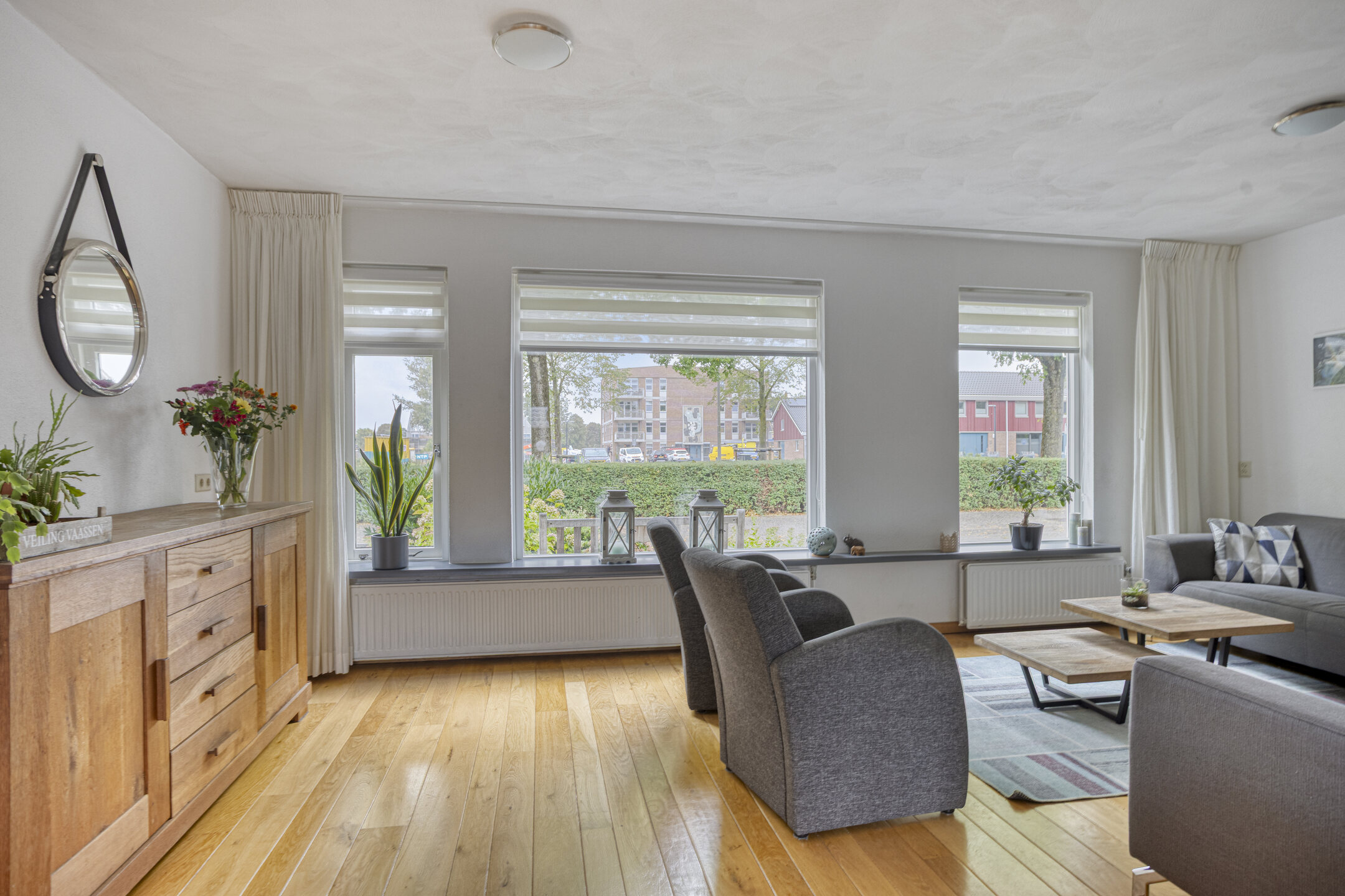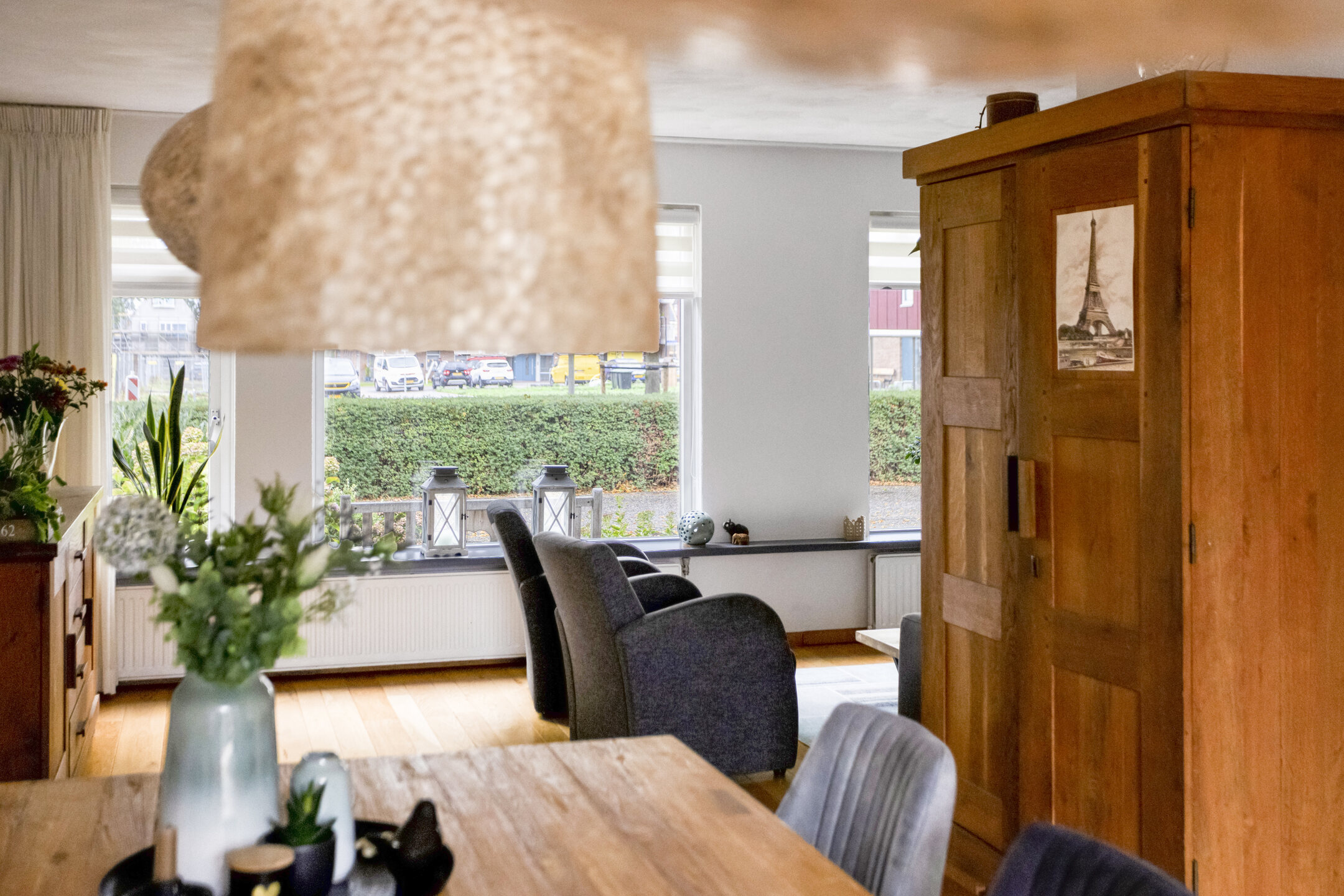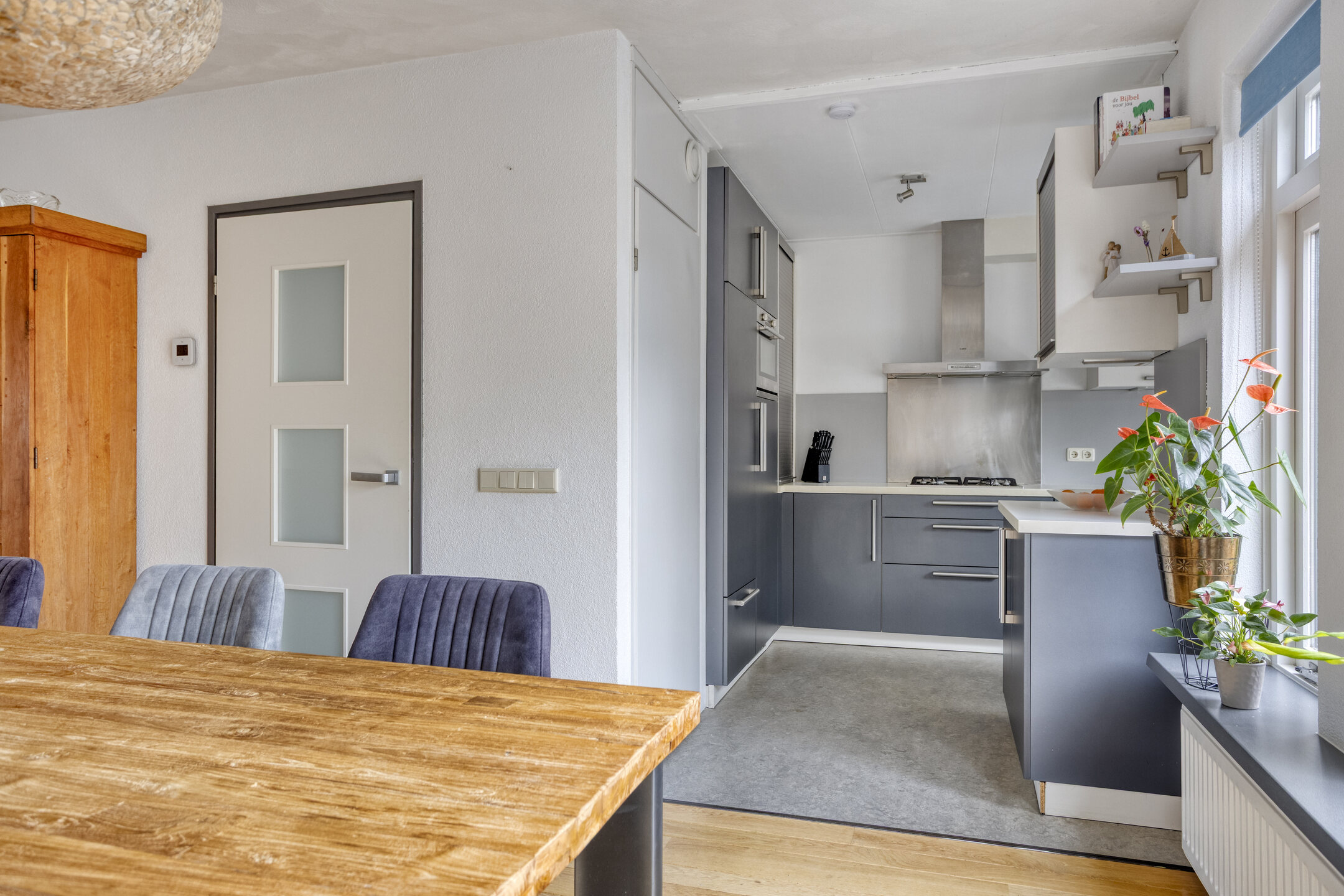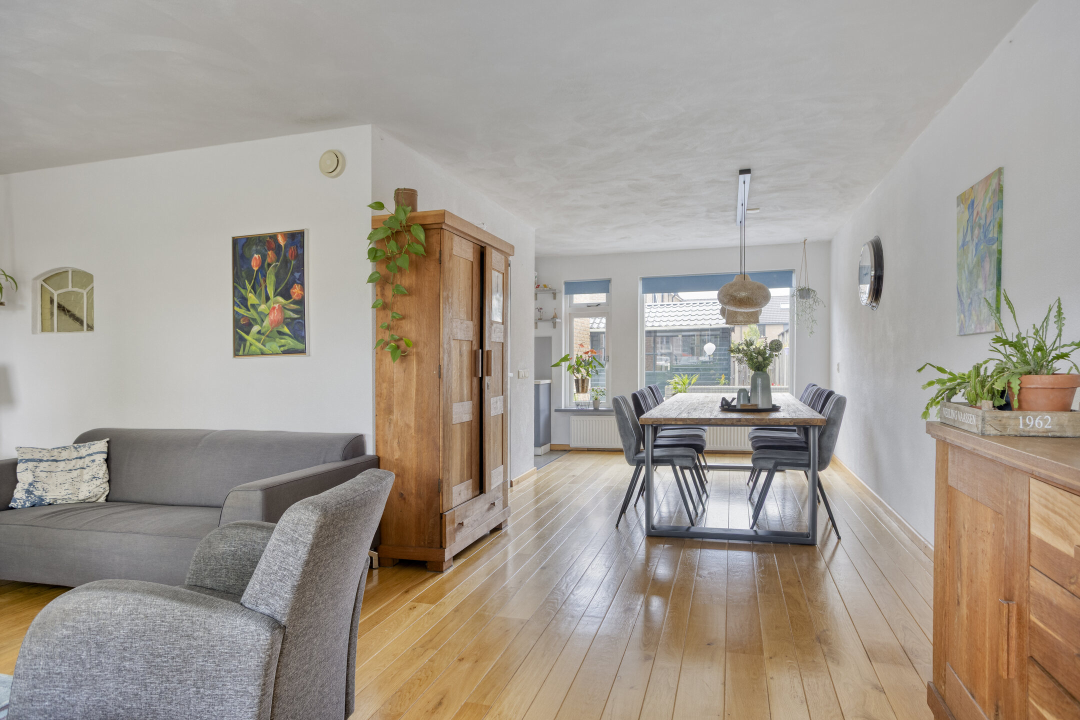 Binnenkomst in de hal met de trapopgang naar de 1e verdieping, de meterkast, de toegang tot de woonkamer/keuken en de toiletruimte, die is betegeld in een rustige kleurstelling en is voorzien van een zwevend toilet en een fonteintje. Bij binnenkomst in de woonkamer valt meteen het vrije uitzicht aan de voorzijde, het vele daglicht en de ruimte op: wat een mogelijkheden om in te richten! De prachtige massief eiken vloer, die is doorgelegd tot in de eethoek, maakt het een sfeervol geheel. Ter plaatse van de eethoek staat op dit moment een eettafel die ruimte biedt voor maar liefst 8 personen, die er met gemak kan staan. Dat zegt genoeg! Doorlopend naar de strakke, tijdloze keuken komt de ruimte die is gecreëerd, door de bijkeuken bij de keuken te trekken, goed tot zijn recht. De aanwezige inbouwapparatuur betreft een 4-pits gaskookplaat, een RVS-afzuigschouw, een vaatwasser, een koelkast, een vriezer en een combimagnetron. Vanuit de keuken bereik je de tuin en de garage middels een loopdeur. De garage is voorzien van een geïsoleerde betonvloer, elektra, een praktisch keukenblok en dubbele deuren naar de oprit.