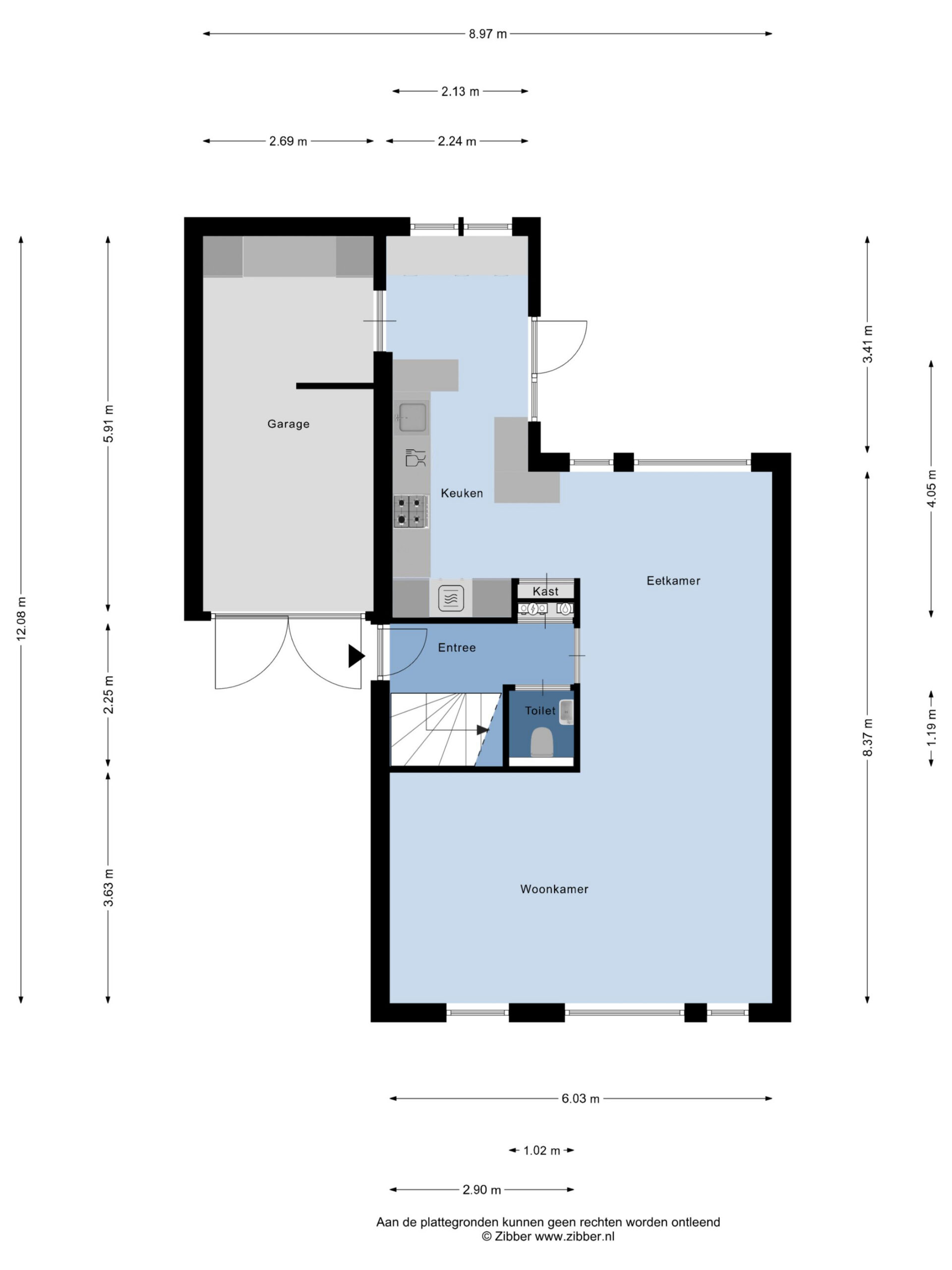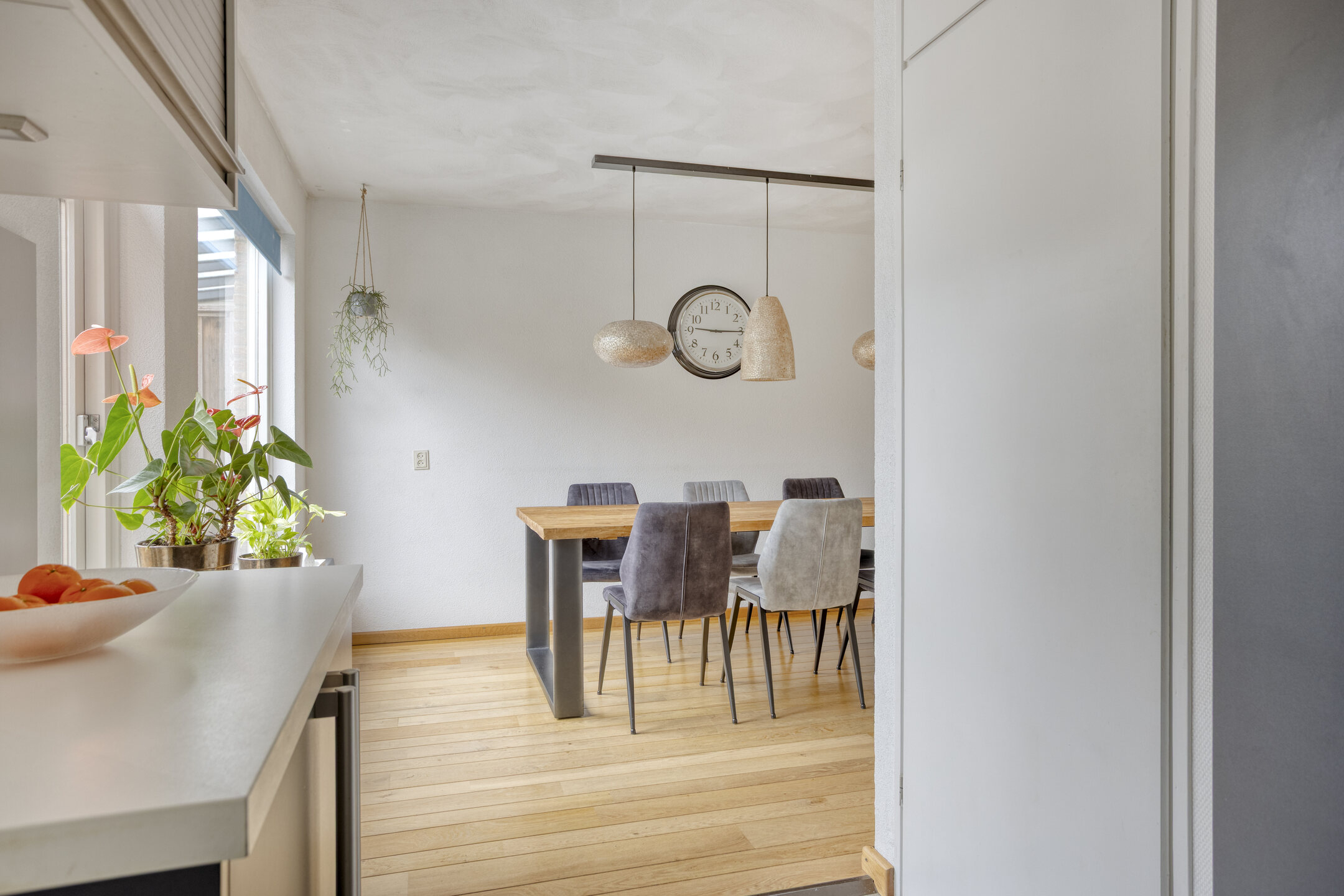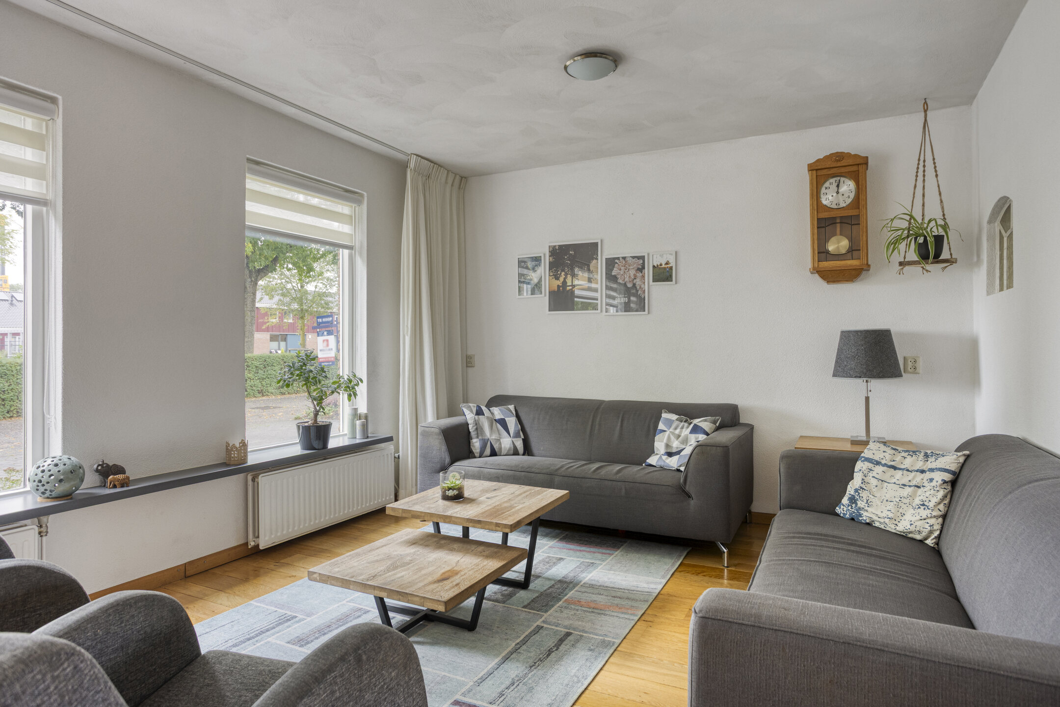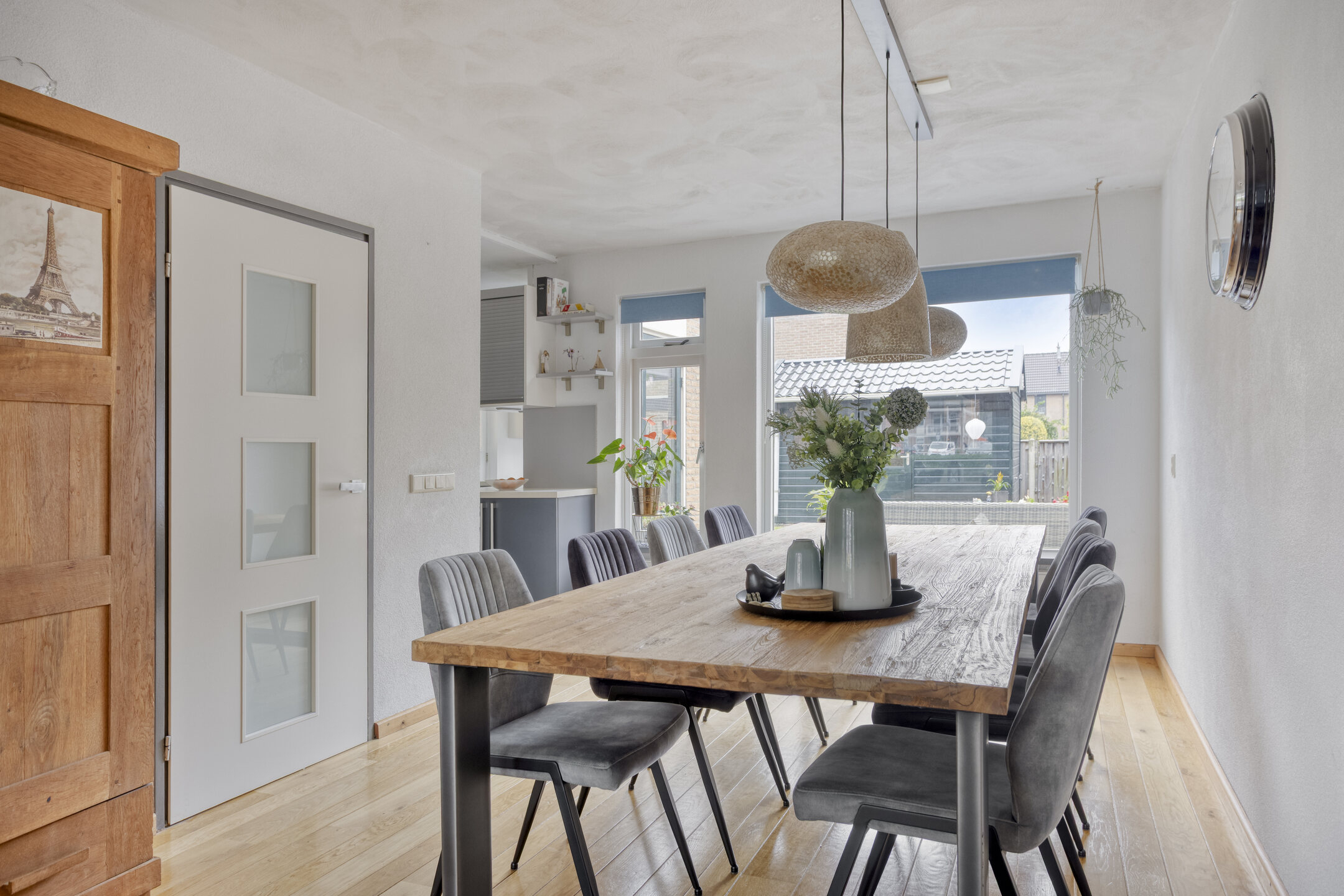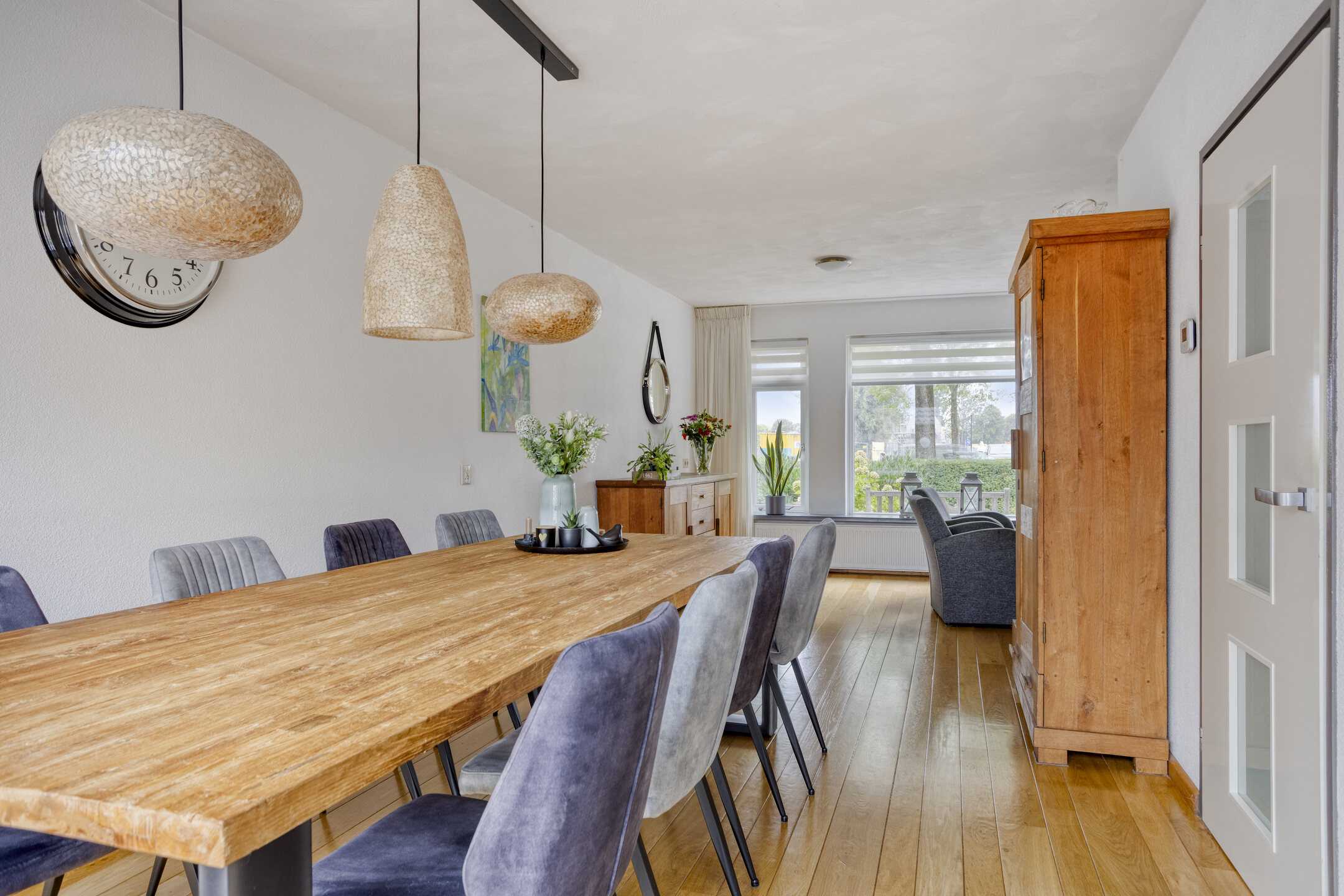 Binnenkomst in de hal met de trapopgang naar de 1e verdieping, de meterkast, de toegang tot de woonkamer/keuken en de toiletruimte, die is betegeld in een rustige kleurstelling en is voorzien van een zwevend toilet en een fonteintje. Bij binnenkomst in de woonkamer valt meteen het vrije uitzicht aan de voorzijde, het vele daglicht en de ruimte op: wat een mogelijkheden om in te richten! De prachtige massief eiken vloer, die is doorgelegd tot in de eethoek, maakt het een sfeervol geheel. Ter plaatse van de eethoek staat op dit moment een eettafel die ruimte biedt voor maar liefst 8 personen, die er met gemak kan staan. Dat zegt genoeg! Doorlopend naar de strakke, tijdloze keuken komt de ruimte die is gecreëerd, door de bijkeuken bij de keuken te trekken, goed tot zijn recht. De aanwezige inbouwapparatuur betreft een 4-pits gaskookplaat, een RVS-afzuigschouw, een vaatwasser, een koelkast, een vriezer en een combimagnetron. Vanuit de keuken bereik je de tuin en de garage middels een loopdeur. De garage is voorzien van een geïsoleerde betonvloer, elektra, een praktisch keukenblok en dubbele deuren naar de oprit.