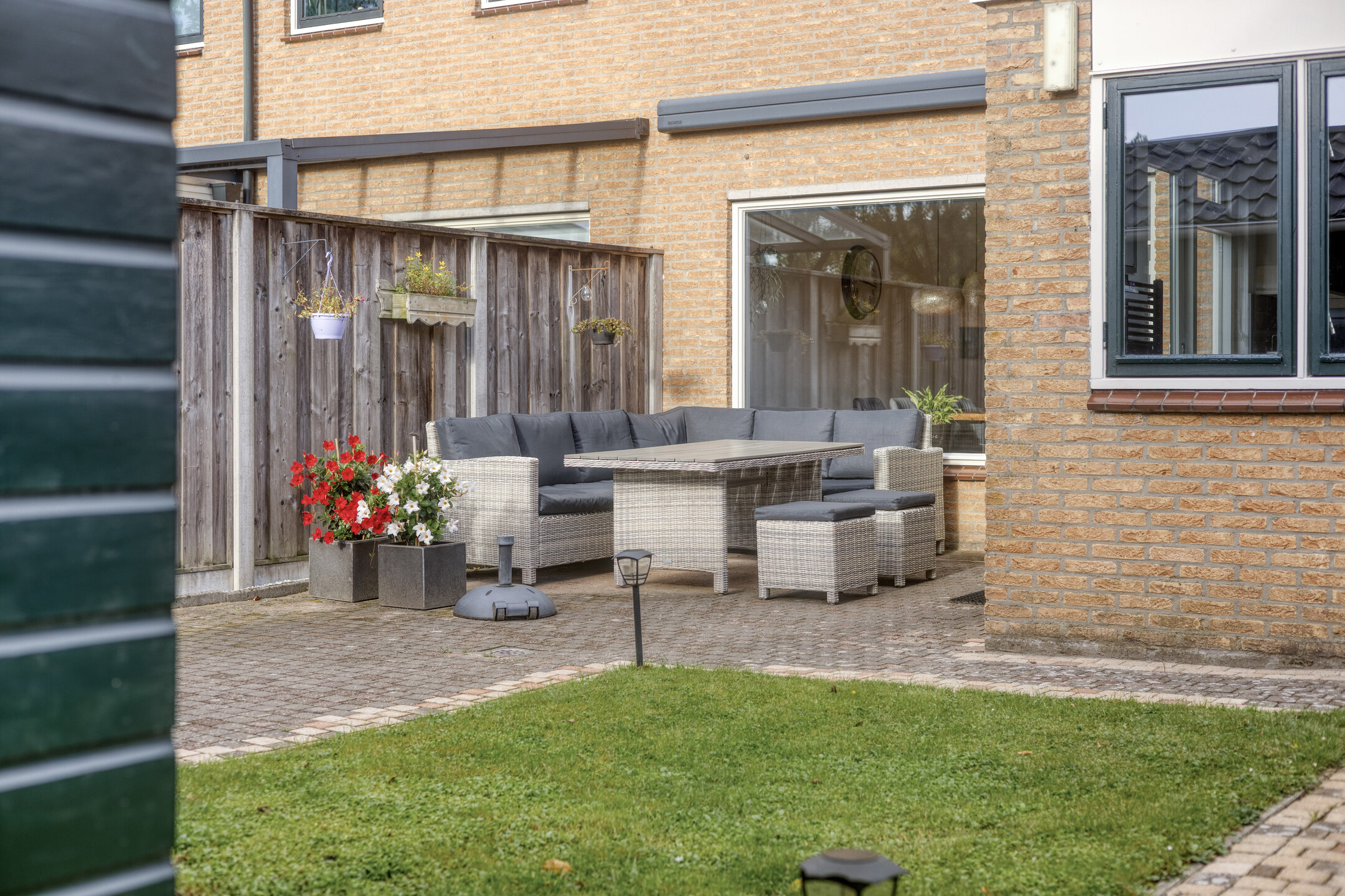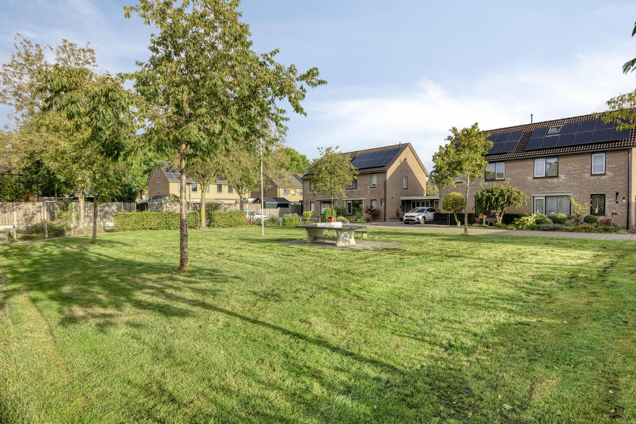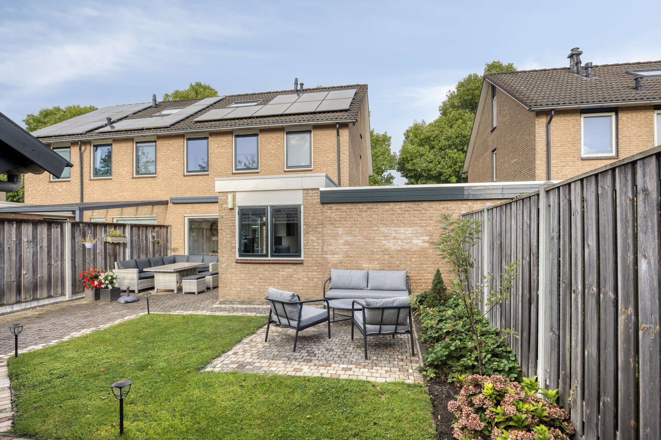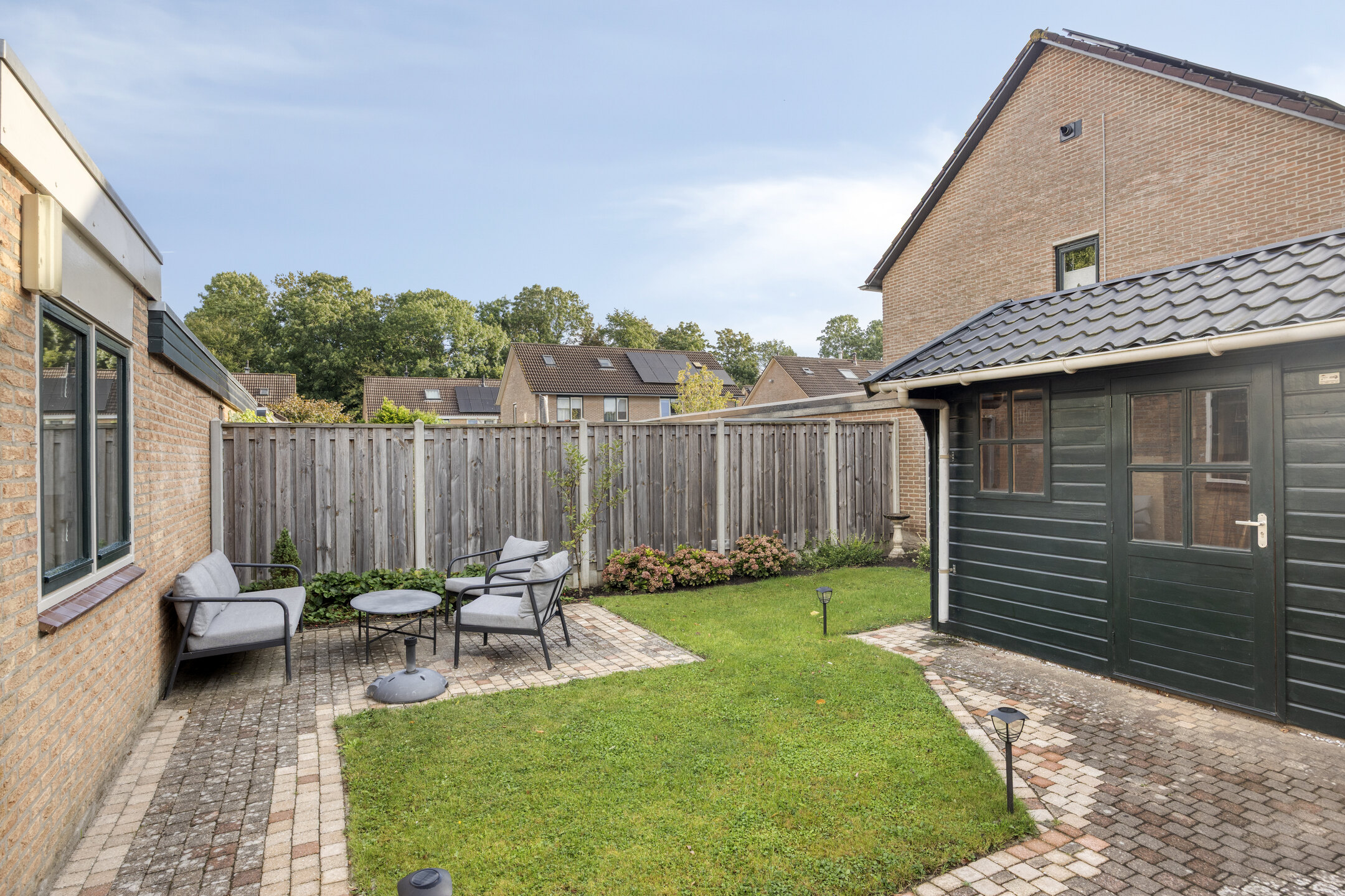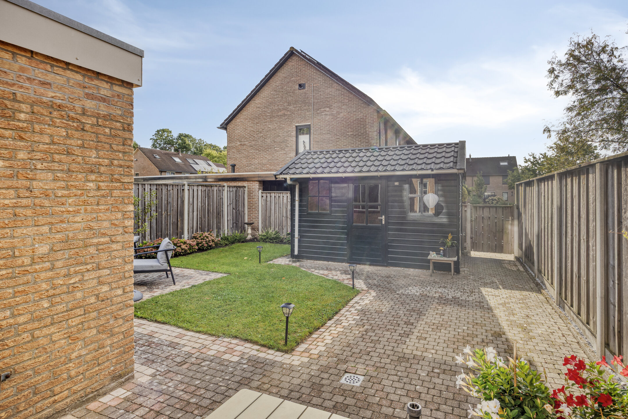 Klaar? Genieten maar! In deze onderhoudsarme en toch groene tuin op het zuidoosten hoef je niet veel te doen om er volop van te genieten. De tuin is aangelegd met een fijn terras, gras en beplanting. Dankzij de gunstige zonligging geniet je al vroeg op de dag van de eerste zonnestralen. Is het jou overdag toch wat te warm? Dan maak je gemakkelijk gebruik van het elektrisch bedienbare zonnescherm. Achter in de tuin tref je een achterom en een handige, houten berging, die voorzien is van elektra en een buitenkraan.