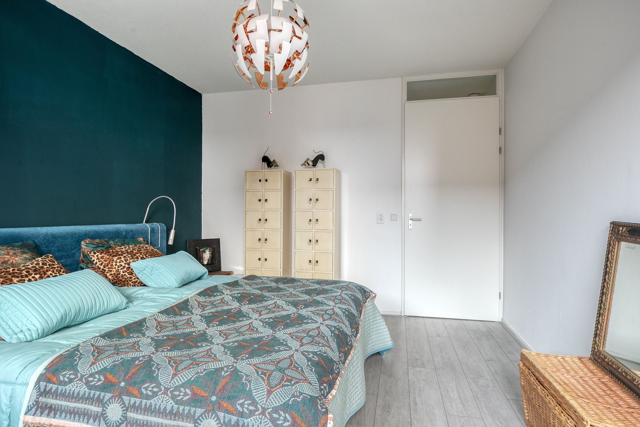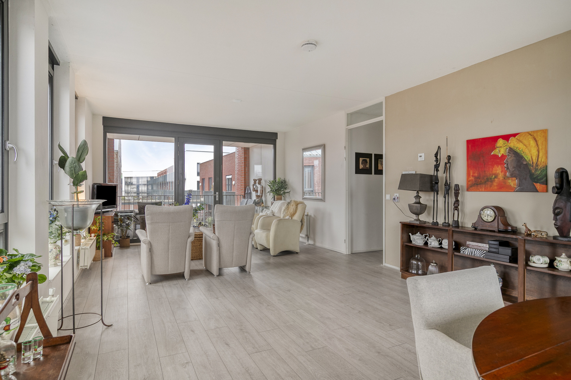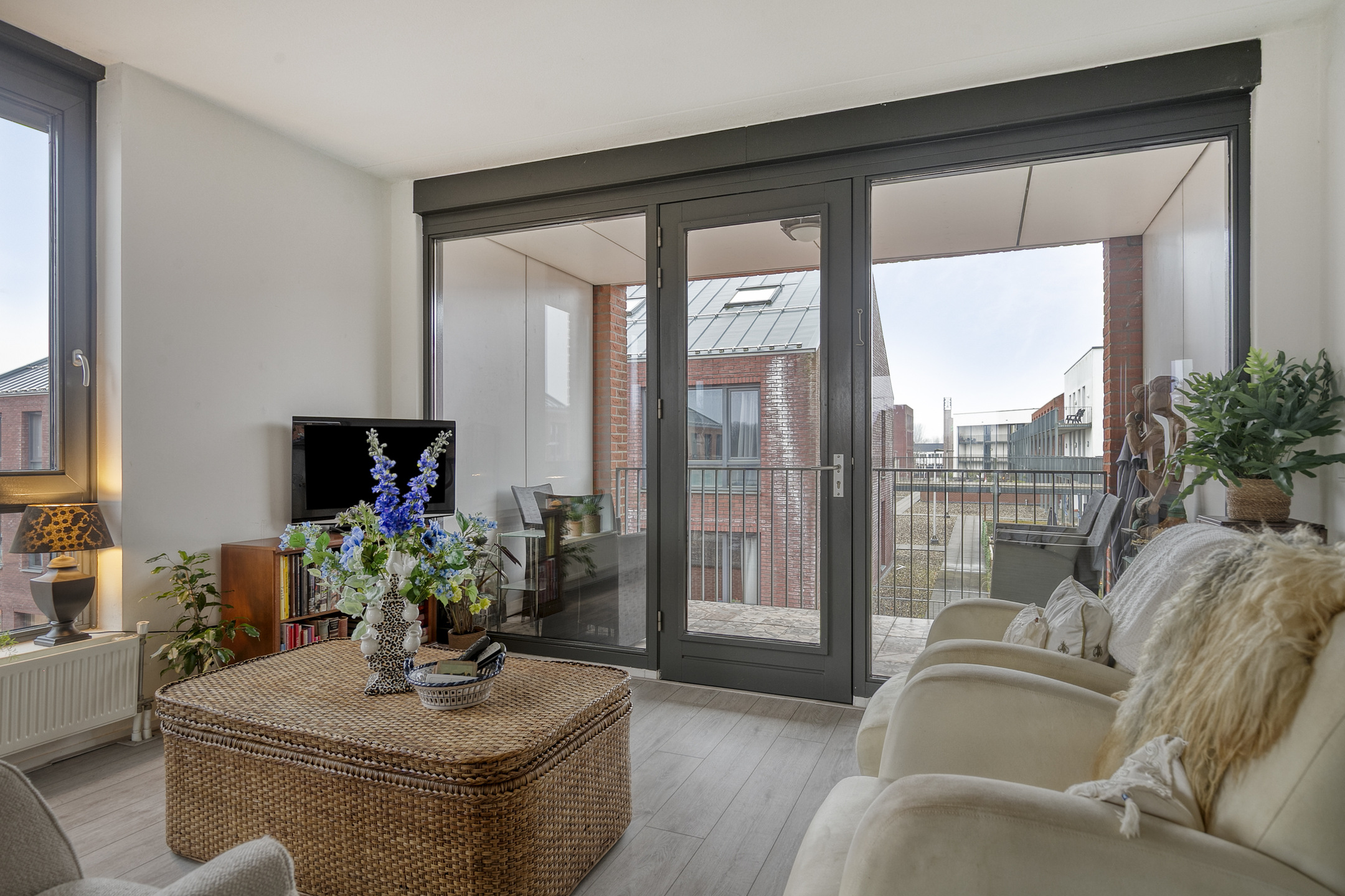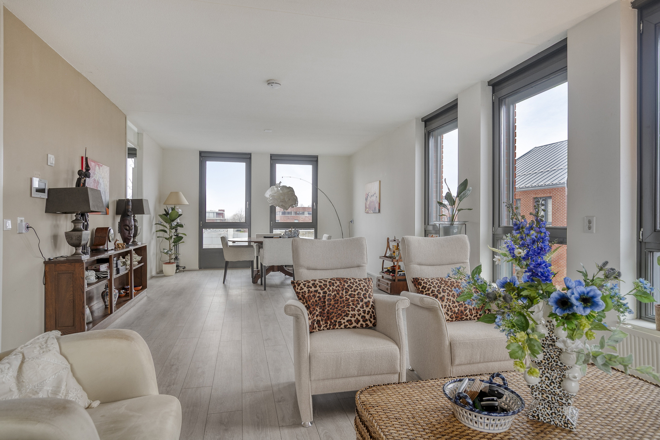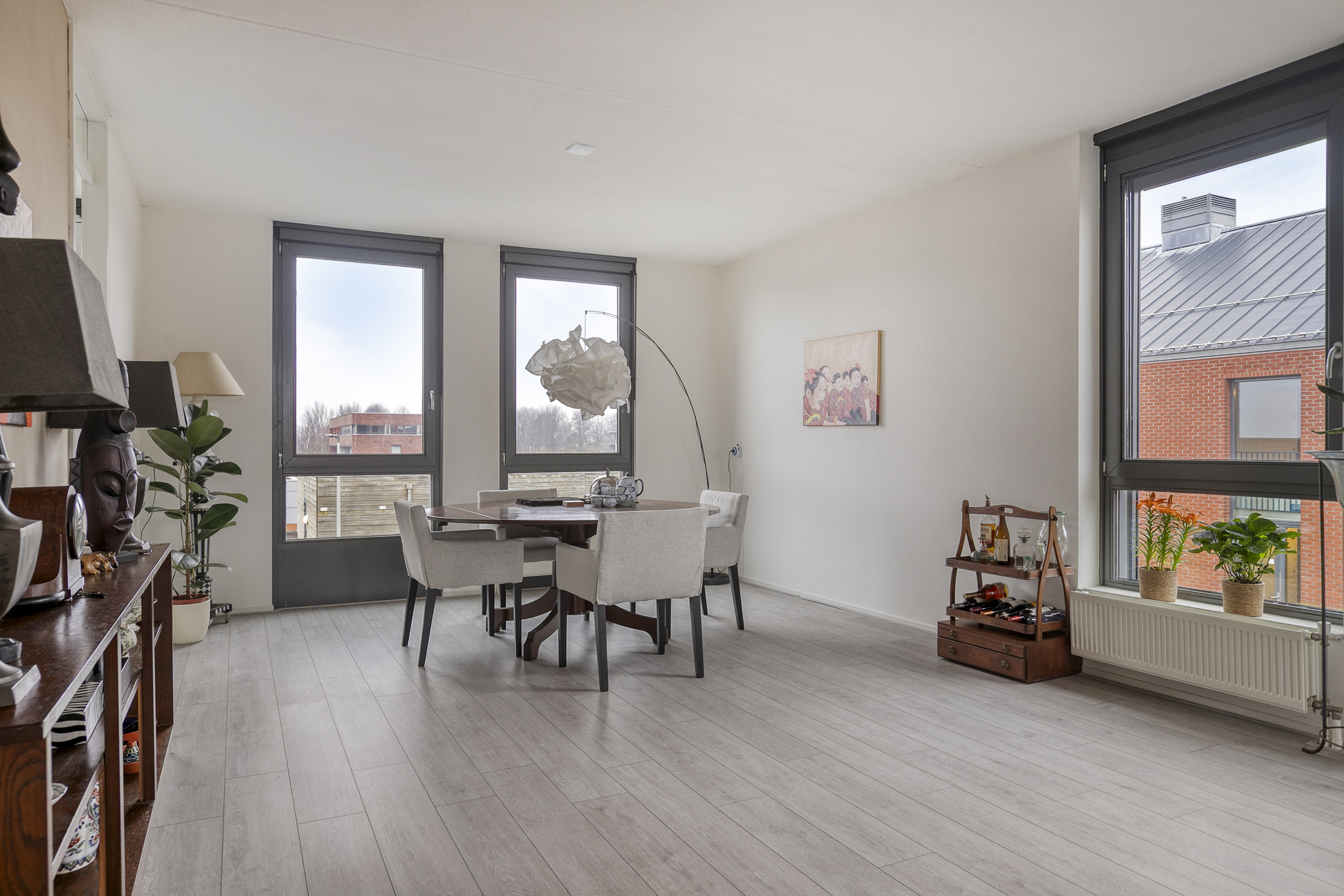 Het gehele appartement is strak afgewerkt met een doorlopende laminaatvloer, wat zorgt voor een rustige en uniforme uitstraling. In combinatie met de grote raampartijen maakt dit het appartement licht en verzorgd.
