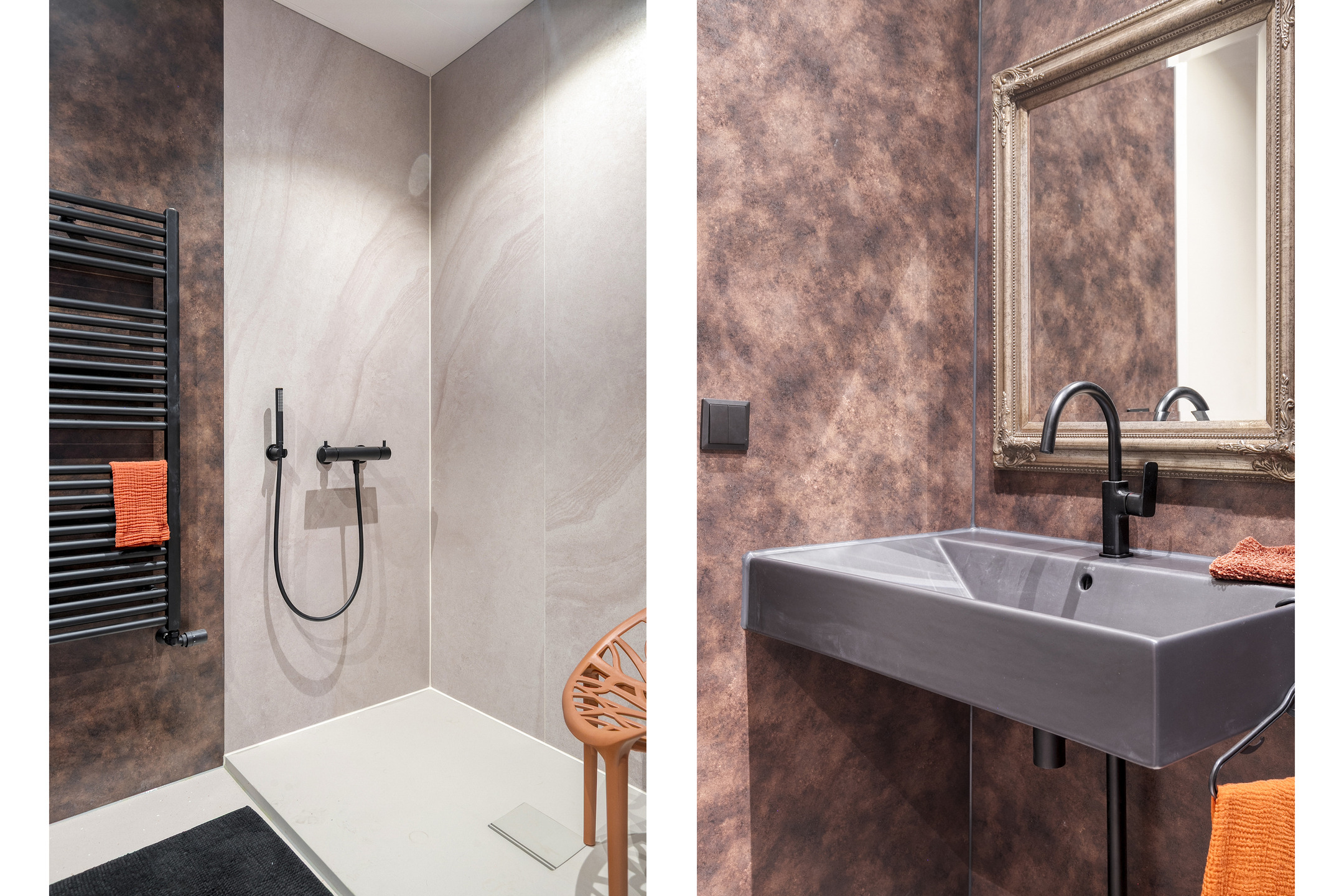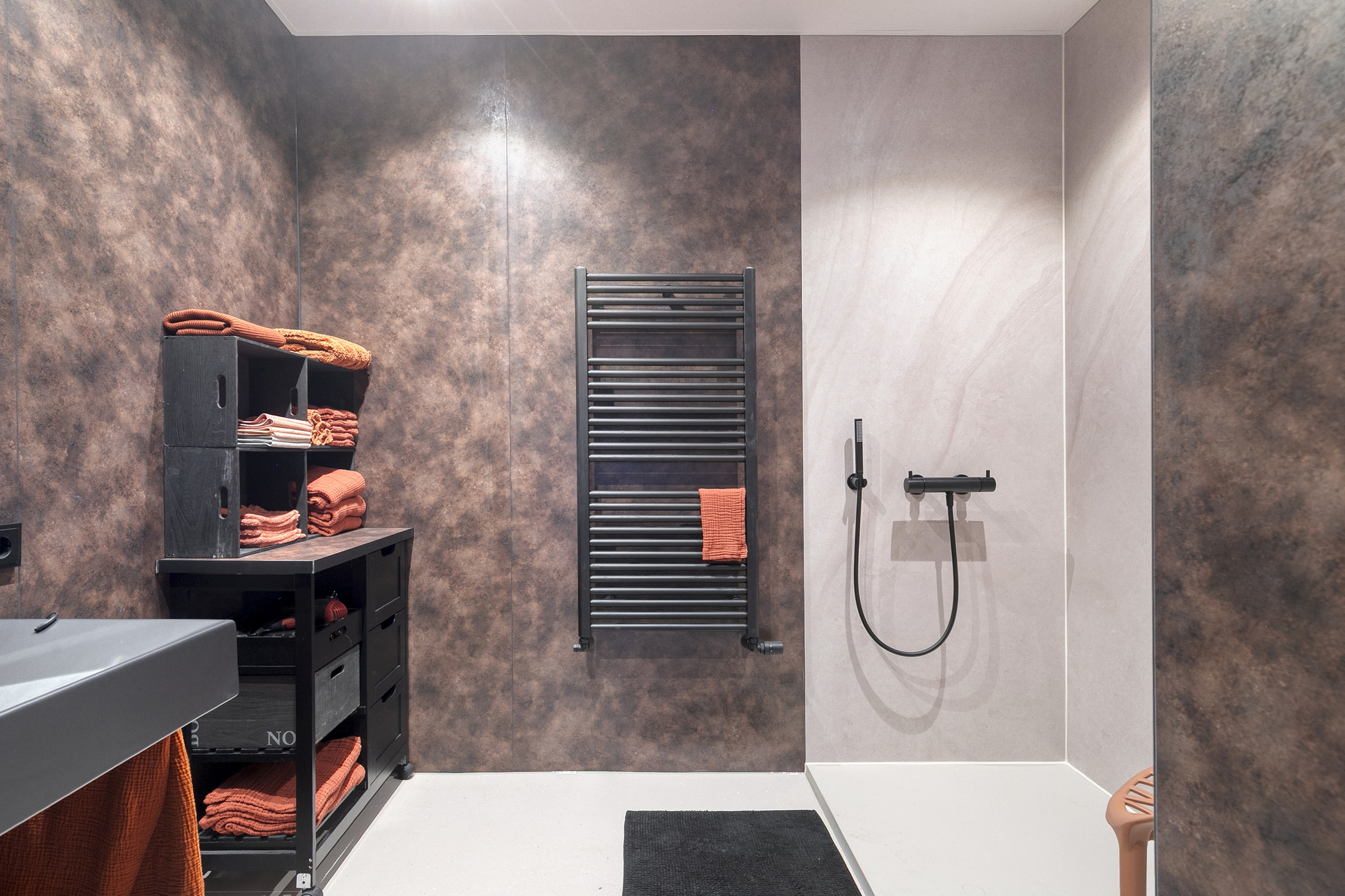Aan het begin van de hal tref je de meterkast en de vernieuwde badkamer (2025). Deze is modern afgewerkt met wand- en vloerpanelen en beschikt over een royale douchehoek met handdouche en een wastafel met spiegel.