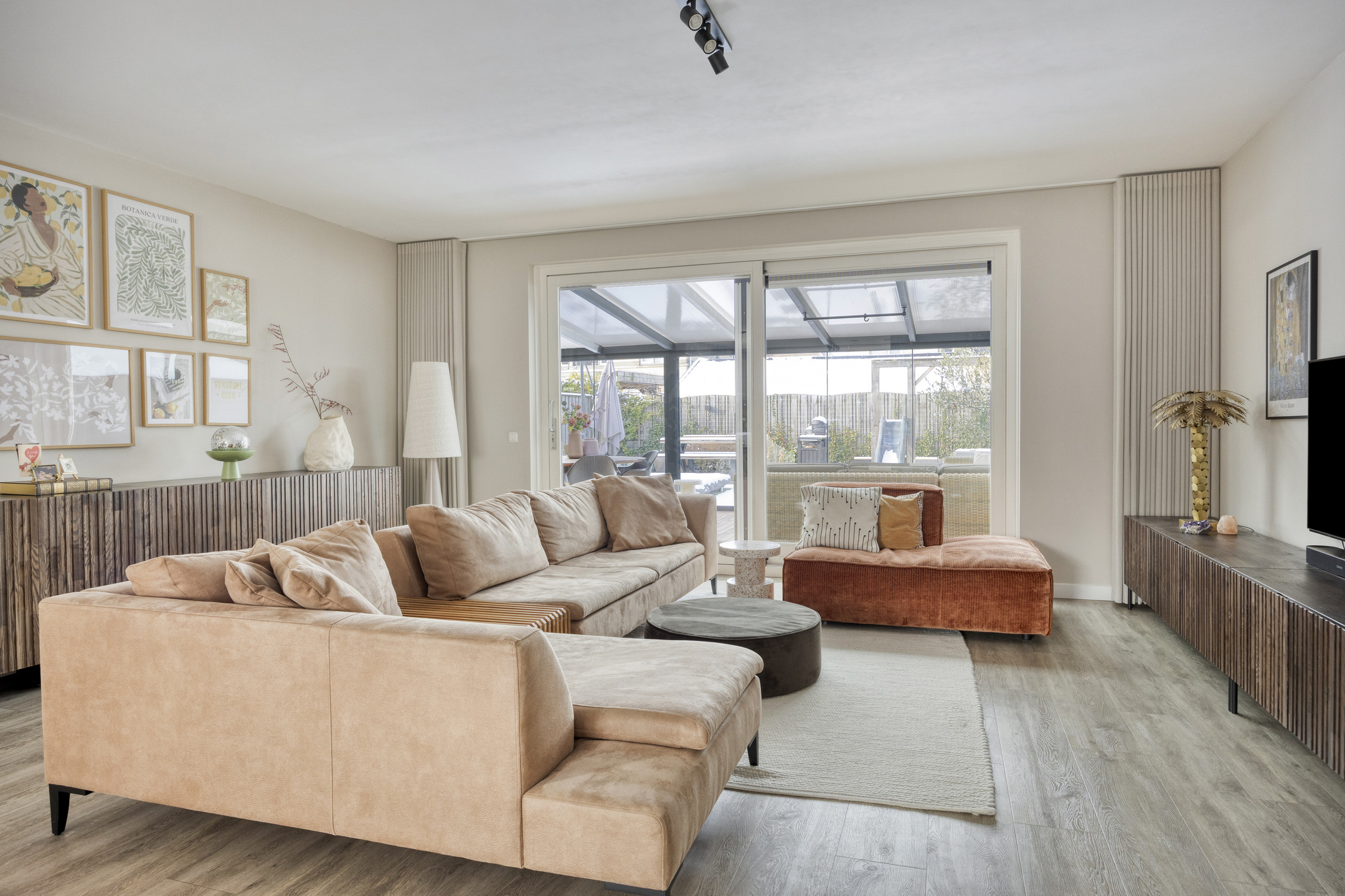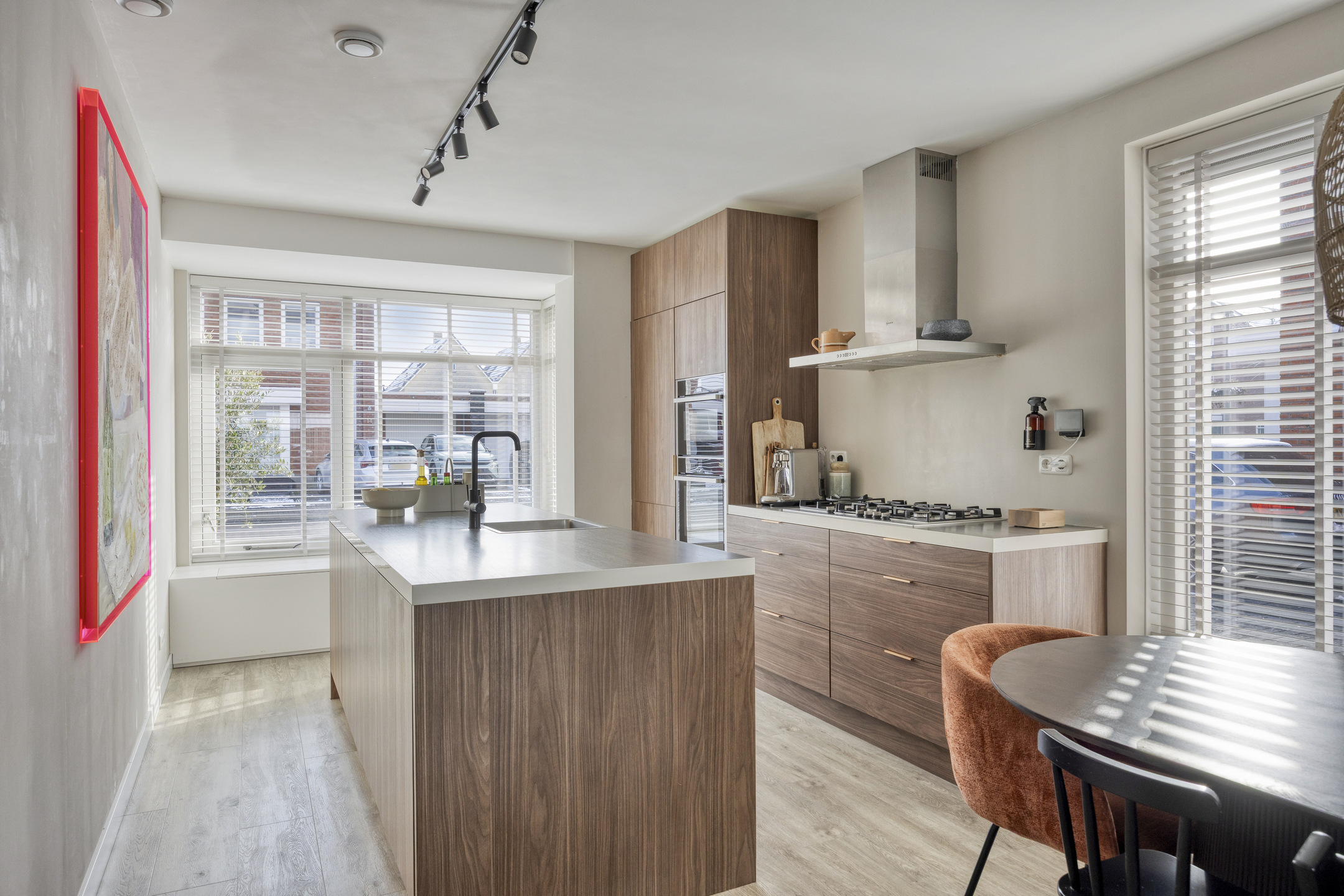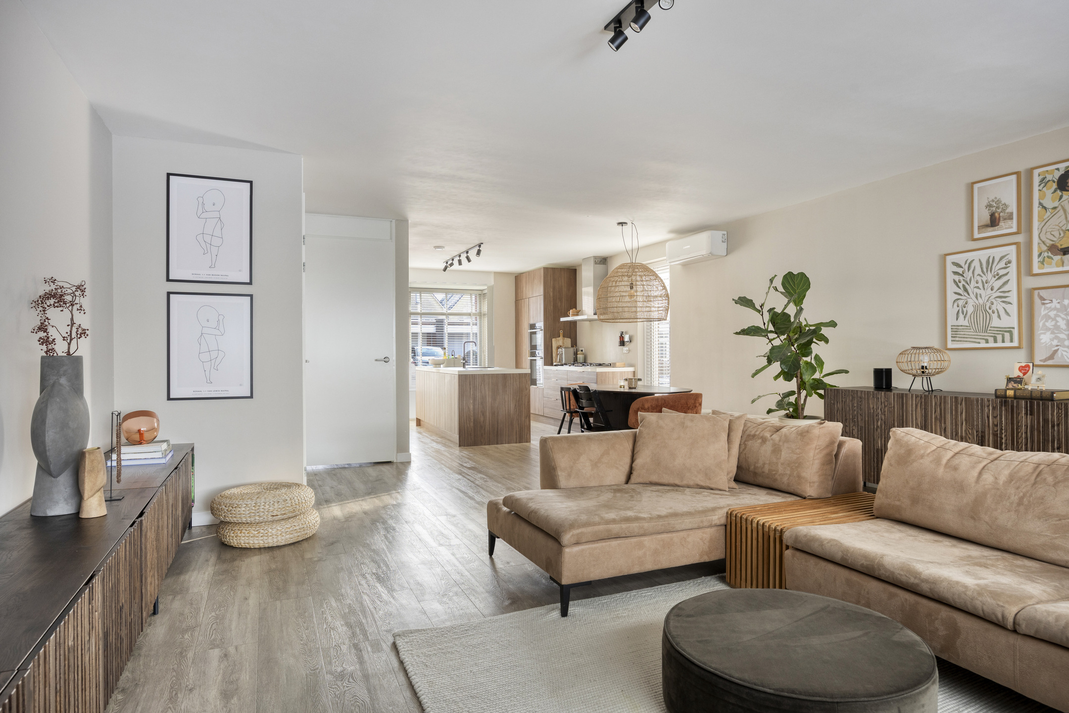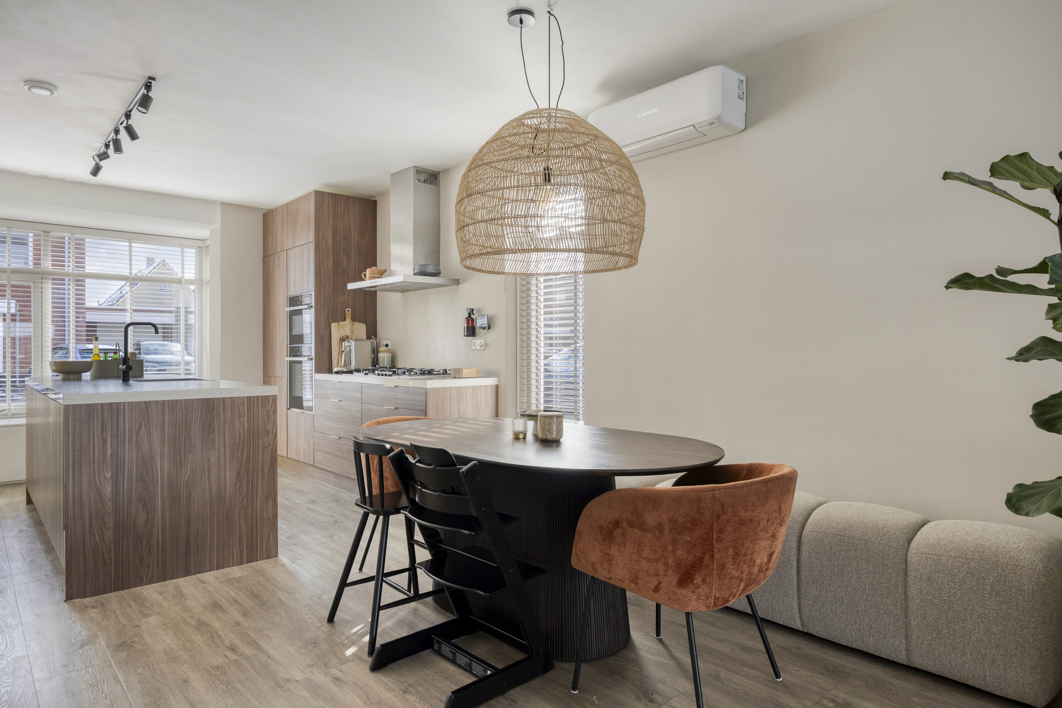 Binnenkomst in de hal met de meterkast, de trapopgang naar de 1e verdieping, de toegang tot de woonkamer/keuken en de toiletruimte, die is betegeld in een rustige kleurstelling en is voorzien van een zwevend toilet en een fonteintje. Bij binnenkomst in de living is de maatvoering, de keurige afwerking en de fijne indeling hetgeen dat meteen in het oog springt. Wat een mooie ruimte is dit! De keuken is aan de voorzijde van de woning gesitueerd en is uitgevoerd in een rechte opstelling met spoeleiland. Mooie extra is de erker, waar bergruimte is gecreëerd met een bankje. De frontjes van de keuken zijn in 2025 vernieuwd en verder is de keuken voorzien van inbouwapparatuur zoals een 5-pits gaskookplaat, een RVS-afzuigschouw, een koelkast, een vaatwasser, een oven, een combimagnetron en een kokend waterkraan (2021). Ter plaatse van de eethoek heb je de mogelijkheid een grote eettafel te plaatsen en verder tref je hier een praktische trapkast en airconditioning, die ook kan verwarmen. De woonkamer is tuingericht en dankzij de uitbouw heb je hier de mogelijkheid een grote bank of meerdere meubels te plaatsen. De pvc-vloer gecombineerd met comfortabele vloerverwarming en de gestucte wanden en plafonds maken het helemaal af. Vanuit de woonkamer is de overkapping (met glazen deuren) bereikbaar middels een schuifpui, en dit is eigenlijk een verlenging van je woonkamer! De overkapping is zeer ruim te noemen en je hebt dan ook de mogelijkheid om deze helemaal naar eigen smaak in te richten. De garage is vanuit hier bereikbaar en deze biedt voorzieningen als elektra, een geïsoleerde betonvloer en een kantel- en loopdeur naar de eigen oprit.