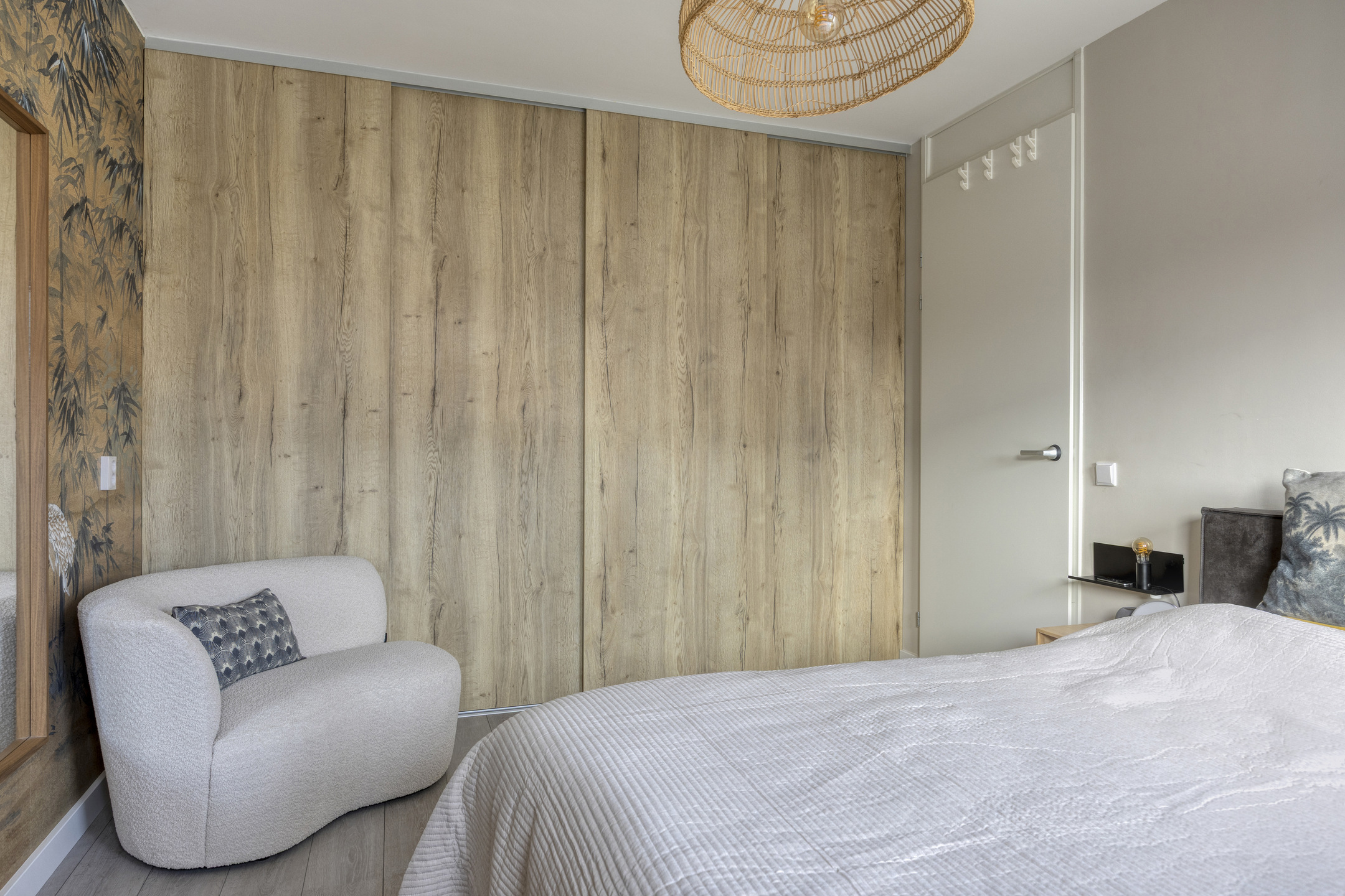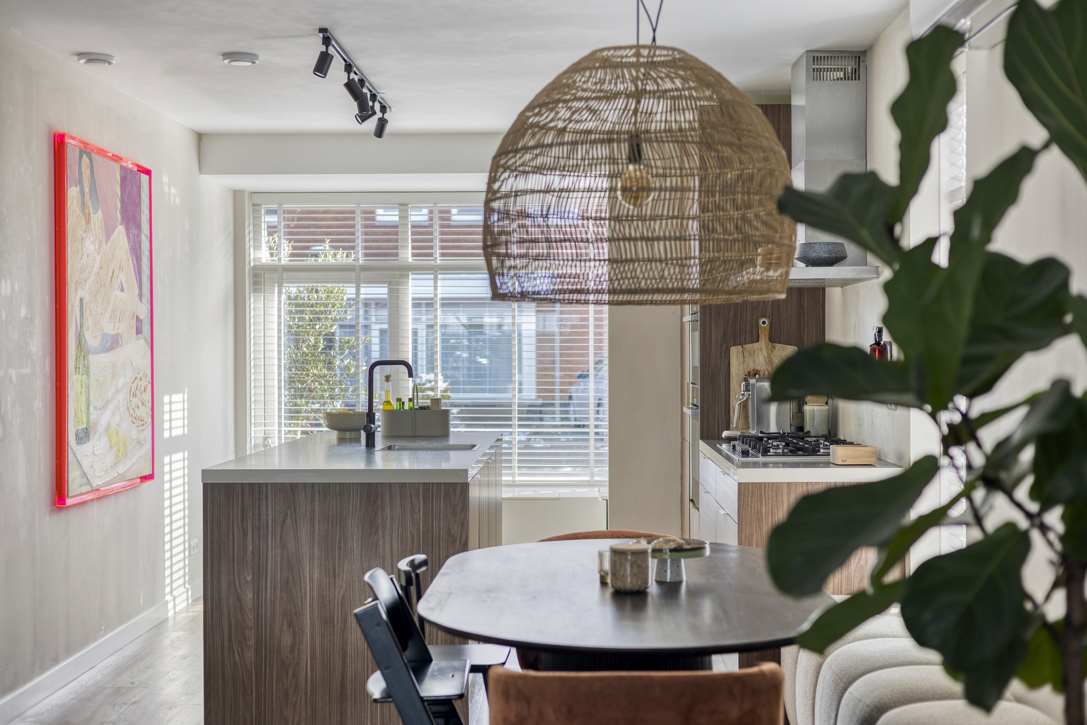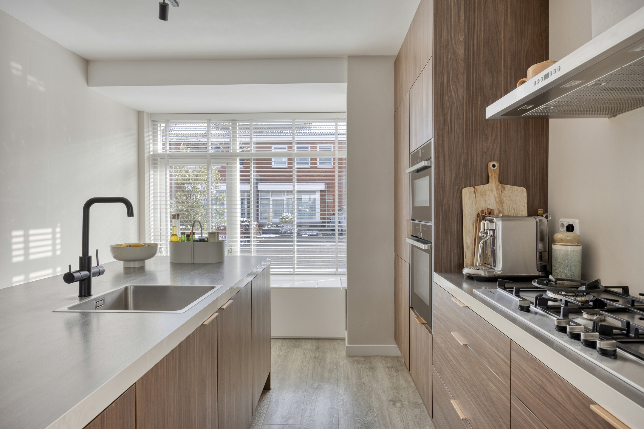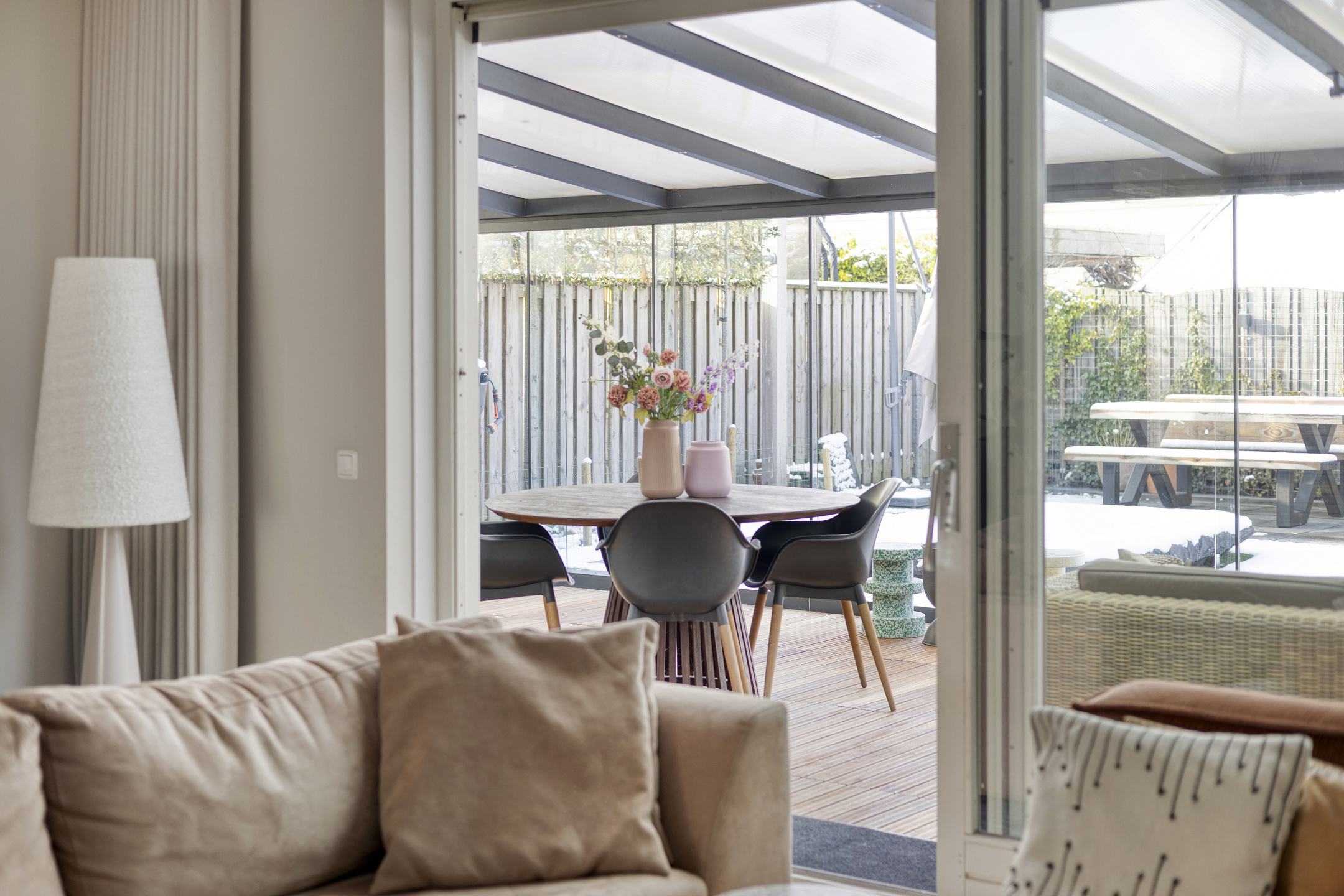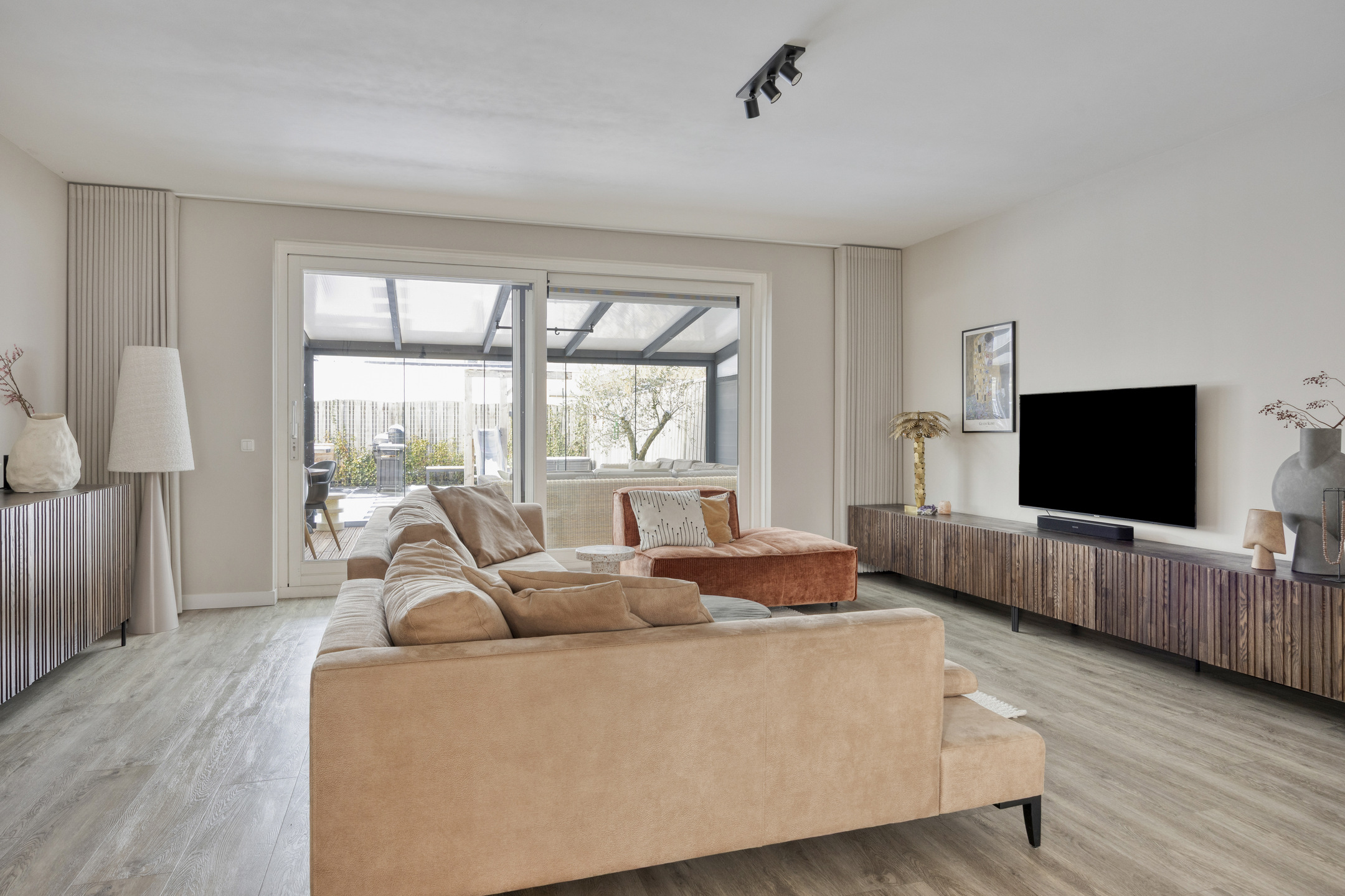 Binnenkomst in de hal met de meterkast, de trapopgang naar de 1e verdieping, de toegang tot de woonkamer/keuken en de toiletruimte, die is betegeld in een rustige kleurstelling en is voorzien van een zwevend toilet en een fonteintje. Bij binnenkomst in de living is de maatvoering, de keurige afwerking en de fijne indeling hetgeen dat meteen in het oog springt. Wat een mooie ruimte is dit! De keuken is aan de voorzijde van de woning gesitueerd en is uitgevoerd in een rechte opstelling met spoeleiland. Mooie extra is de erker, waar bergruimte is gecreëerd met een bankje. De frontjes van de keuken zijn in 2025 vernieuwd en verder is de keuken voorzien van inbouwapparatuur zoals een 5-pits gaskookplaat, een RVS-afzuigschouw, een koelkast, een vaatwasser, een oven, een combimagnetron en een kokend waterkraan (2021). Ter plaatse van de eethoek heb je de mogelijkheid een grote eettafel te plaatsen en verder tref je hier een praktische trapkast en airconditioning, die ook kan verwarmen. De woonkamer is tuingericht en dankzij de uitbouw heb je hier de mogelijkheid een grote bank of meerdere meubels te plaatsen. De pvc-vloer gecombineerd met comfortabele vloerverwarming en de gestucte wanden en plafonds maken het helemaal af. Vanuit de woonkamer is de overkapping (met glazen deuren) bereikbaar middels een schuifpui, en dit is eigenlijk een verlenging van je woonkamer! De overkapping is zeer ruim te noemen en je hebt dan ook de mogelijkheid om deze helemaal naar eigen smaak in te richten. De garage is vanuit hier bereikbaar en deze biedt voorzieningen als elektra, een geïsoleerde betonvloer en een kantel- en loopdeur naar de eigen oprit.