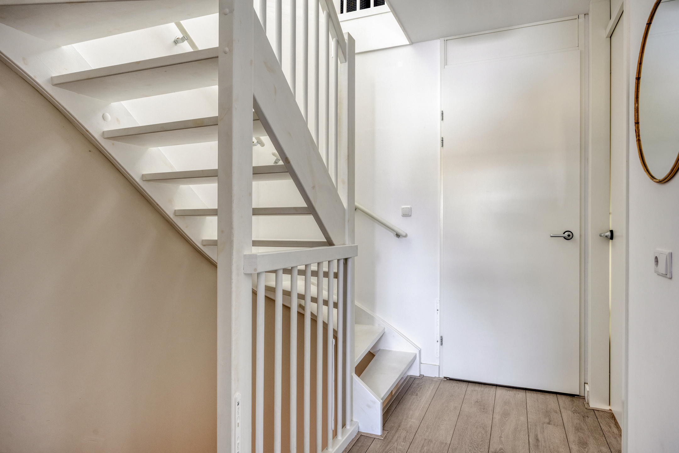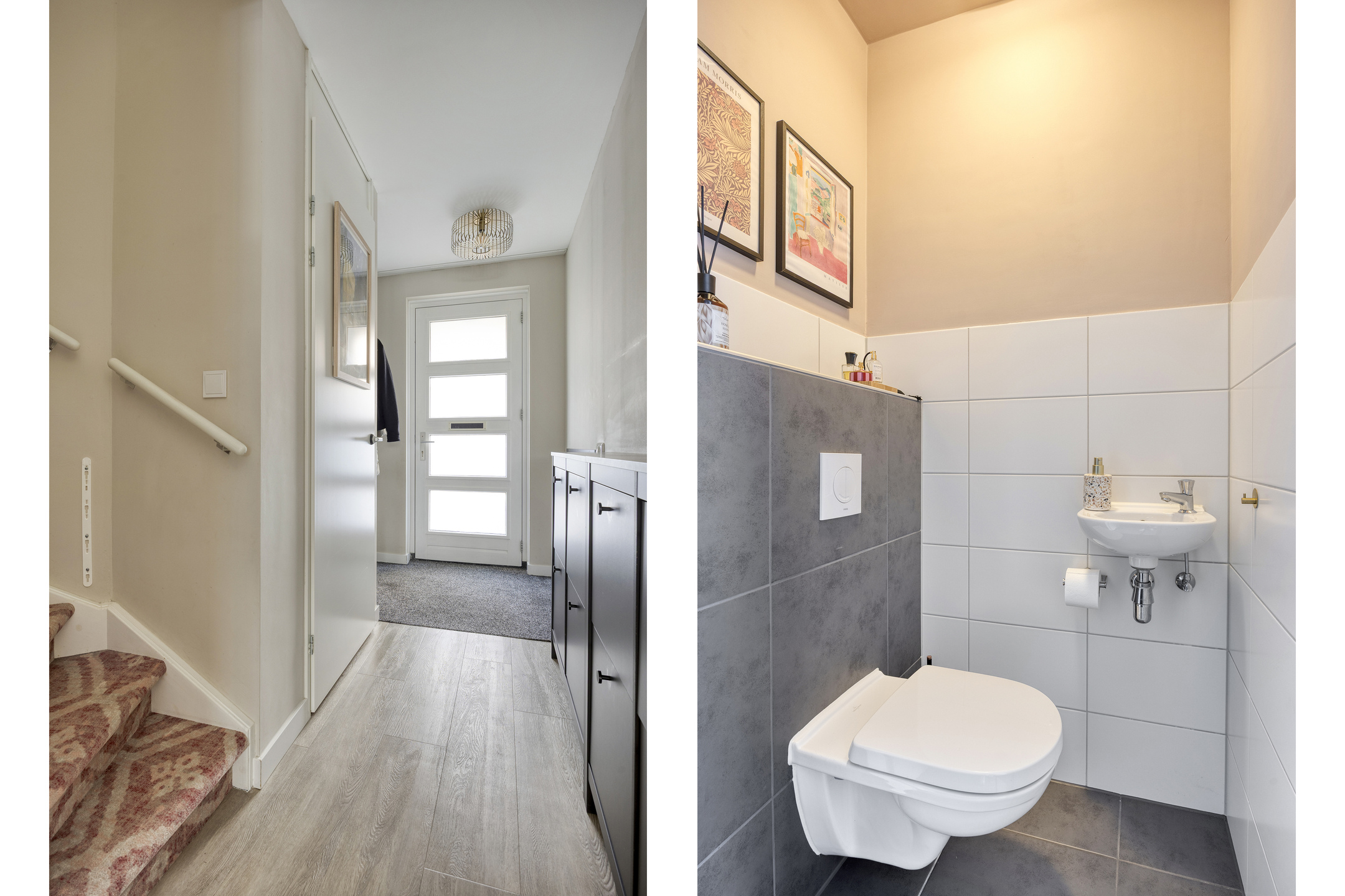 Binnenkomst in de hal met de meterkast, de trapopgang naar de 1e verdieping, de toegang tot de woonkamer/keuken en de toiletruimte, die is betegeld in een...