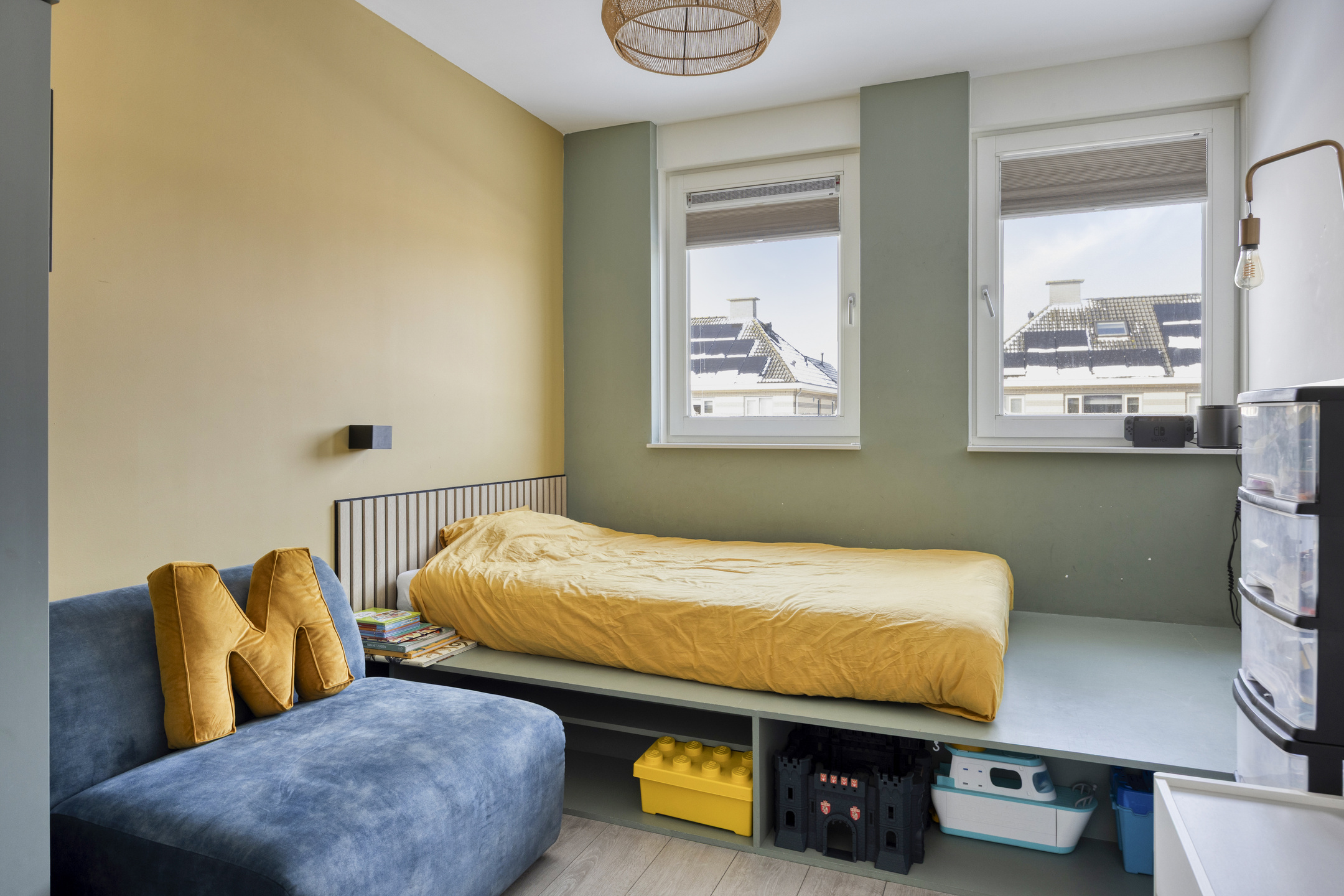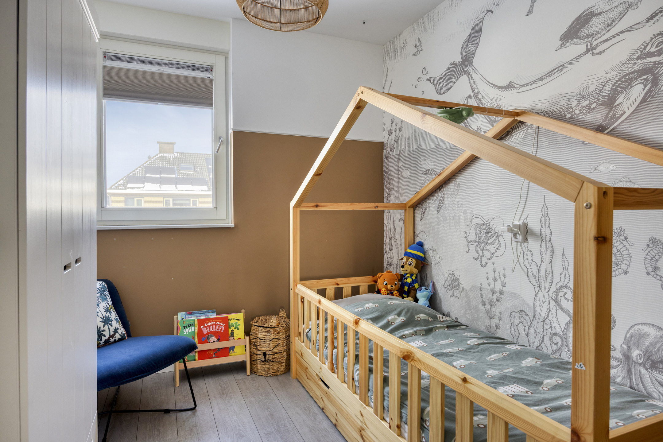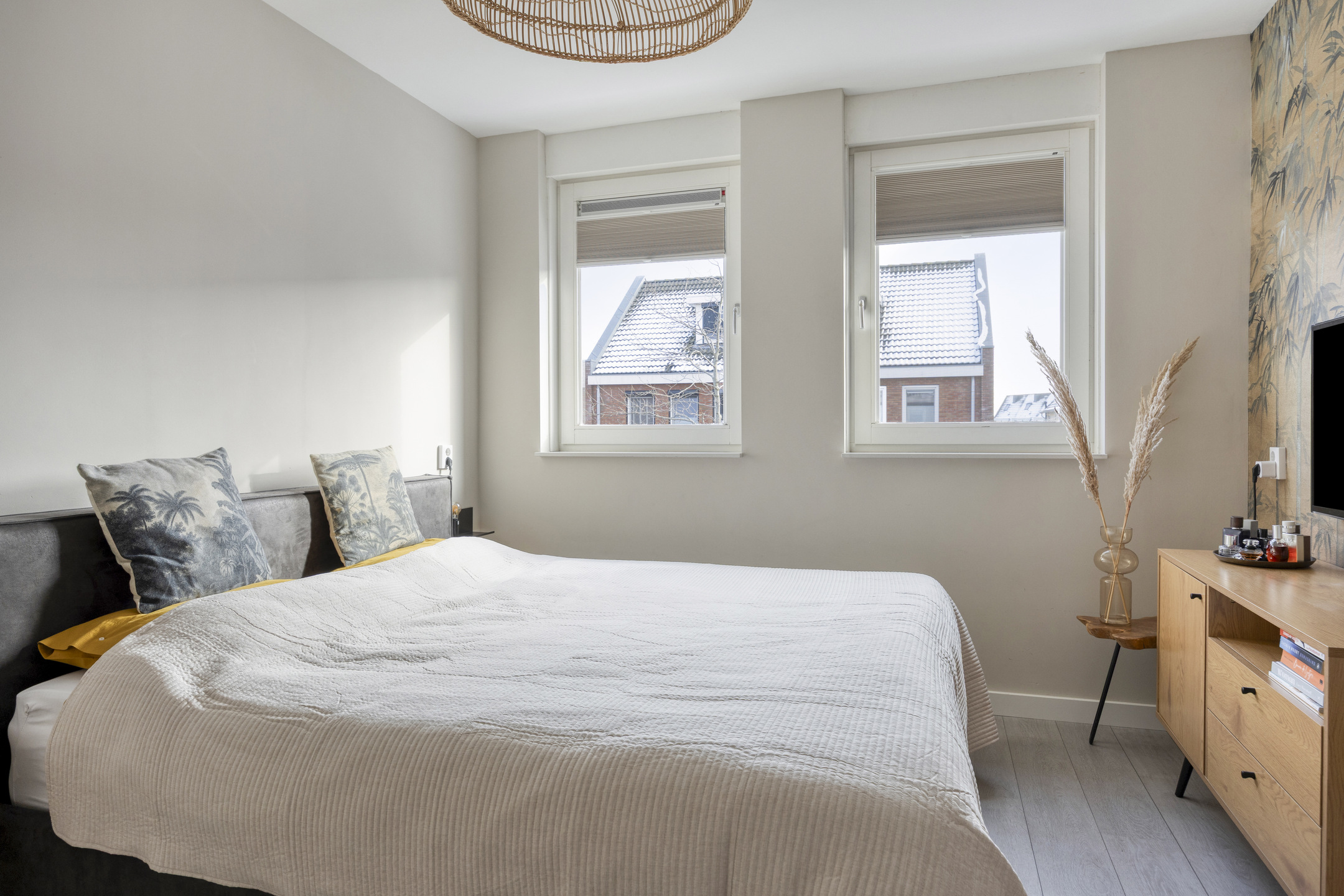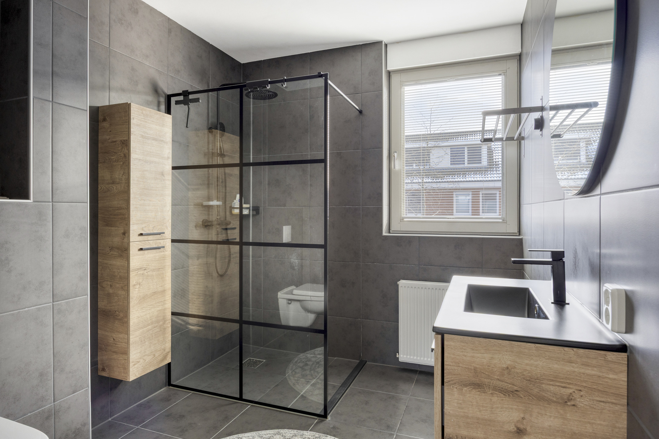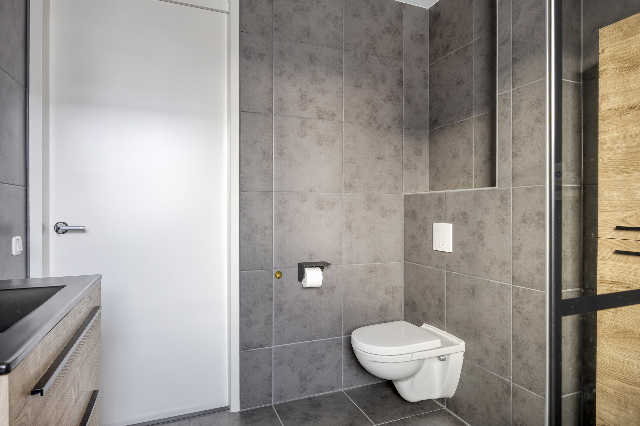 Vanaf de overloop zijn de 3 slaapkamers, de badkamer en de 2e verdieping bereikbaar middels een vaste trap. De slaapkamers zijn stuk voor stuk lekker ruim en beschikken over eenzelfde laminaatvloer, wat het geheel een rustige uitstraling geeft. De grootste slaapkamer, die aan de voorzijde van de woning is gesitueerd, beschikt over een vaste schuifwandenkast. De badkamer is van vloer tot plafond betegeld in een grijze kleurstelling en is ingericht met een inloopdouche, een zwevend toilet, een radiator en een wastafel met meubel. De gehele 1e verdieping is voorzien van comfortabele vloerverwarming.