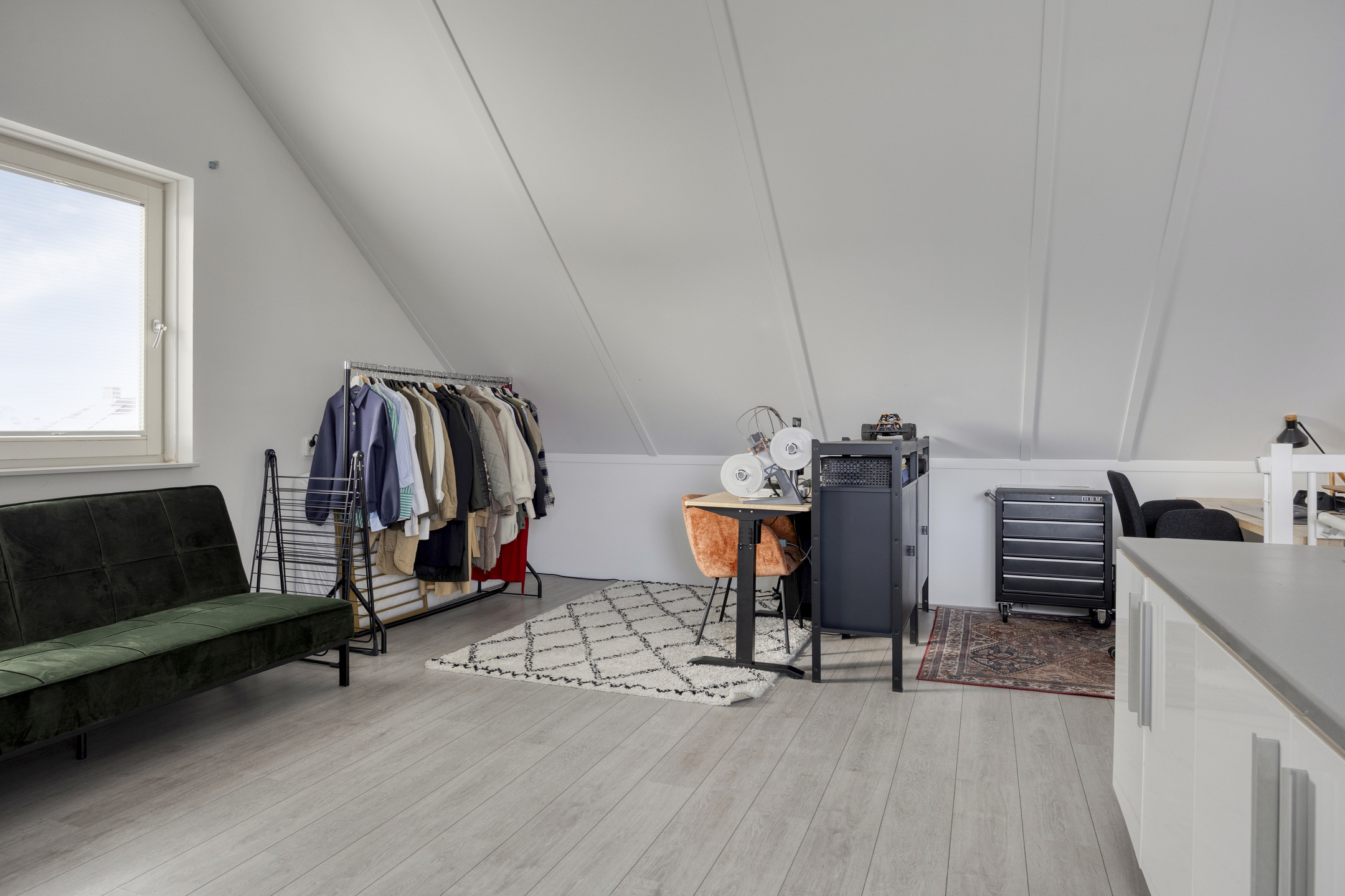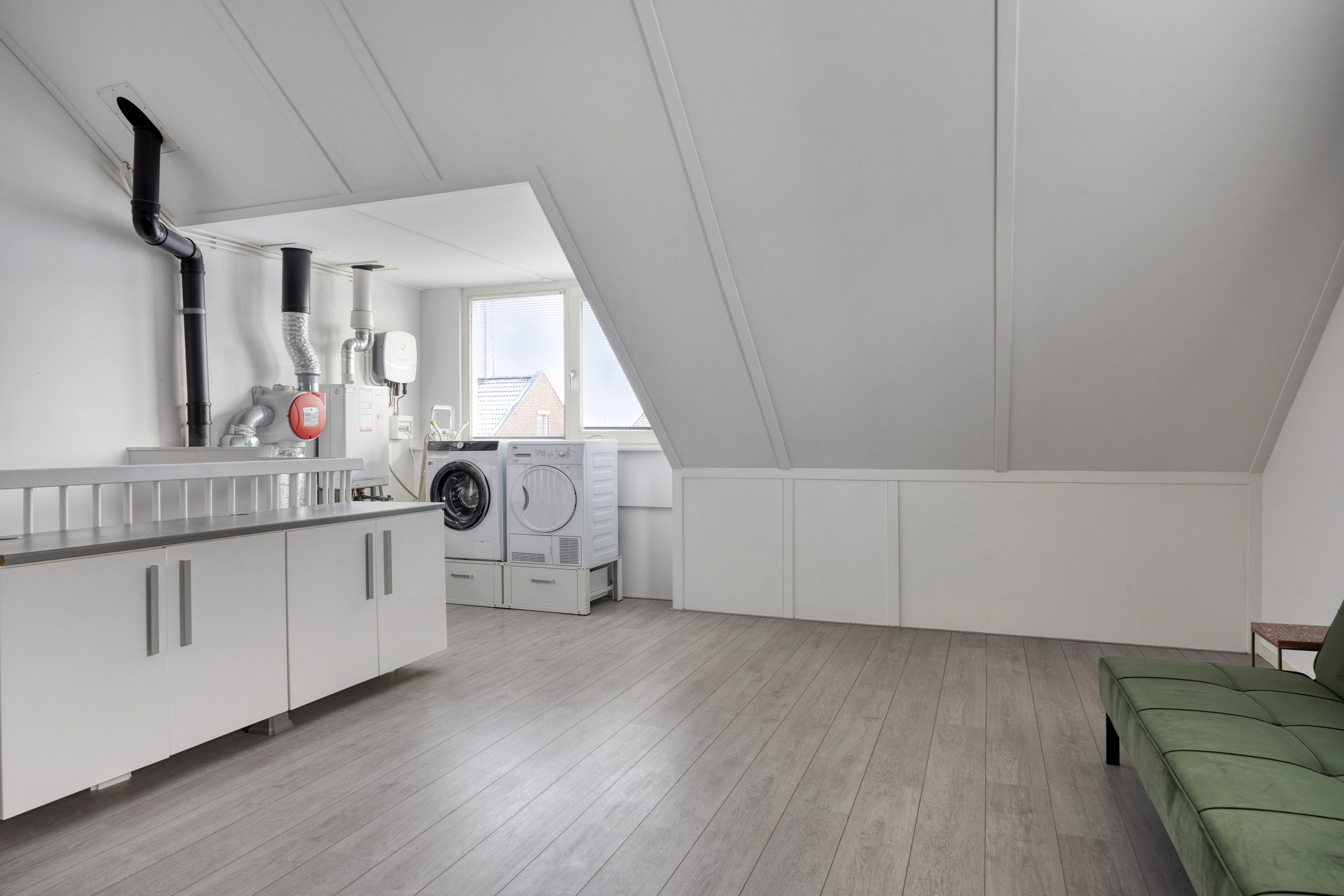 Neem de vaste trap en je bereikt de zolderverdieping, die op dit moment is ingericht als 1 grote, open ruimte waar je nog alle kanten mee op kunt! Je treft hier de aansluitingen voor de was- en droogapparatuur, de omvormer voor de zonnepanelen, de opstelling voor de cv-installatie en de mv-unit. De zolder is eveneens voorzien van een laminaatvloer en achter de knieschotten heb je extra bergruimte tot je beschikking.