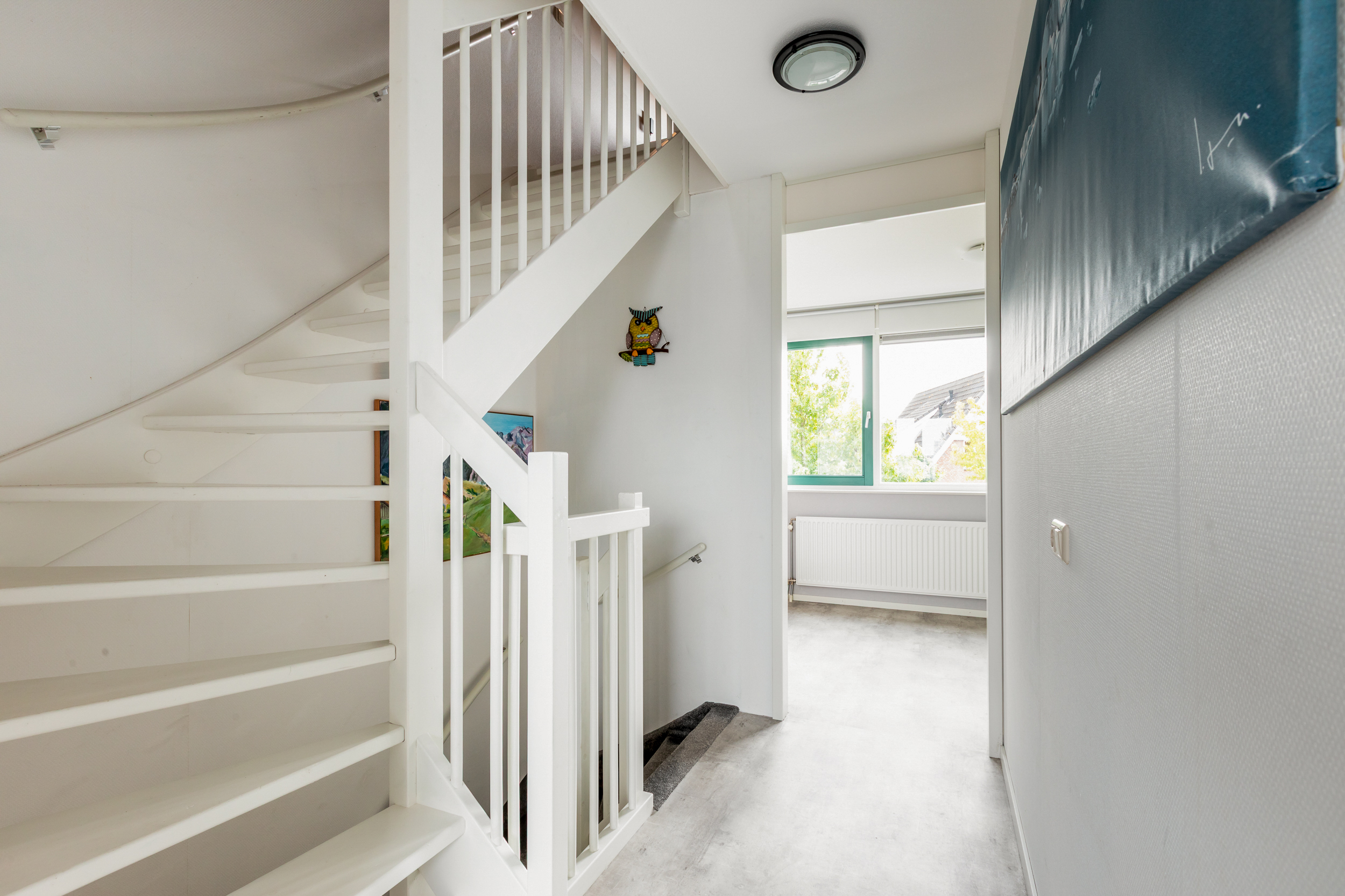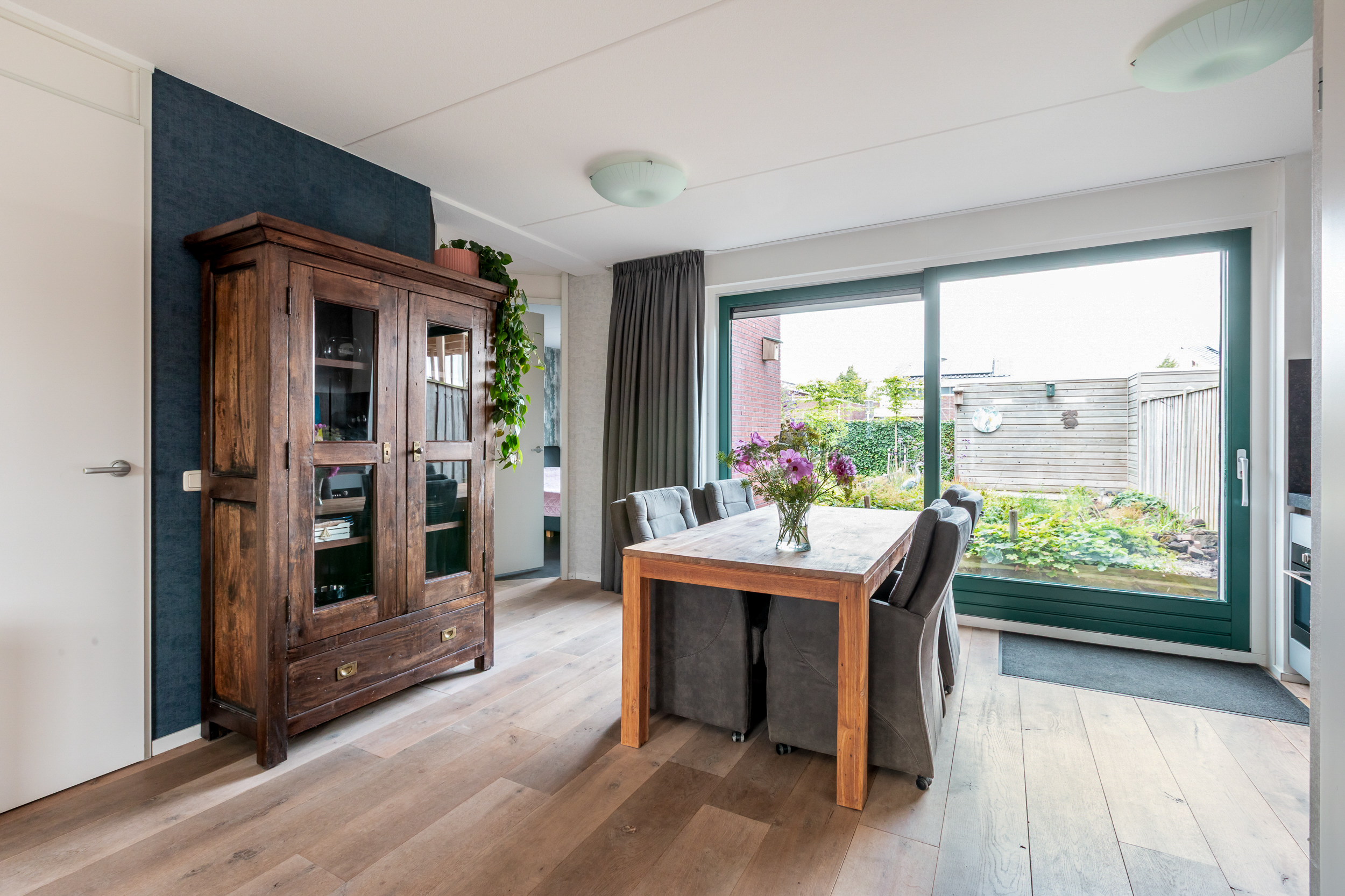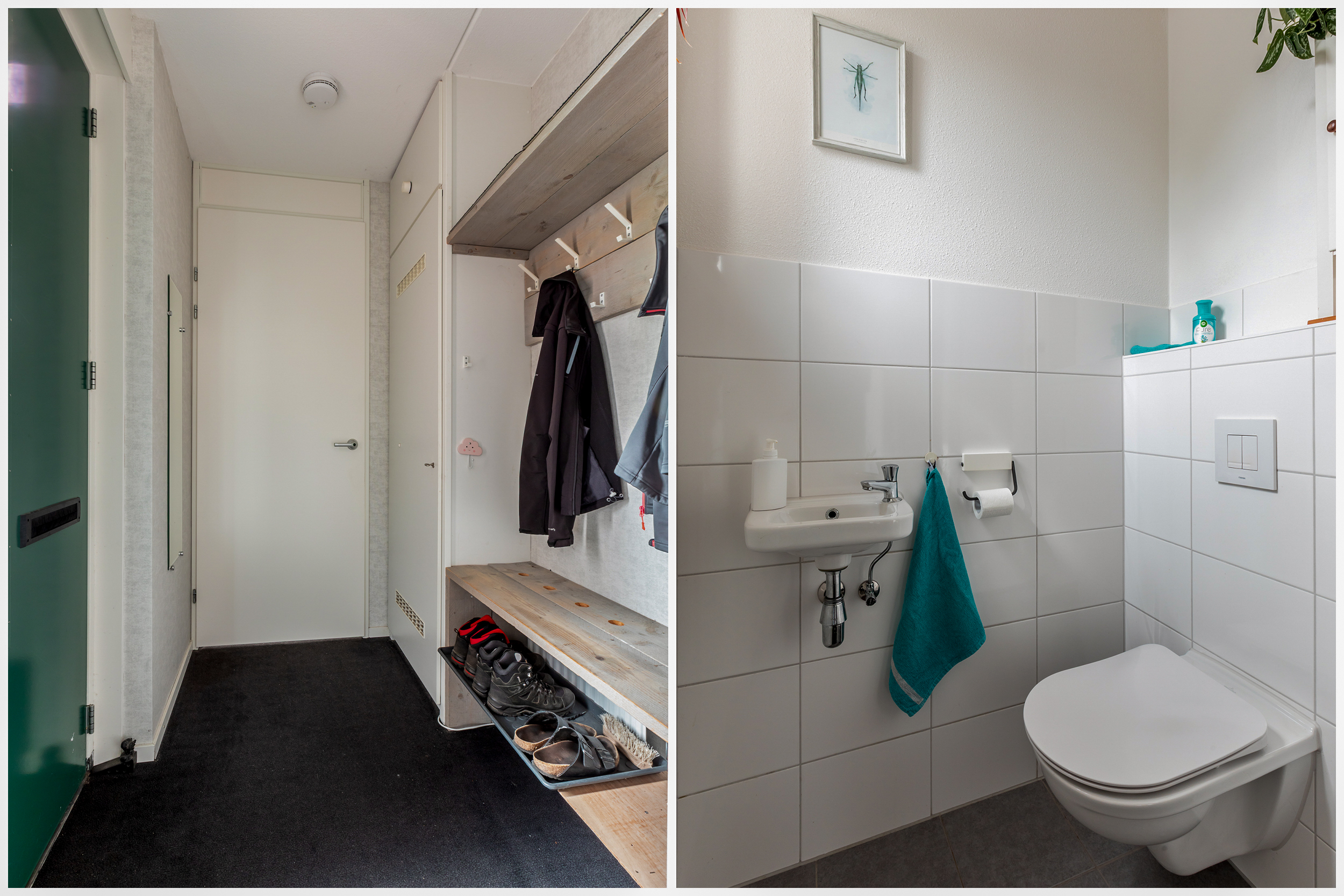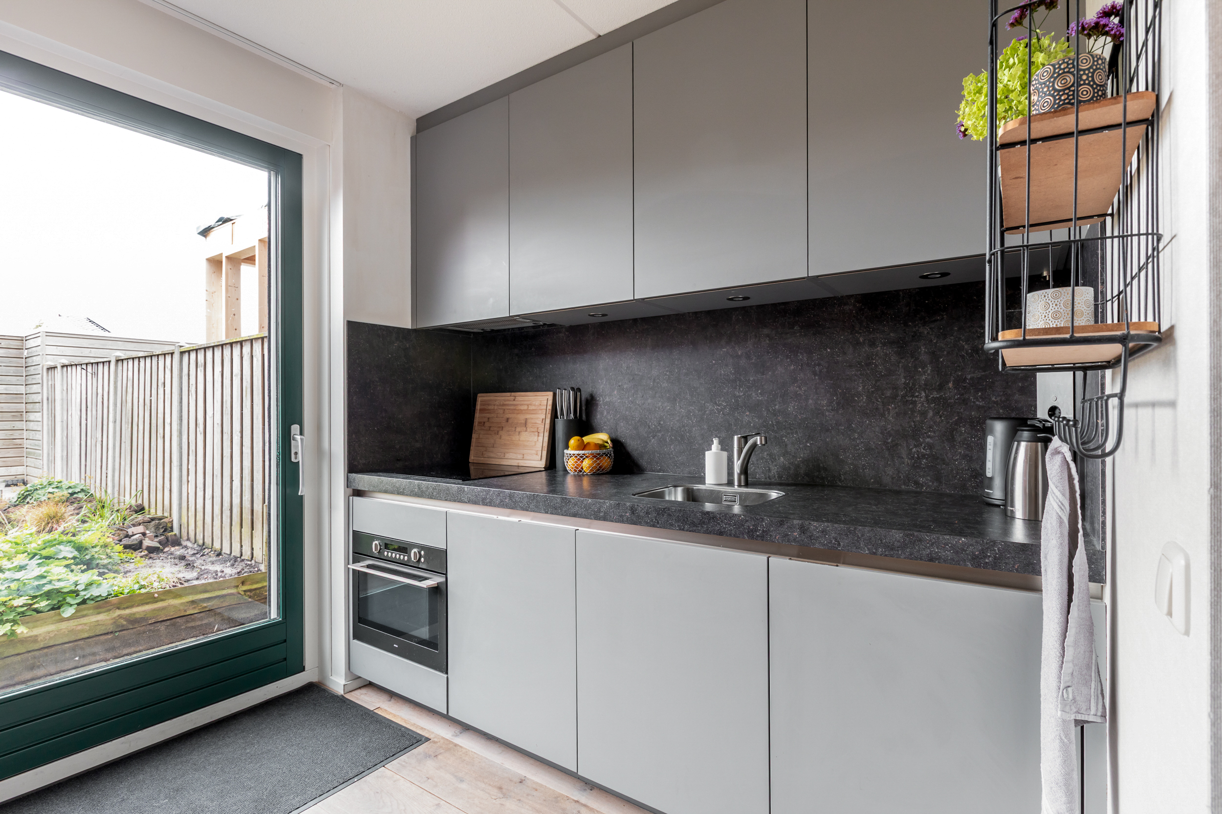 Binnenkomst in de hal met de garderobe, de meterkast, de toegang tot de woonkamer en de toiletruimte. De toiletruimte is betegeld in een rustige kleurstelling en is voorzien van een zwevend toilet en een fonteintje. Bij binnenkomst in de woonkamer is het vele daglicht en het zicht op de groen aangelegde achtertuin hetgeen dat meteen opvalt. Wat een fijne plek is dit! De zithoek is straatgericht, voorzien van ramen tot aan de grond en beschikt over een houten vloer, die tot in de eethoek en de keuken is doorgelegd. Fijne extra: er is een ruime trapkast aanwezig! De keuken is in een rechte opstelling uitgevoerd en beschikt over spotjes en inbouwapparatuur zoals een koelkast, een 4-pits inductiekookplaat, een vlakscherm afzuigkap, een vaatwasser en een combi-oven. De grote schuifpui bij de eethoek zorgt voor fijn zicht op de tuin.