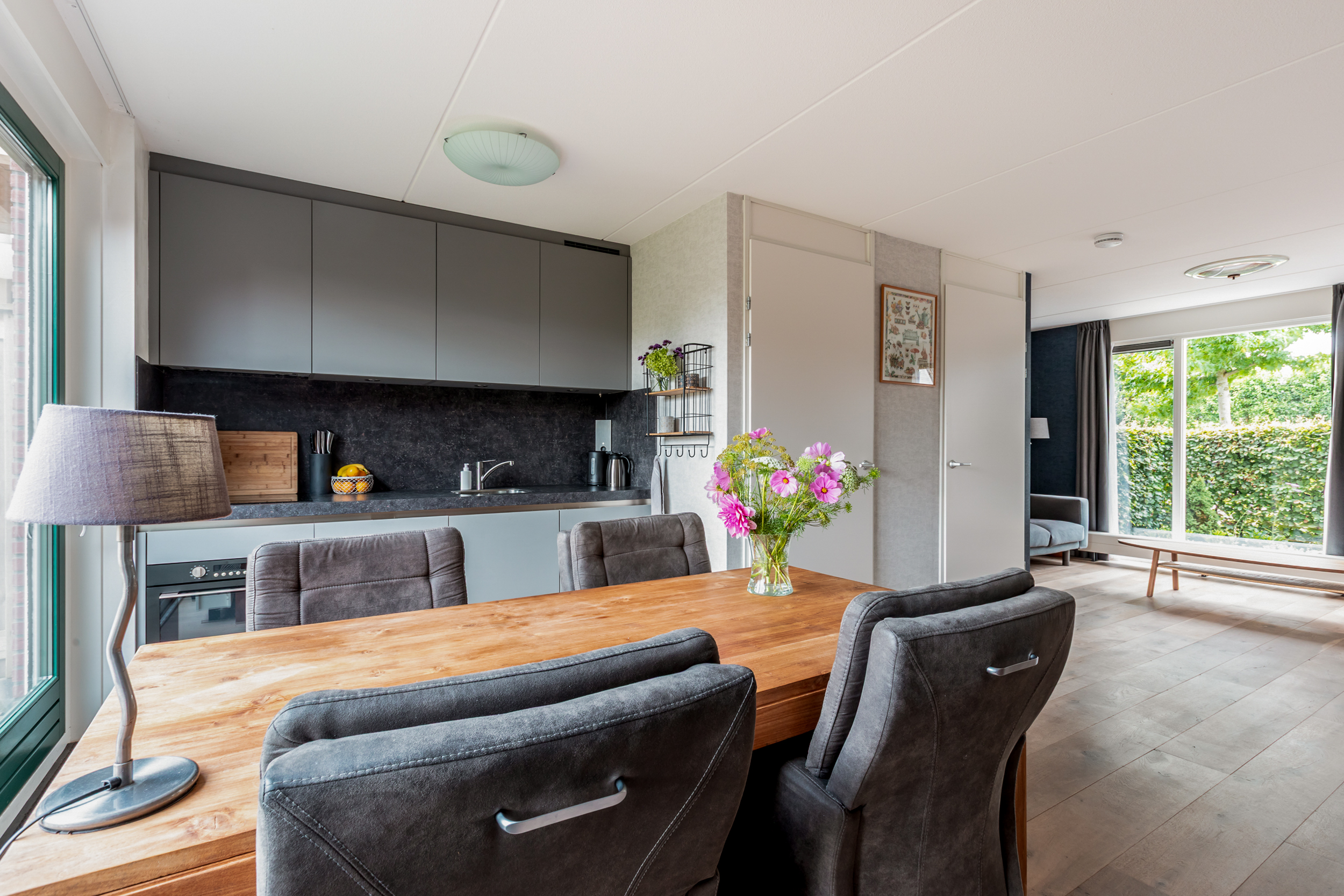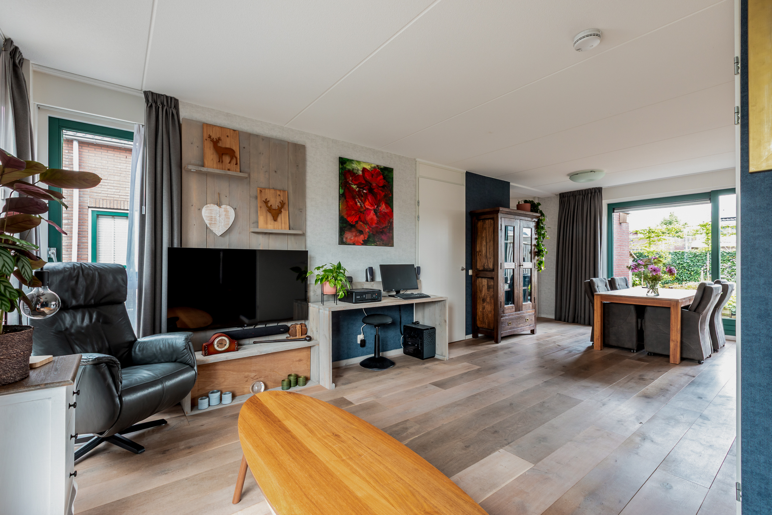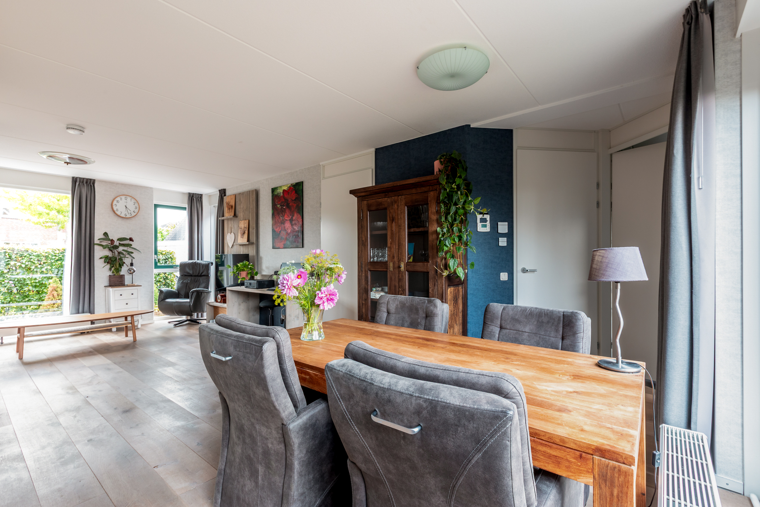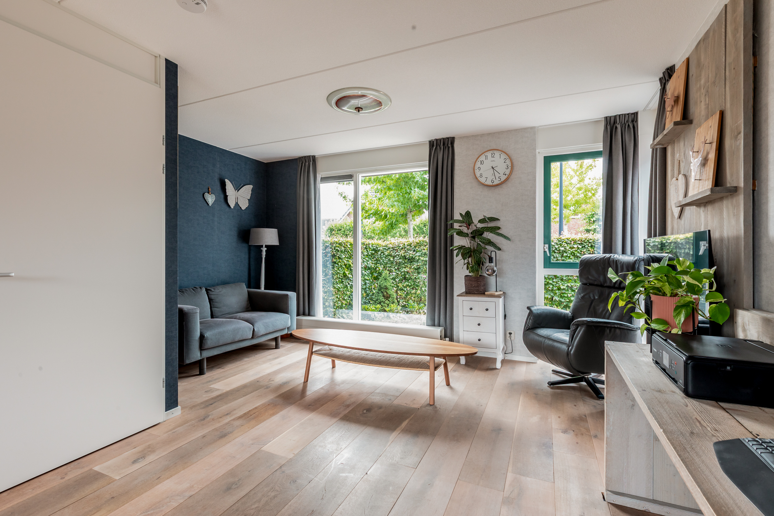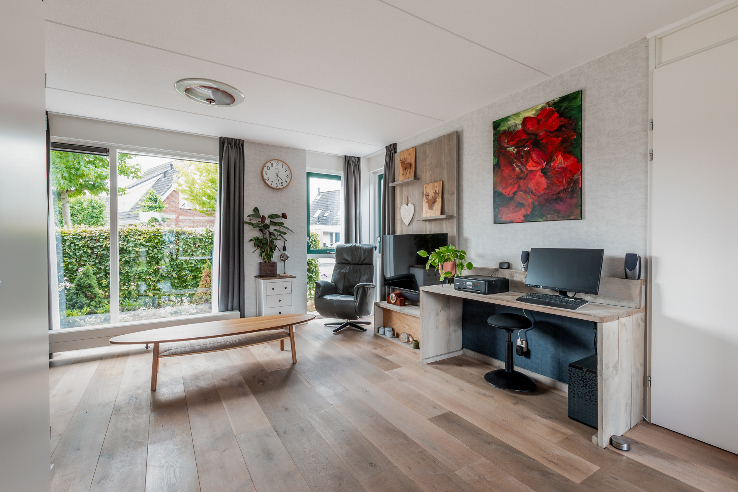 Binnenkomst in de hal met de garderobe, de meterkast, de toegang tot de woonkamer en de toiletruimte. De toiletruimte is betegeld in een rustige kleurstelling en is voorzien van een zwevend toilet en een fonteintje. Bij binnenkomst in de woonkamer is het vele daglicht en het zicht op de groen aangelegde achtertuin hetgeen dat meteen opvalt. Wat een fijne plek is dit! De zithoek is straatgericht, voorzien van ramen tot aan de grond en beschikt over een houten vloer, die tot in de eethoek en de keuken is doorgelegd. Fijne extra: er is een ruime trapkast aanwezig! De keuken is in een rechte opstelling uitgevoerd en beschikt over spotjes en inbouwapparatuur zoals een koelkast, een 4-pits inductiekookplaat, een vlakscherm afzuigkap, een vaatwasser en een combi-oven. De grote schuifpui bij de eethoek zorgt voor fijn zicht op de tuin.