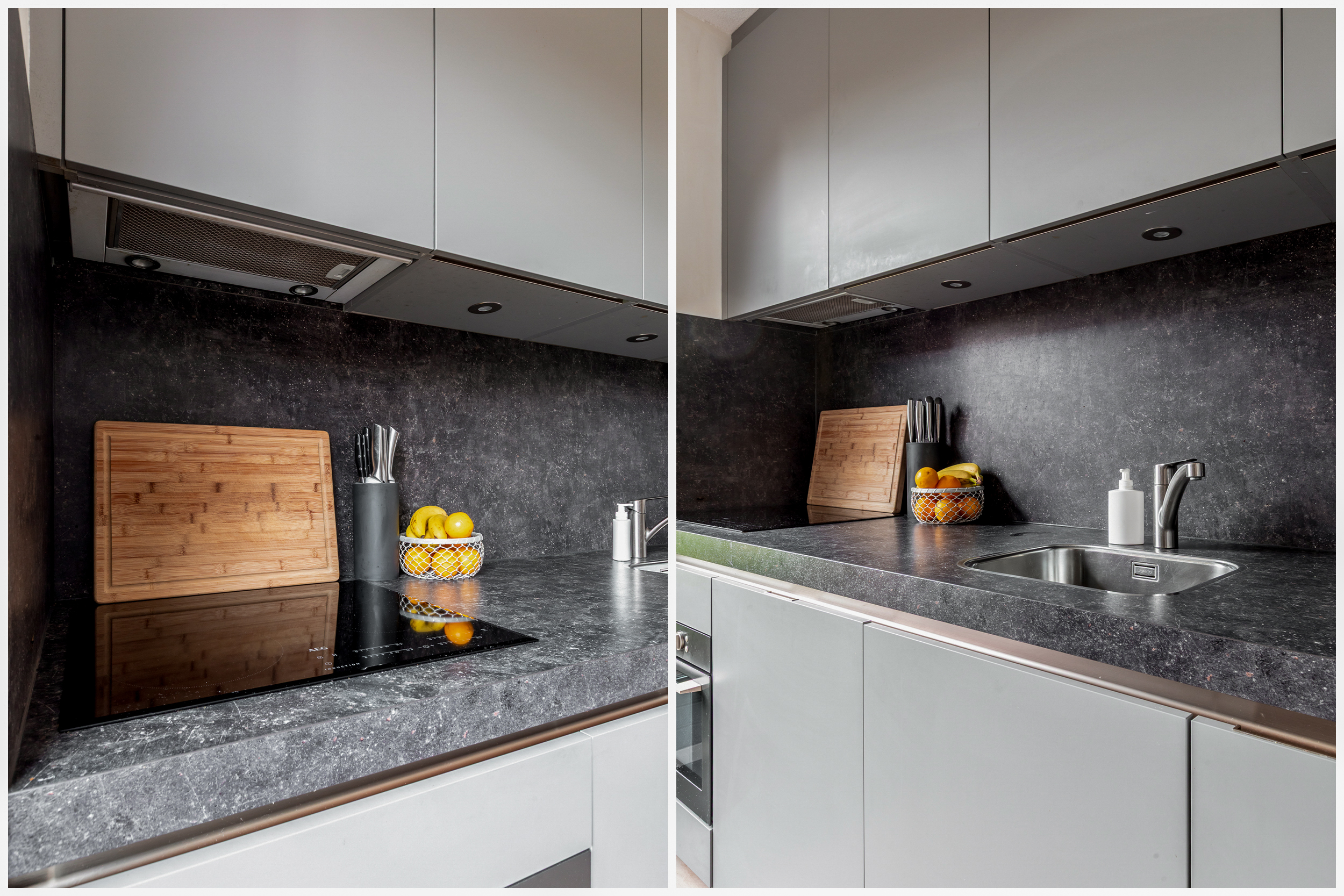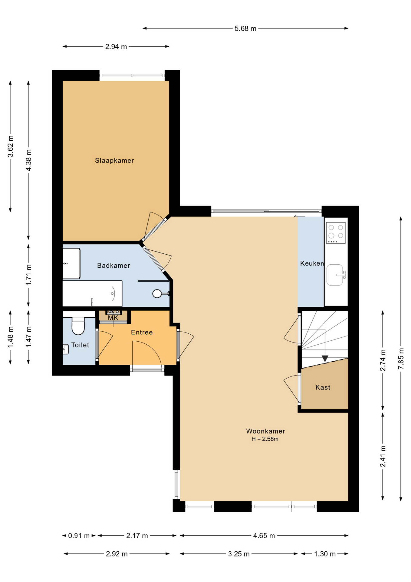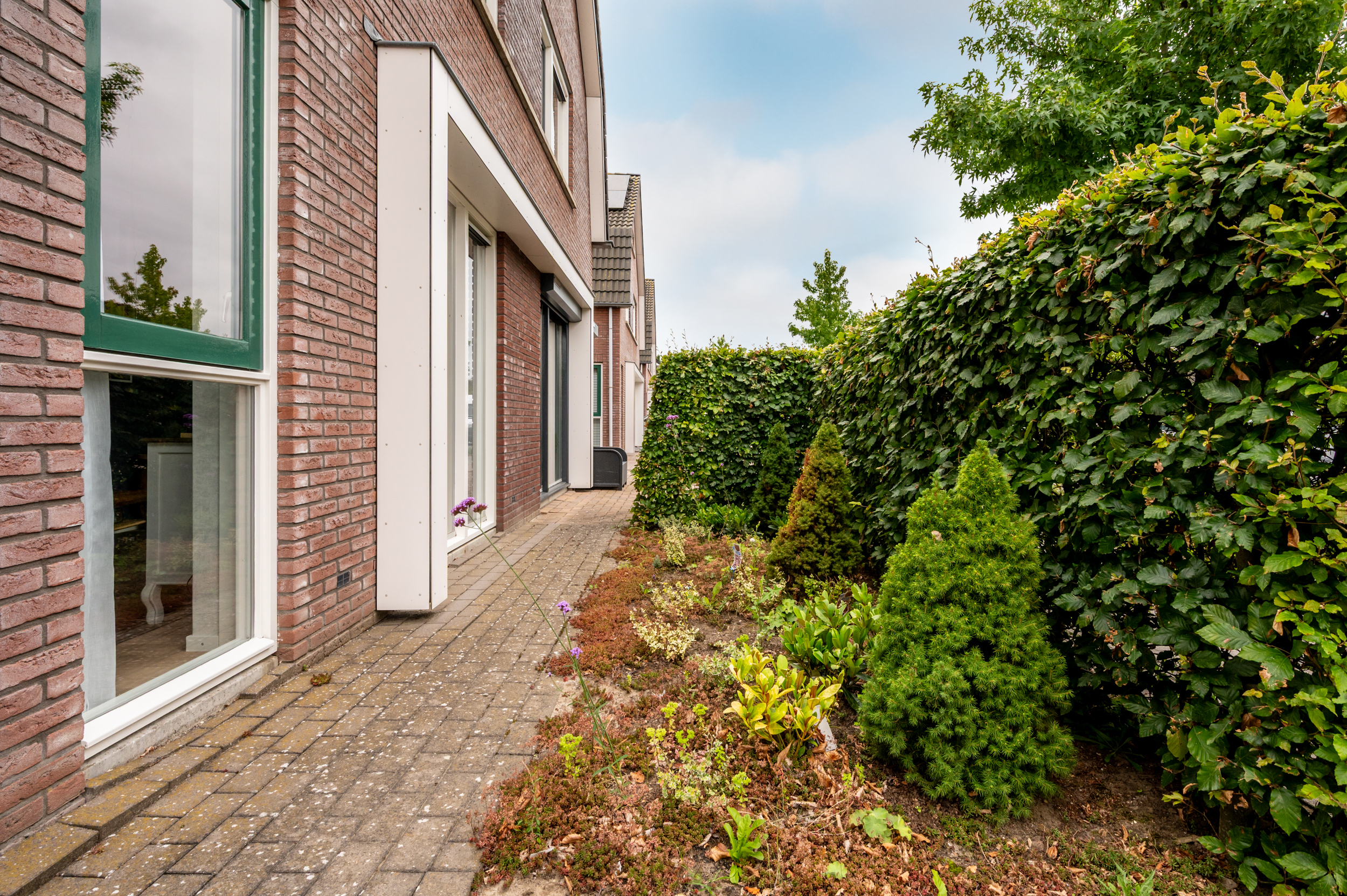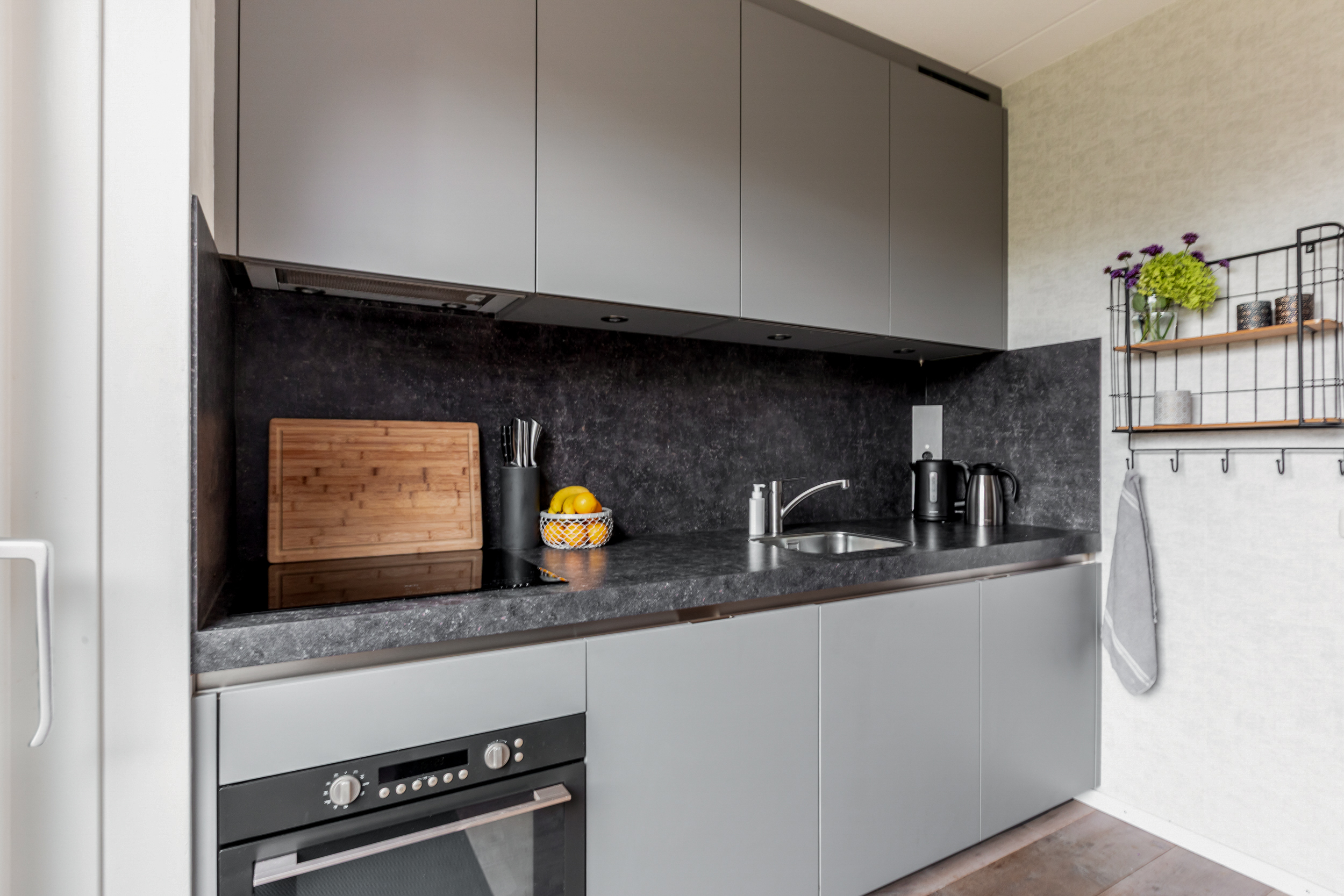 Binnenkomst in de hal met de garderobe, de meterkast, de toegang tot de woonkamer en de toiletruimte. De toiletruimte is betegeld in een rustige kleurstelling en is voorzien van een zwevend toilet en een fonteintje. Bij binnenkomst in de woonkamer is het vele daglicht en het zicht op de groen aangelegde achtertuin hetgeen dat meteen opvalt. Wat een fijne plek is dit! De zithoek is straatgericht, voorzien van ramen tot aan de grond en beschikt over een houten vloer, die tot in de eethoek en de keuken is doorgelegd. Fijne extra: er is een ruime trapkast aanwezig! De keuken is in een rechte opstelling uitgevoerd en beschikt over spotjes en inbouwapparatuur zoals een koelkast, een 4-pits inductiekookplaat, een vlakscherm afzuigkap, een vaatwasser en een combi-oven. De grote schuifpui bij de eethoek zorgt voor fijn zicht op de tuin.