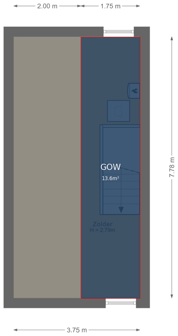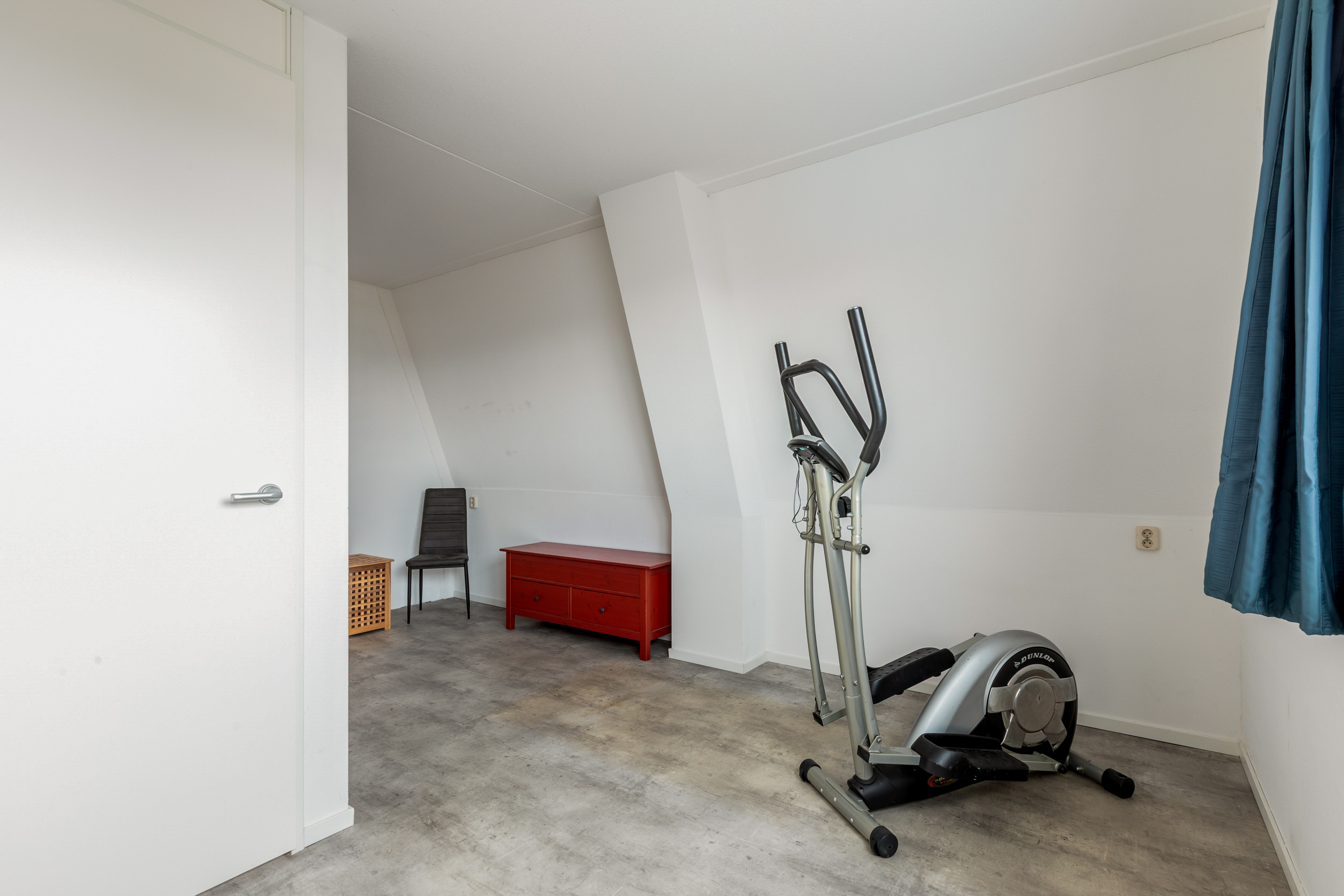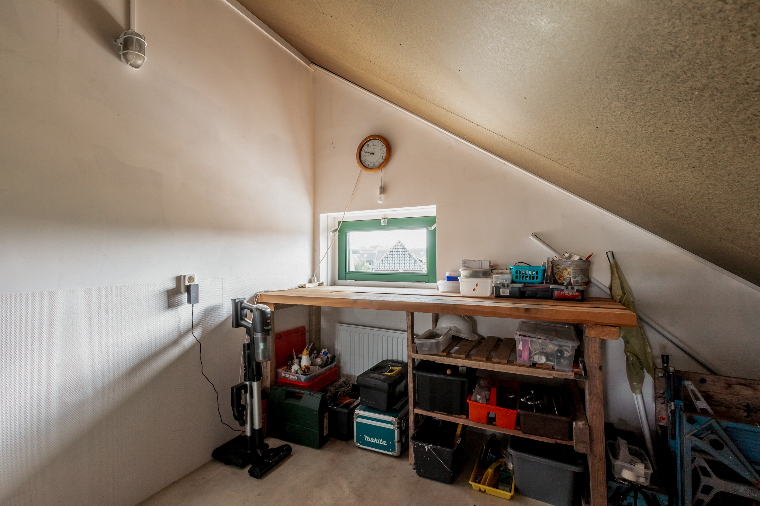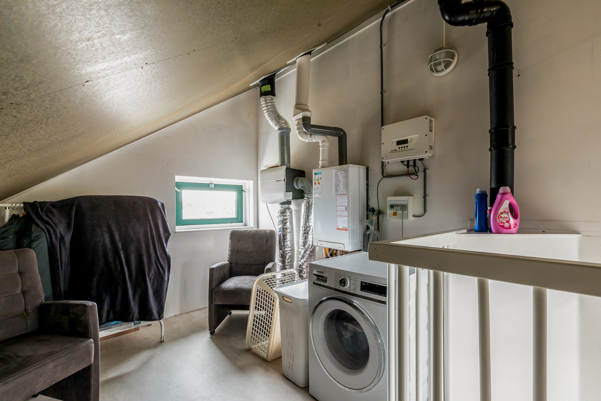 Maak gebruik van de vaste trap en je bereikt de zolderverdieping, die op dit moment ingericht is als 1 grote open ruimte. Dankzij een raam in zowel de voor- als achtergevel beschik je reeds over natuurlijke daglichttoetreding, waardoor je hier gemakkelijk een fijne hobby- of werkplek realiseert. Je treft hier tevens een vinylvloer, de opstelling voor de cv-installatie, de omvormer voor de zonnepanelen, de mv-unit en de aansluitingen voor de was- en droogapparatuur.