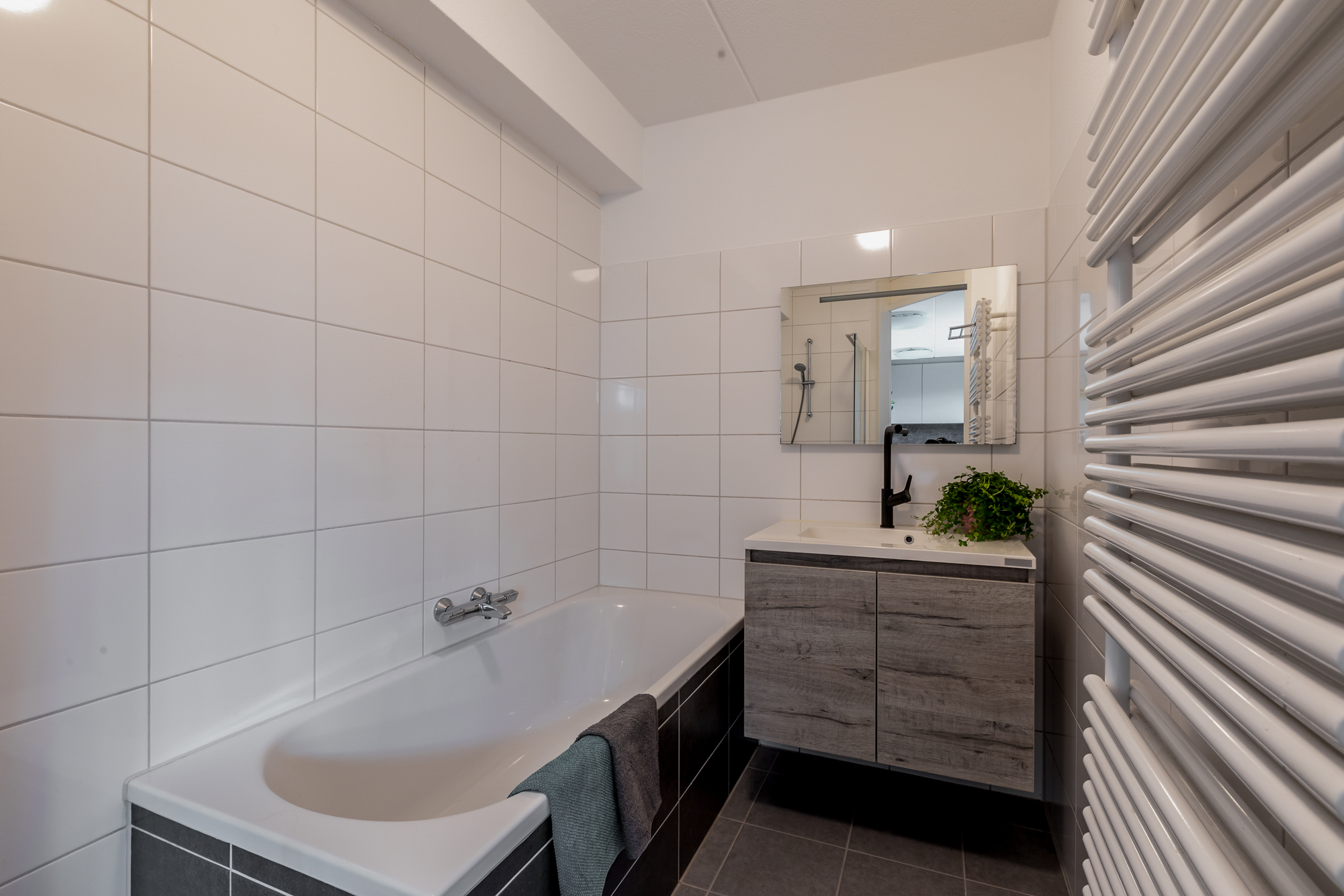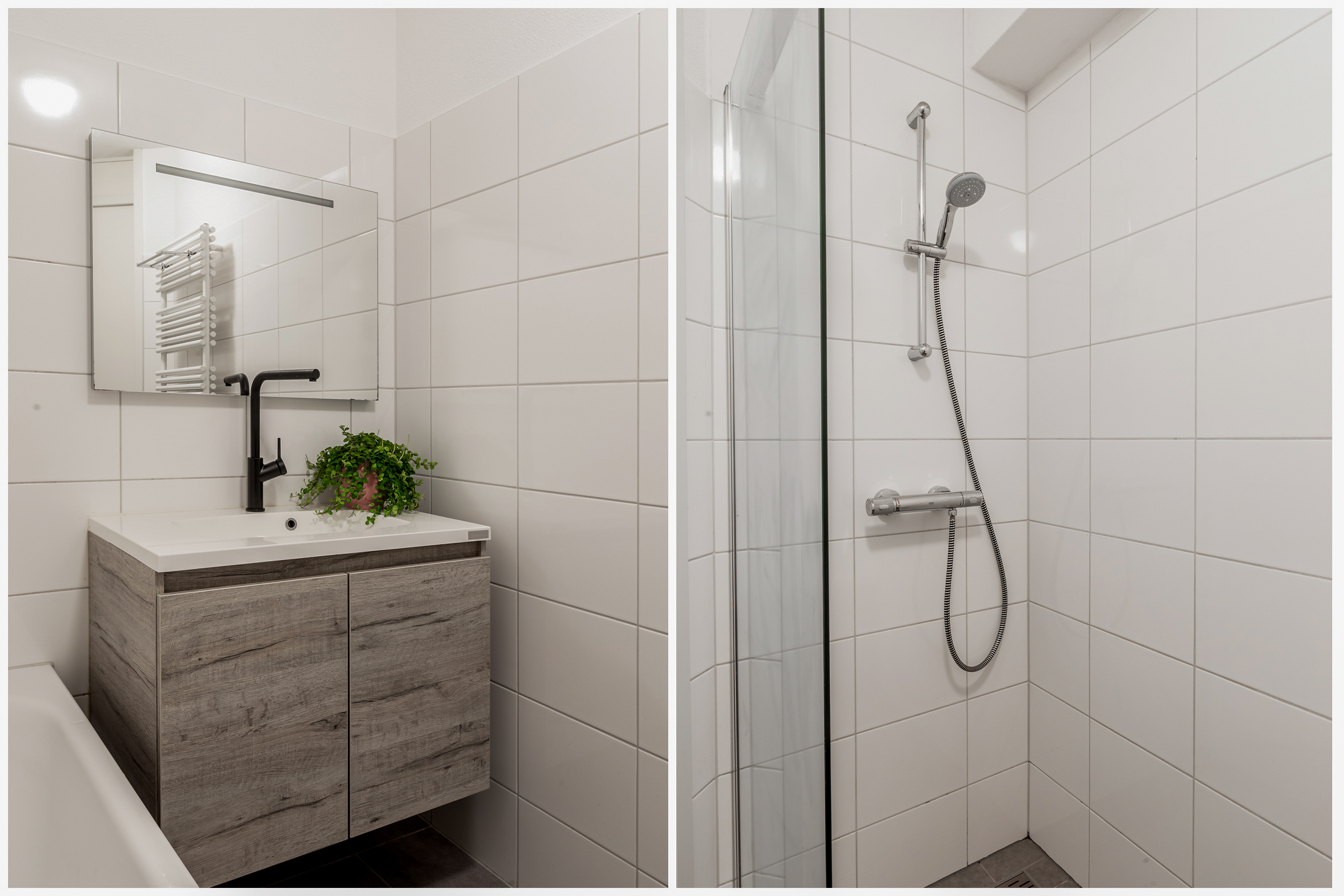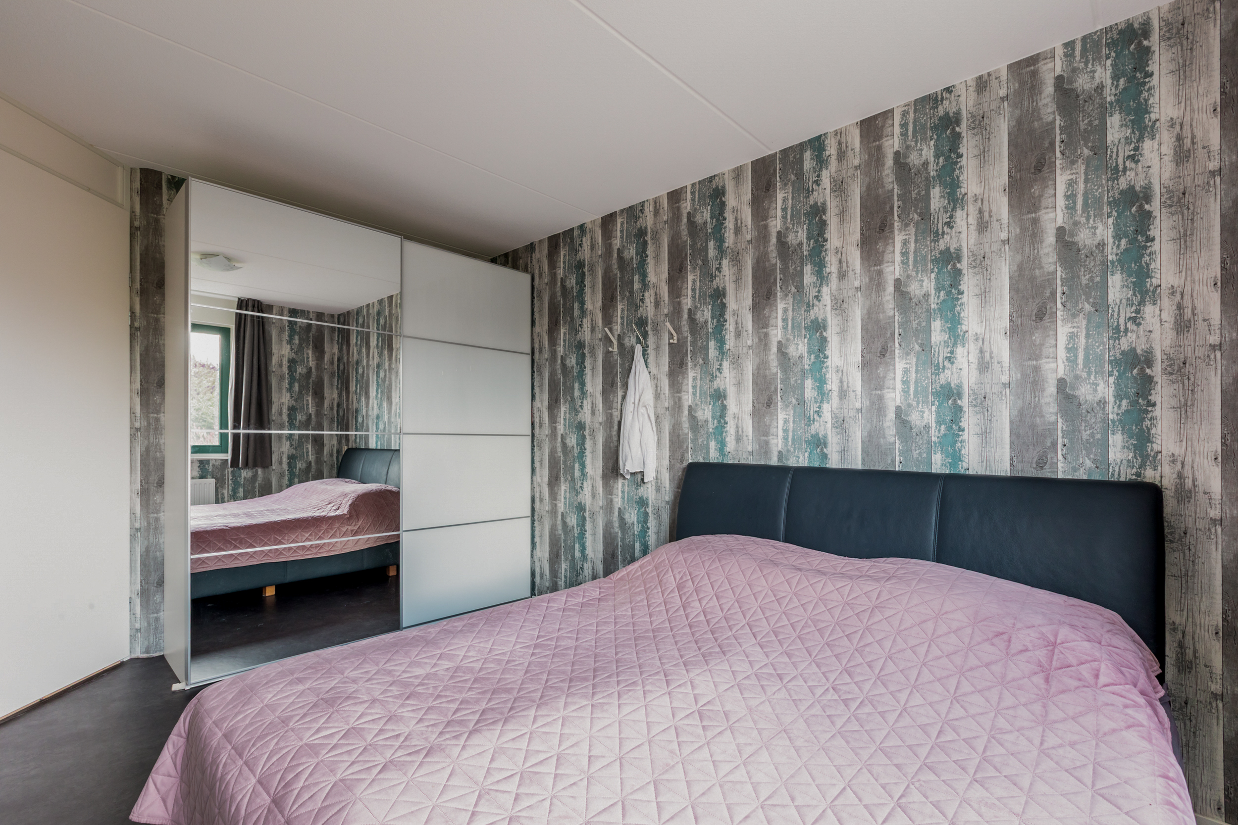 Aansluitend aan de eethoek zijn de bad- en slaapkamer bereikbaar, die beiden een prettig formaat hebben. De badkamer is van vloer tot plafond betegeld en ingericht met een ligbad, een inloopdouche met glazen wand, een designradiator, een wastafel met meubel en een spiegel met verlichting. De slaapkamer is tuingericht en beschikt over grote raampartijen en een vinylvloer.