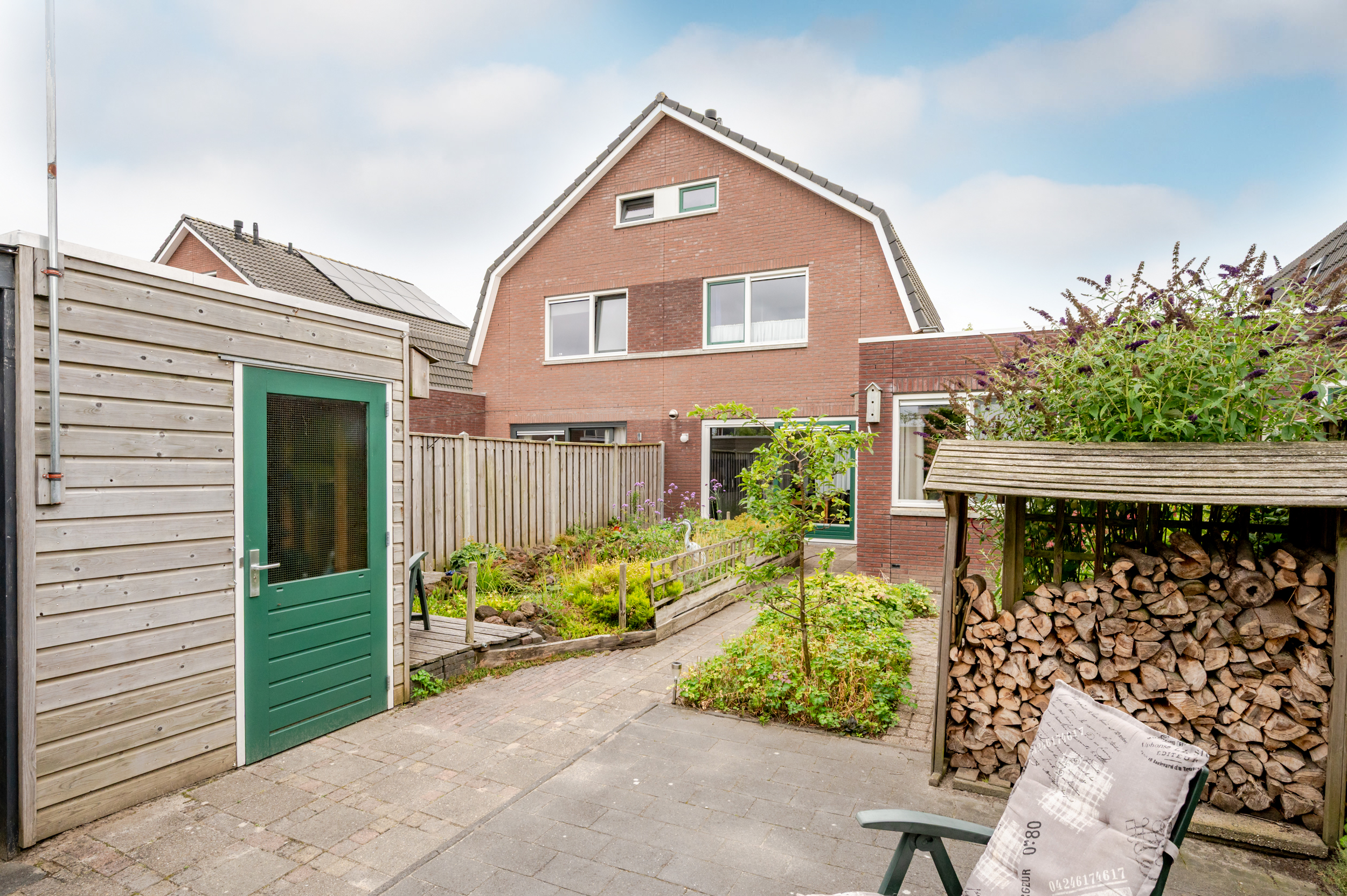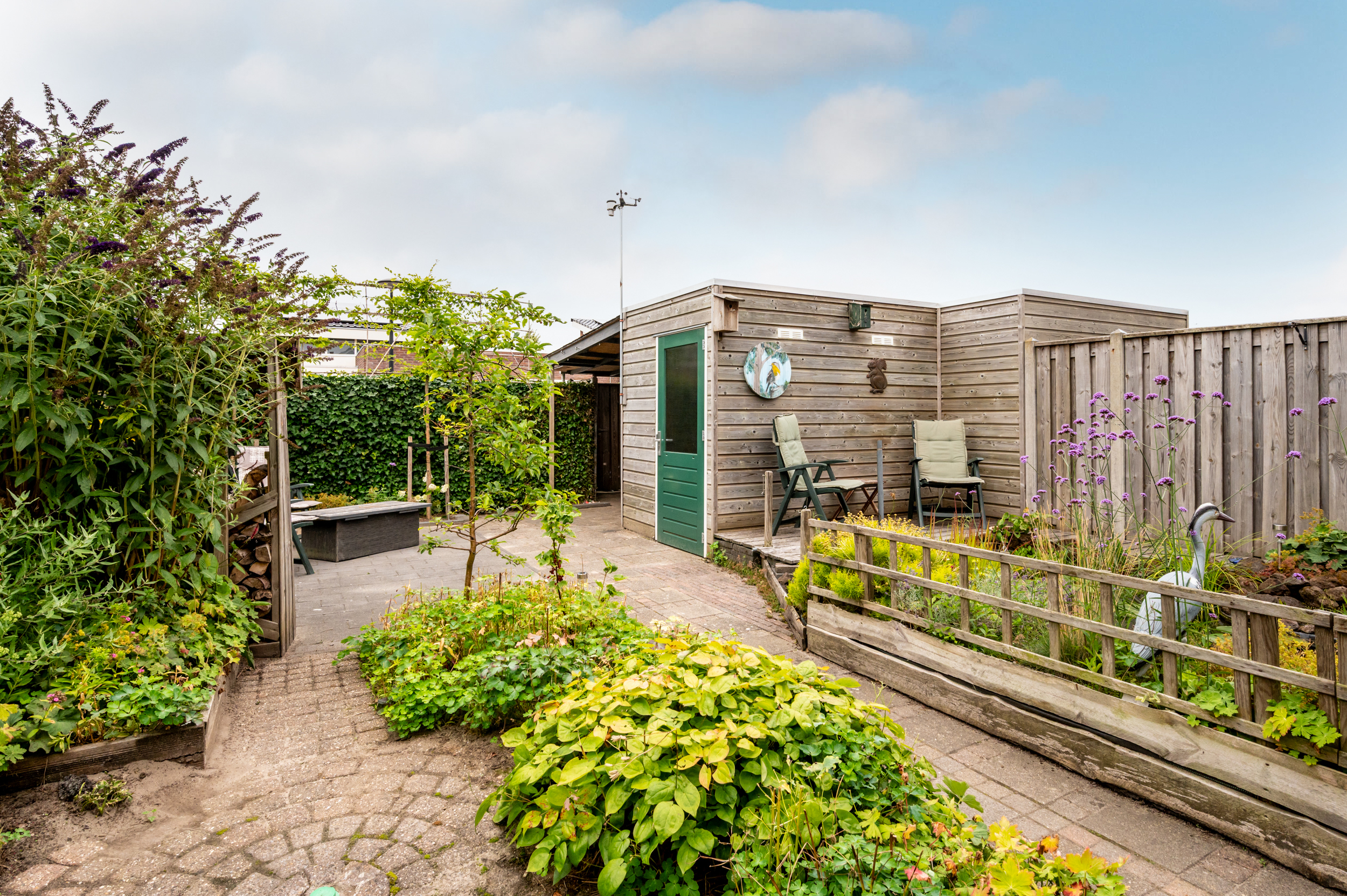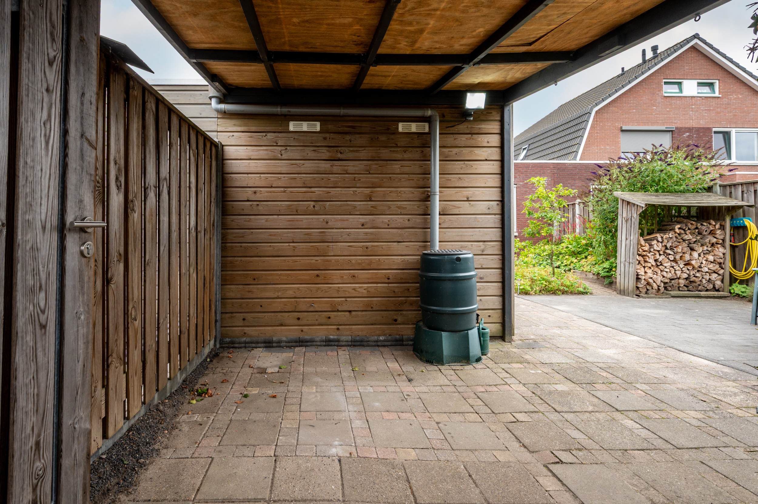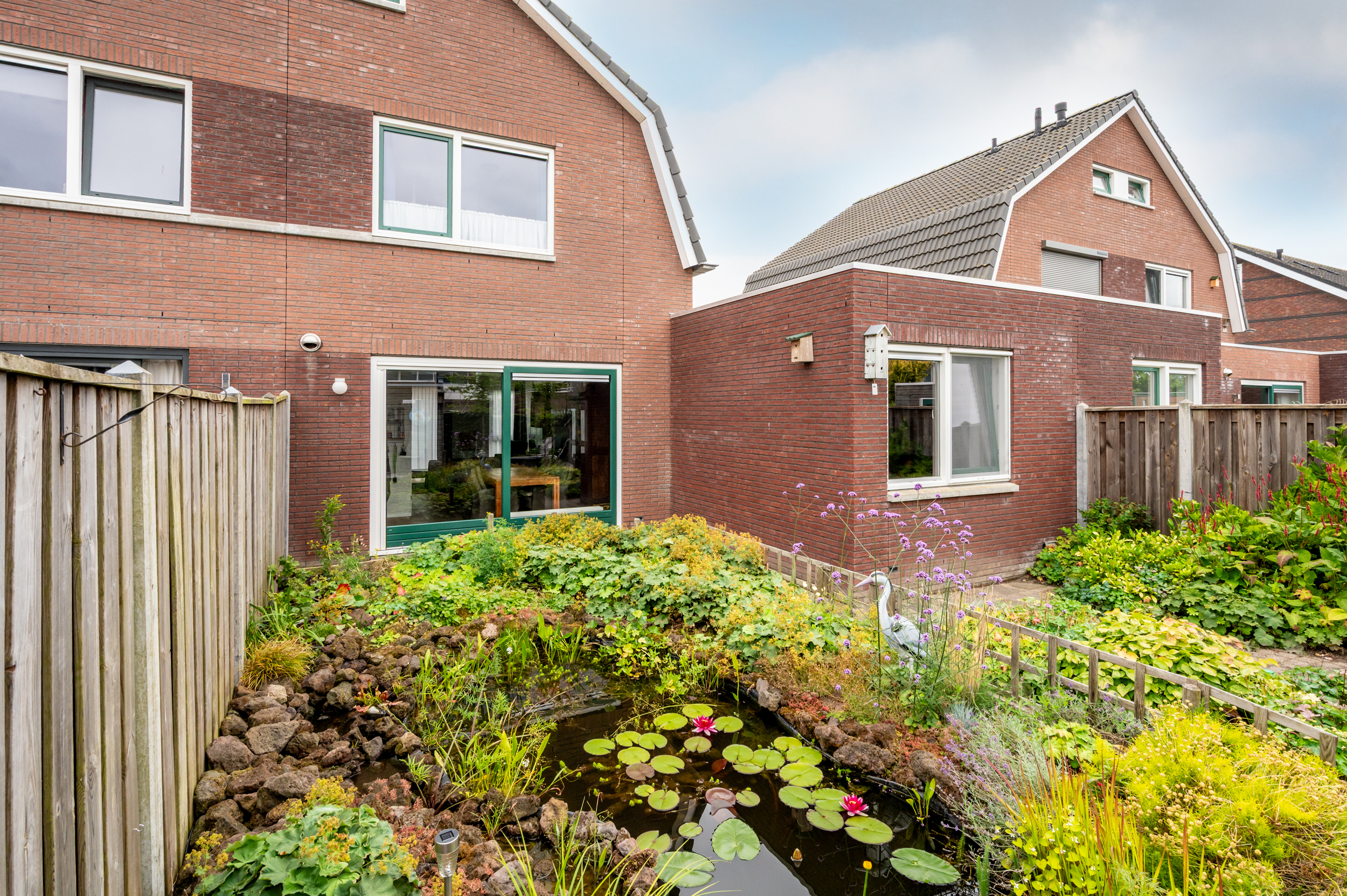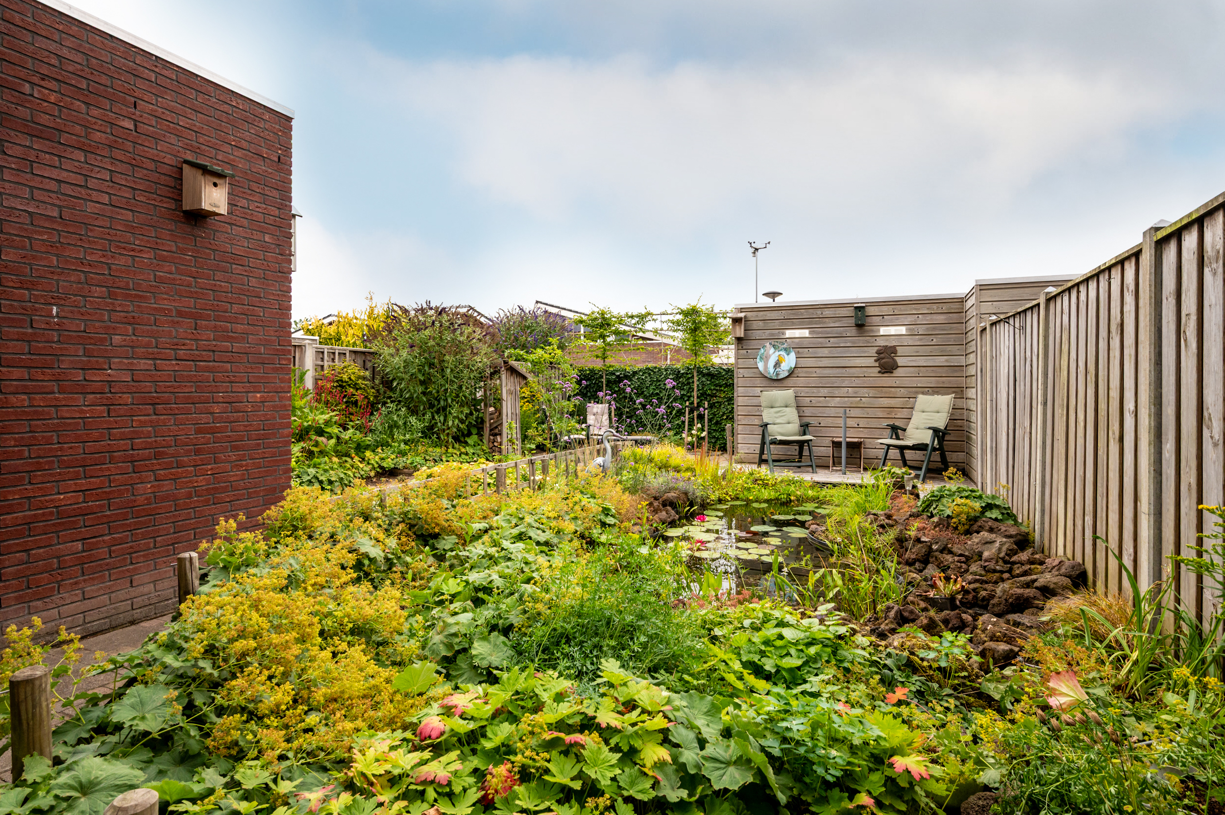 In deze diepe, op het noordoosten gesitueerde achtertuin is het volop genieten! Neem plaats in het zonnetje bij de vijver of ontvang familie en vrienden onder het genot van een gezellige barbecue. Er is ruimte genoeg! De tuin is aangelegd met verschillende soorten beplanting, bestrating en achter in de tuin bevindt zich een houten berging (voorzien van elektra) met aansluitend een overkapping voor de fietsen en de containers. Even de container aan de weg zetten? Dan maak je gemakkelijk gebruik van de afsluitbare, brede achterom!