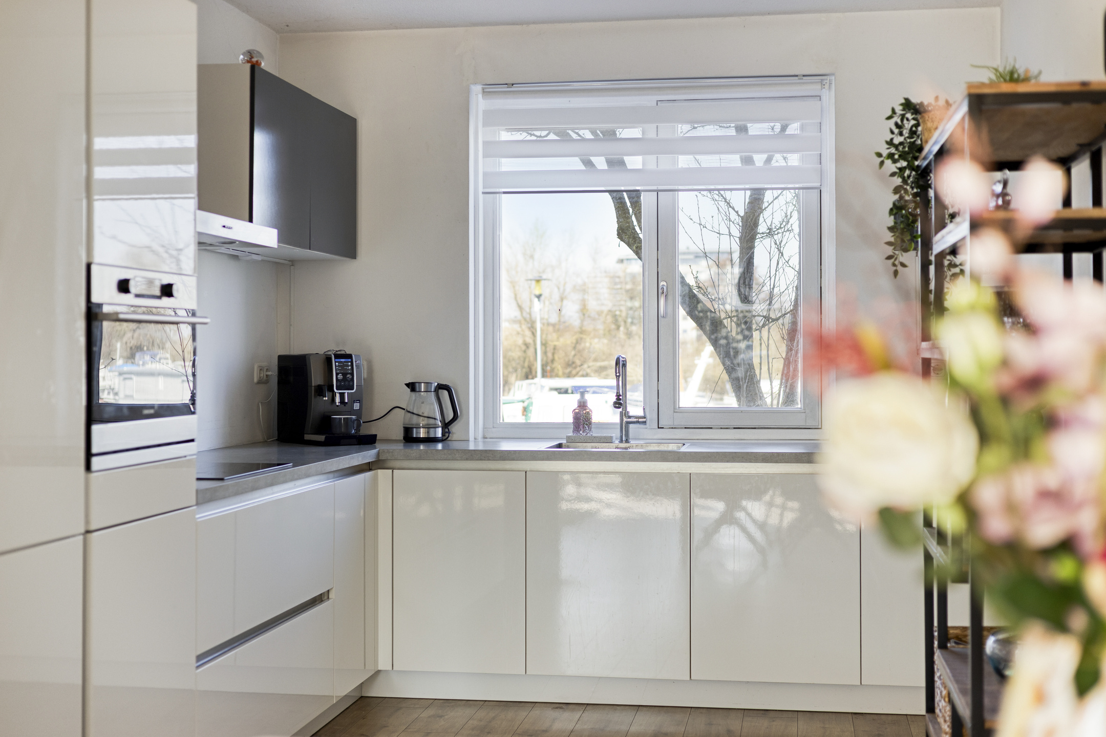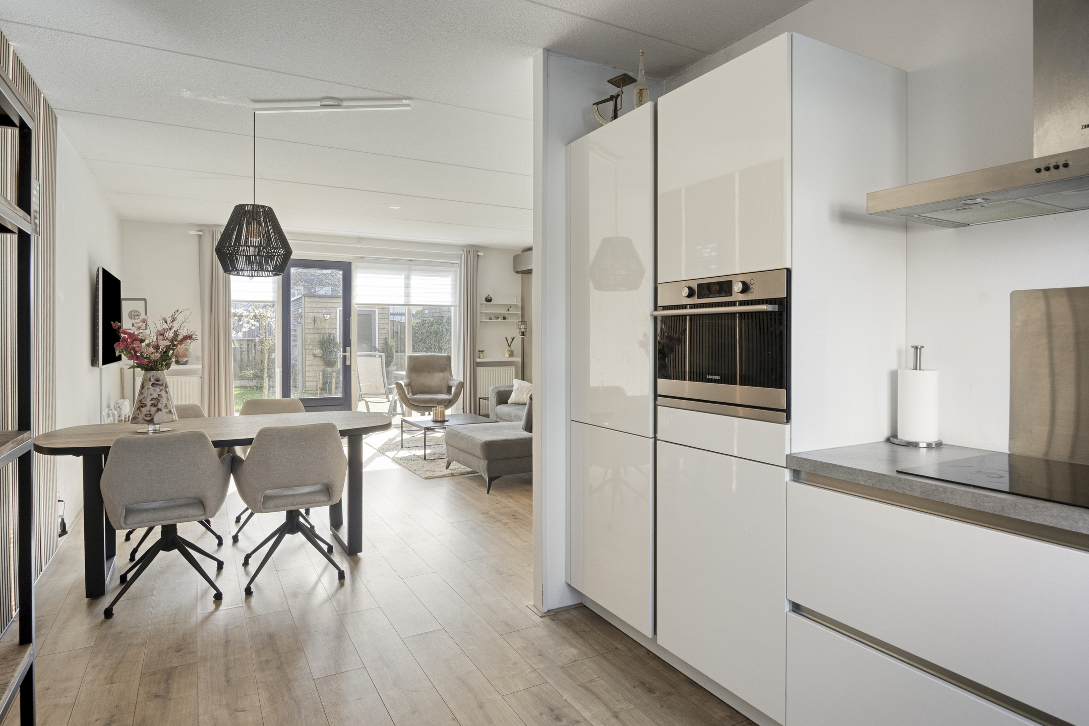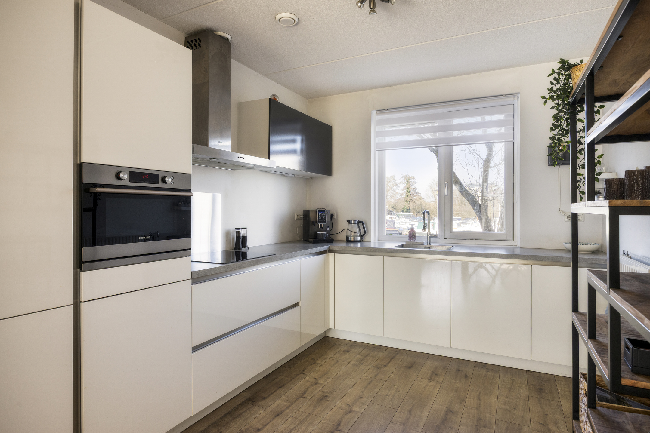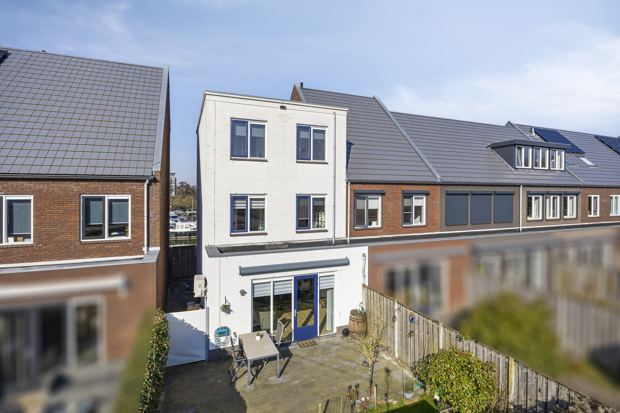 Lopend langs het water stap je de voortuin in, waar het direct genieten is. Neem plaats, ontspan en kijk uit over de voorbijvarende boten. Je komt binnen in de hal met de meterkast, de trapopgang naar de 1e verdieping, de toegang tot de woonkamer en de toiletruimte, die is betegeld in een rustige kleurstelling en is voorzien van een zwevend toilet en een fonteintje. Bij binnenkomst in de woonkamer is de zonnige ligging aan de achterzijde hetgeen wat meteen opvalt. Wat een daglicht! Dankzij de grote raampartijen voelt de ruimte heerlijk open aan en sta je direct in verbinding met de tuin. Hier heb je voldoende ruimte voor het plaatsen van een comfortabele zithoek en verder tref je hier een airconditioning (2025, kan tevens verwarmen), een praktische trapkast, een deur naar de tuin en een nette laminaatvloer. De eethoek staat in open verbinding met de hoekkeuken, die aan de voorzijde van de woning is gesitueerd. De kleuren van de keuken zijn modern en rustig en de aanwezige inbouwapparatuur betreft een koel-/vriescombinatie, een vaatwasser, een combimagnetron, een 4-pits inductiekookplaat en een RVS afzuigschouw. Wat het geheel écht bijzonder maakt, is het prachtige uitzicht op het water vanuit de keuken.