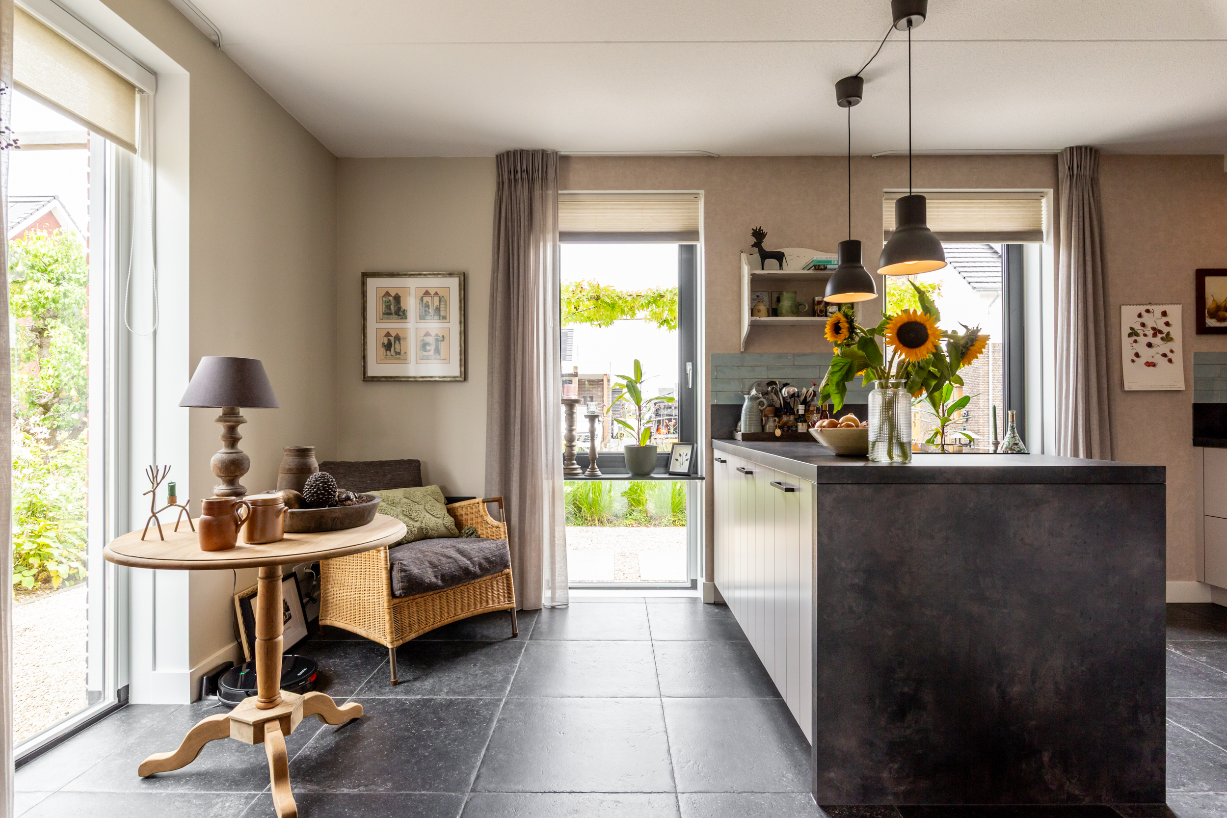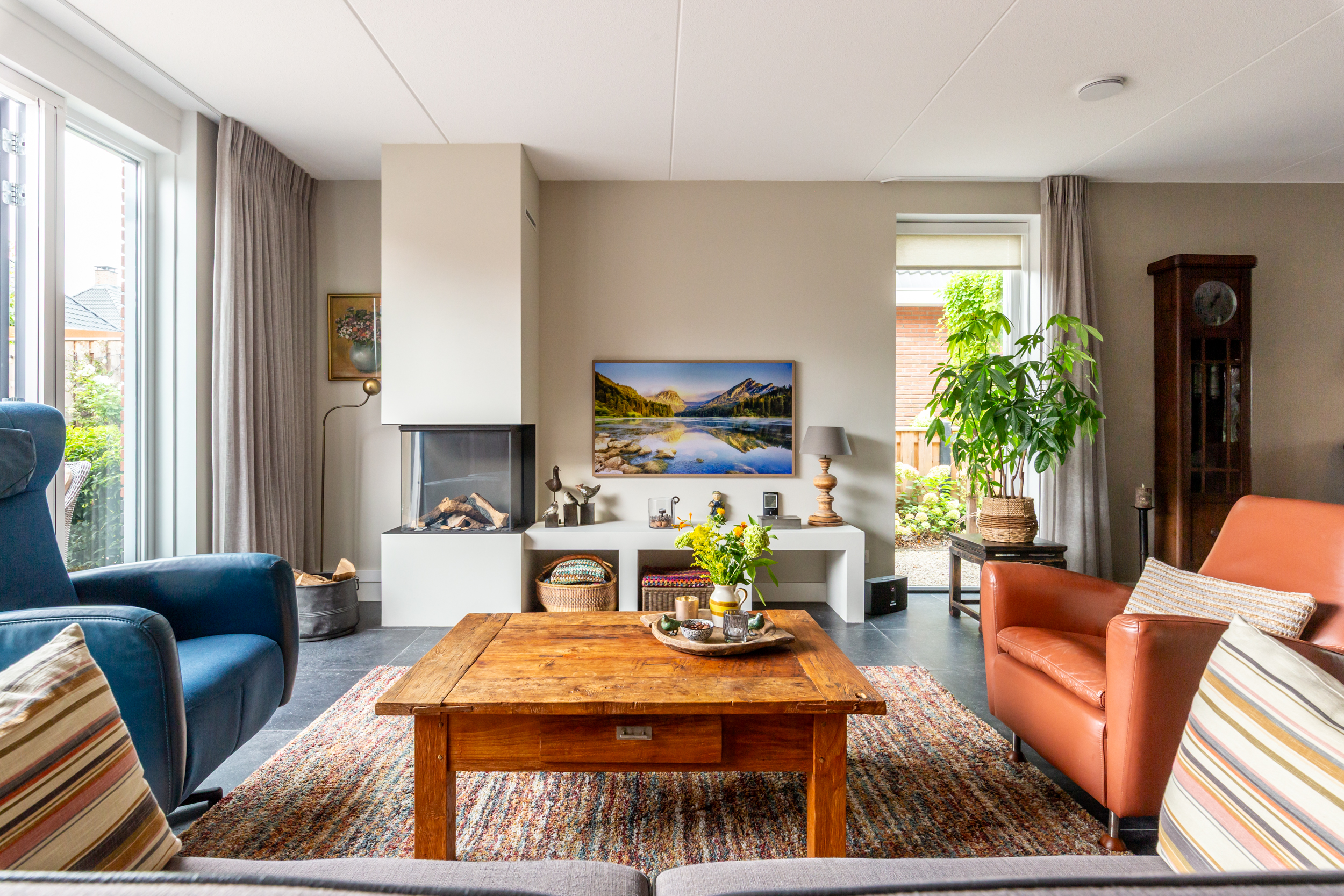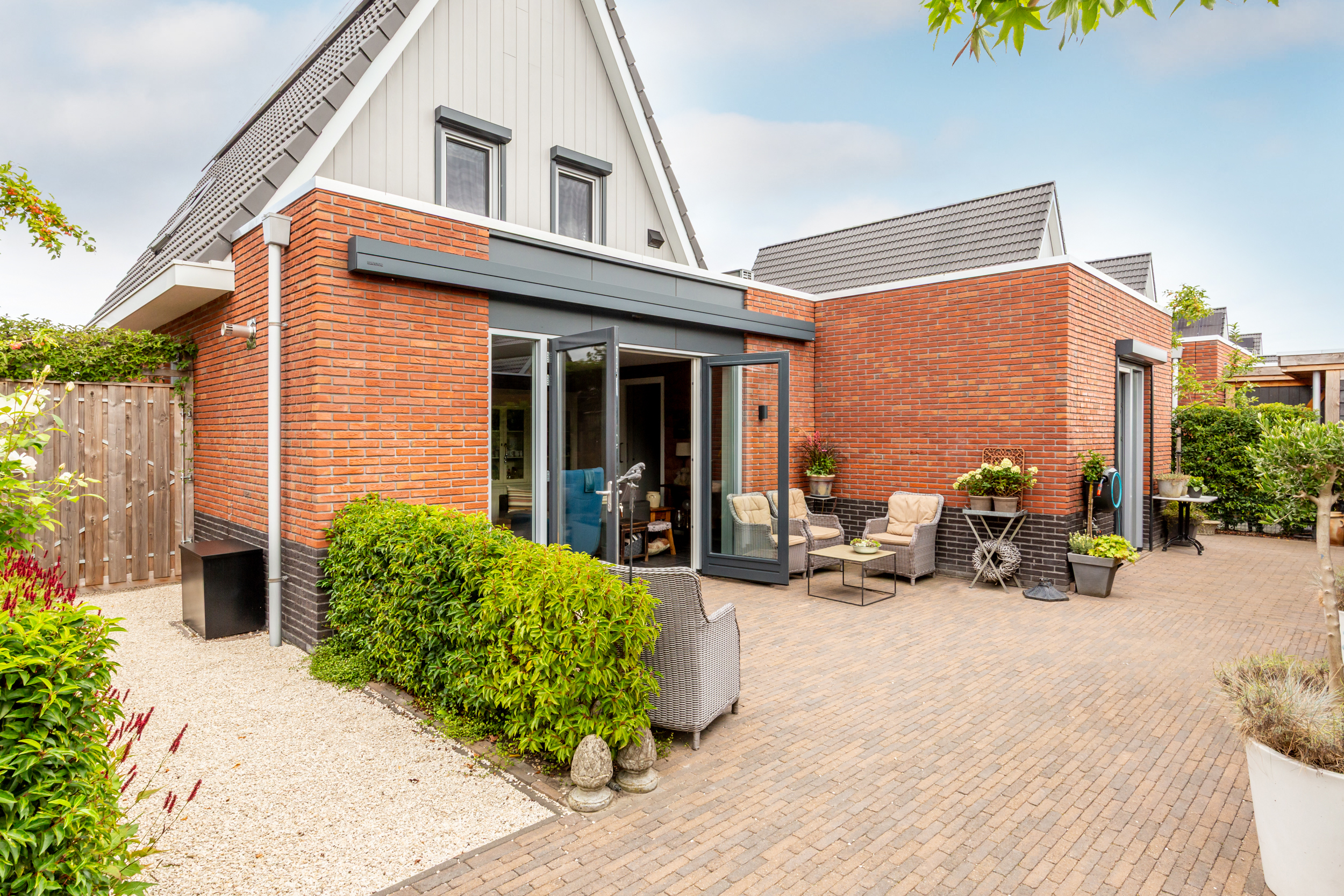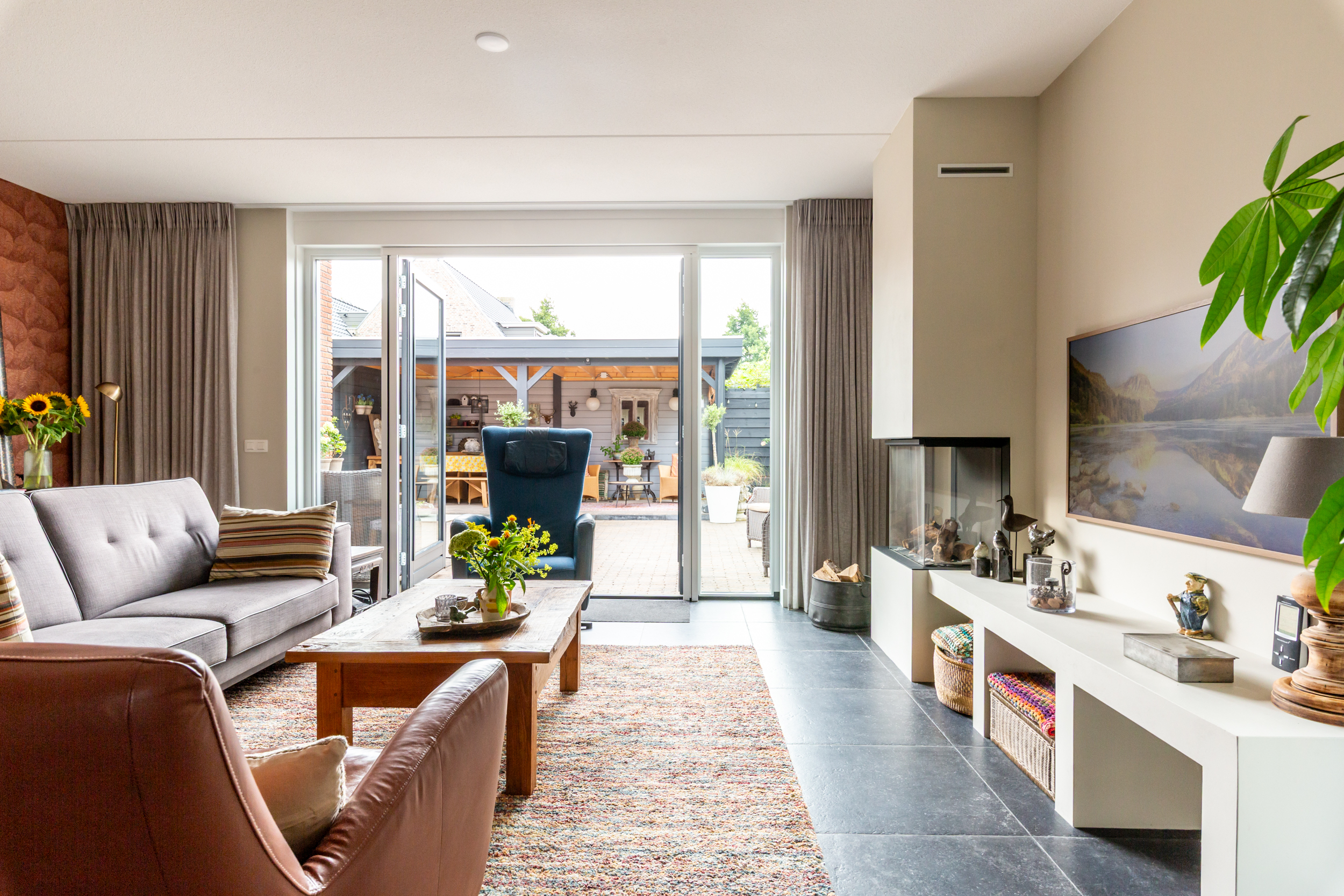 Binnenkomst in de hal met de trapopgang naar de 1e verdieping, de meterkast met daarin de waterontharder, de toegang tot de woonkamer en de toiletruimte, die in een moderne kleurstelling is betegeld en is voorzien van een zwevend toilet en een fonteintje. Door de moderne glazen deur loop je de woonkamer binnen. De keuken bevindt zich aan de voorzijde en is geplaatst in een hoekopstelling met een kookeiland en beschikt over inbouwapparatuur zoals een inductiekookplaat met geïntegreerde afzuiging (met plasmafilter), een koel-/vriescombinatie, een vaatwasser met comfortlift en een oven (Neff). Ter plaatse van de eethoek is er ruimte voor een grote eettafel. De woonkamer op het zuiden is tuingericht en is dankzij de uitbouw van maar liefst 2,40 meter heerlijk ruim, de sfeervolle haard maakt het plaatje compleet. De 2e hal (eventueel afsluitbaar door een schuifdeur) geeft toegang tot de bijkeuken/berging aan de voorzijde en de slaap- en badkamer aan de achterzijde van de woning. In de slaapkamer heb je alle ruimte voor een royaal tweepersoons bed en de grote kastenwand blijft zelfs achter in de woning! Ook vanuit deze slaapkamer loop je zo de tuin in door een draai-kiep deur, die is voorzien van een hordeur en een elektrisch bedienbaar rolluik. De en-suite badkamer is van vloer tot plafond betegeld in natuurtinten en is ingericht met een inloopdouche met hand- en regendouche, een zwevend toilet, een designradiator, een breed wastafelmeubel met 2 kranen en een spiegel met verlichting en verwarming. De badkamer is middels een schuifdeur af te sluiten van de slaapkamer. De bijkeuken/berging beschikt over een wastafel met meubel met koud water, de warmtepomp, opbergruimte en een deur naar de oprit.