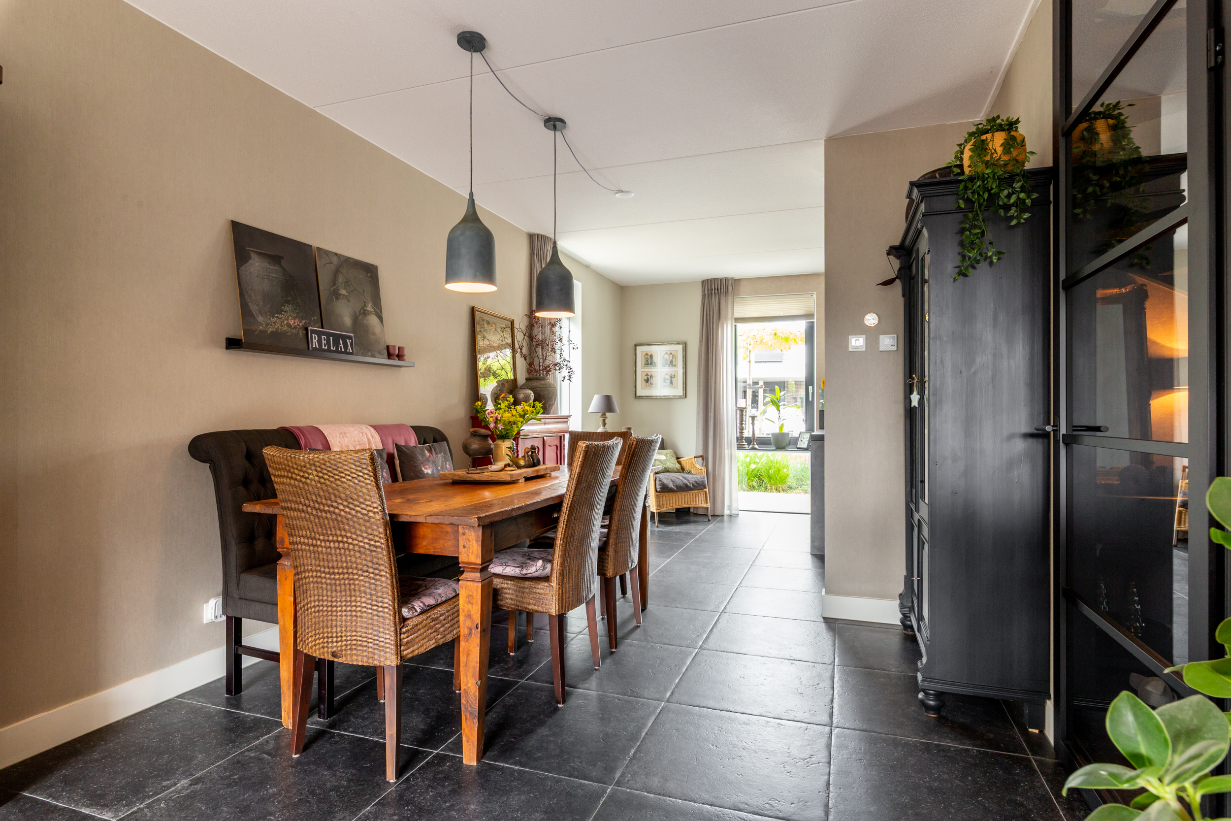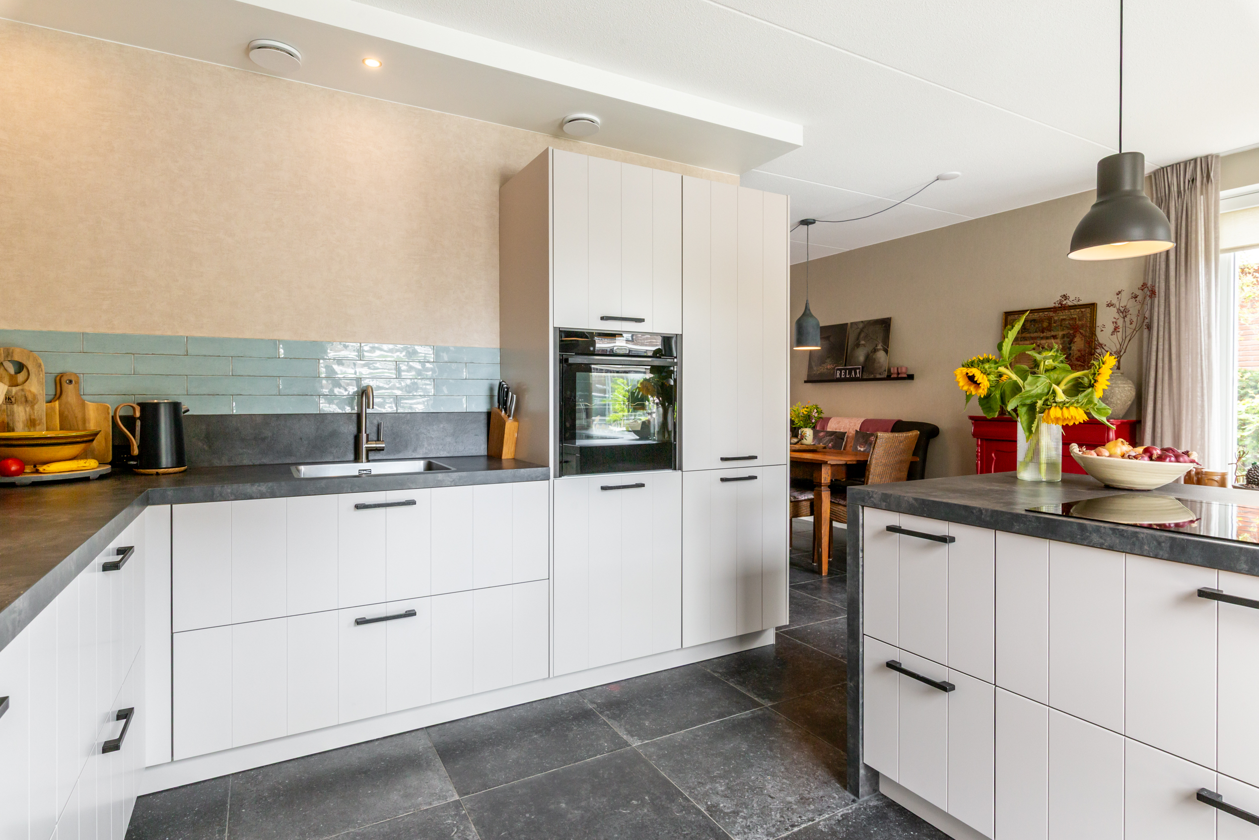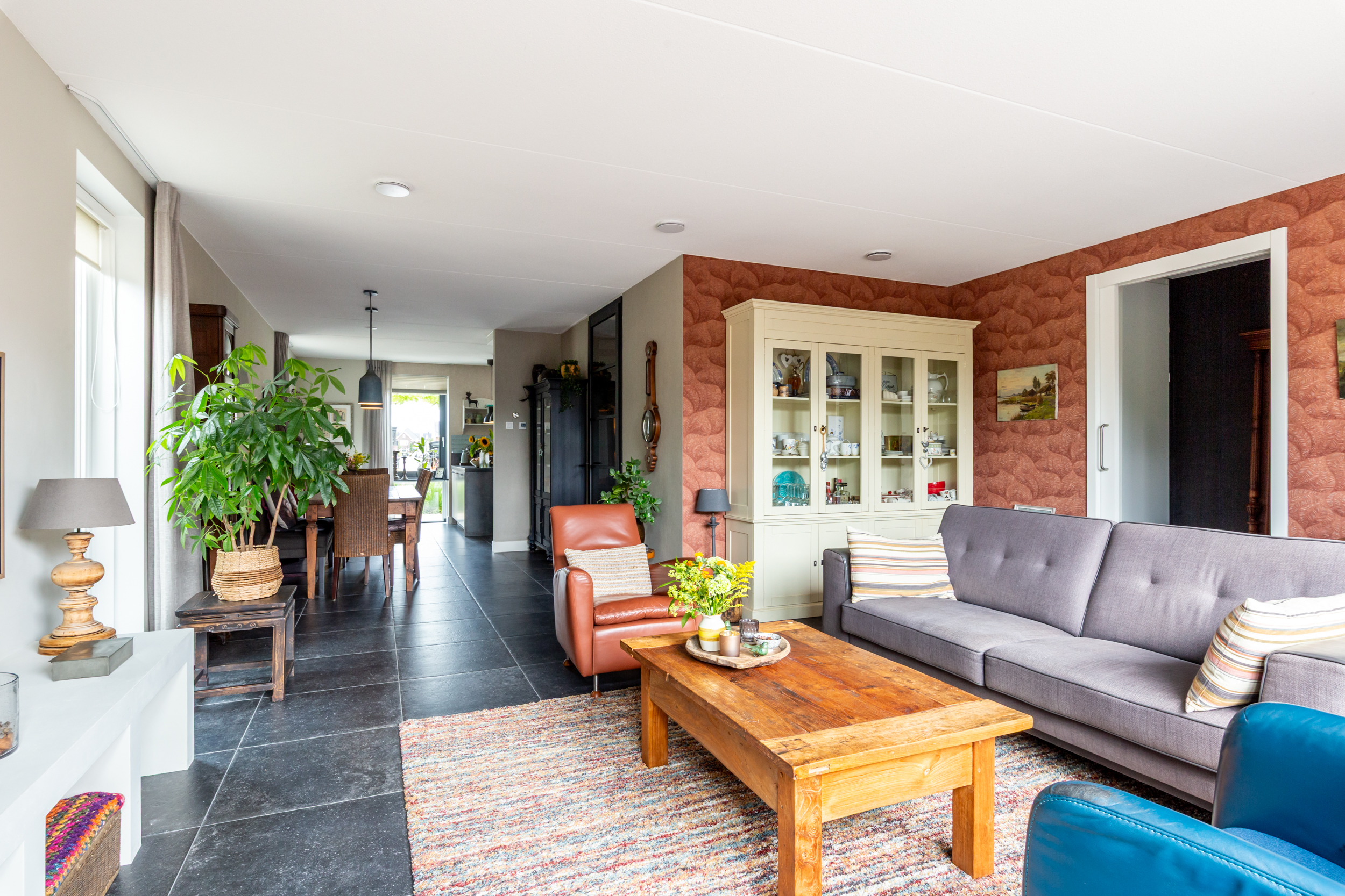 Binnenkomst in de hal met de trapopgang naar de 1e verdieping, de meterkast met daarin de waterontharder, de toegang tot de woonkamer en de toiletruimte, die in een moderne kleurstelling is betegeld en is voorzien van een zwevend toilet en een fonteintje. Door de moderne glazen deur loop je de woonkamer binnen. De keuken bevindt zich aan de voorzijde en is geplaatst in een hoekopstelling met een kookeiland en beschikt over inbouwapparatuur zoals een inductiekookplaat met geïntegreerde afzuiging (met plasmafilter), een koel-/vriescombinatie, een vaatwasser met comfortlift en een oven (Neff). Ter plaatse van de eethoek is er ruimte voor een grote eettafel. De woonkamer op het zuiden is tuingericht en is dankzij de uitbouw van maar liefst 2,40 meter heerlijk ruim, de sfeervolle haard maakt het plaatje compleet. De 2e hal (eventueel afsluitbaar door een schuifdeur) geeft toegang tot de bijkeuken/berging aan de voorzijde en de slaap- en badkamer aan de achterzijde van de woning. In de slaapkamer heb je alle ruimte voor een royaal tweepersoons bed en de grote kastenwand blijft zelfs achter in de woning! Ook vanuit deze slaapkamer loop je zo de tuin in door een draai-kiep deur, die is voorzien van een hordeur en een elektrisch bedienbaar rolluik. De en-suite badkamer is van vloer tot plafond betegeld in natuurtinten en is ingericht met een inloopdouche met hand- en regendouche, een zwevend toilet, een designradiator, een breed wastafelmeubel met 2 kranen en een spiegel met verlichting en verwarming. De badkamer is middels een schuifdeur af te sluiten van de slaapkamer. De bijkeuken/berging beschikt over een wastafel met meubel met koud water, de warmtepomp, opbergruimte en een deur naar de oprit.