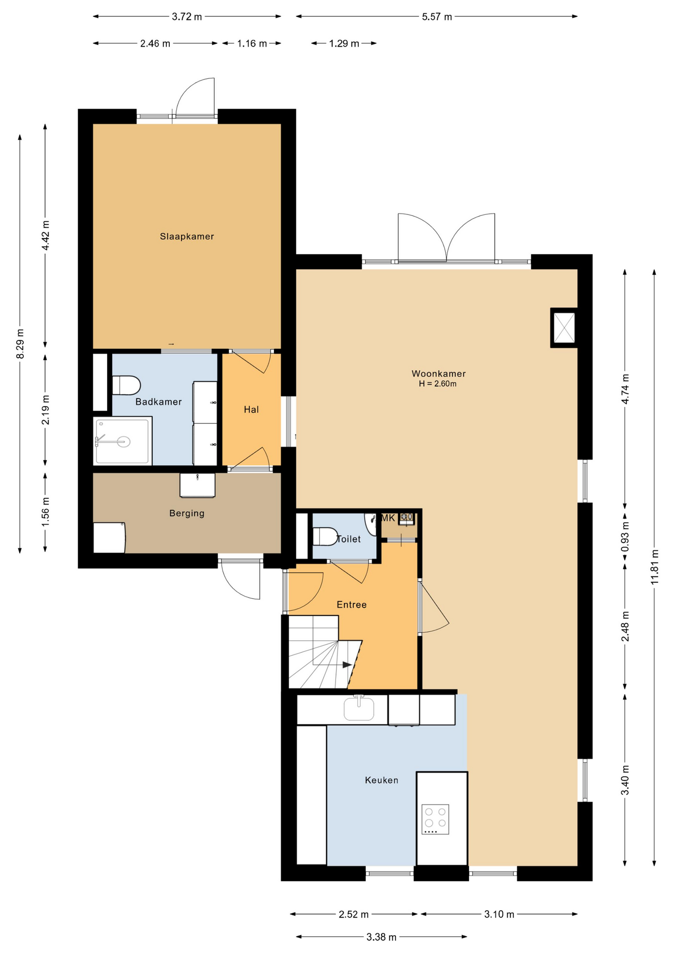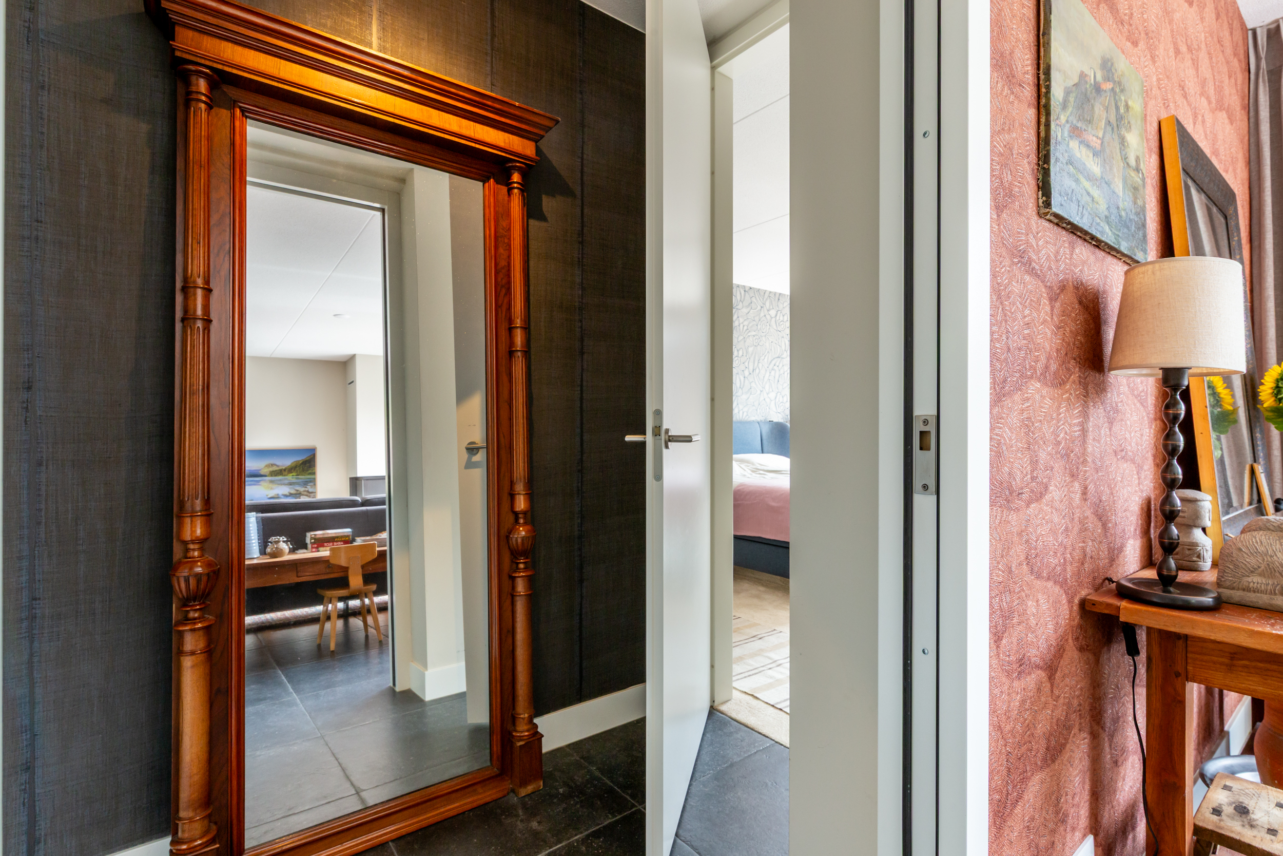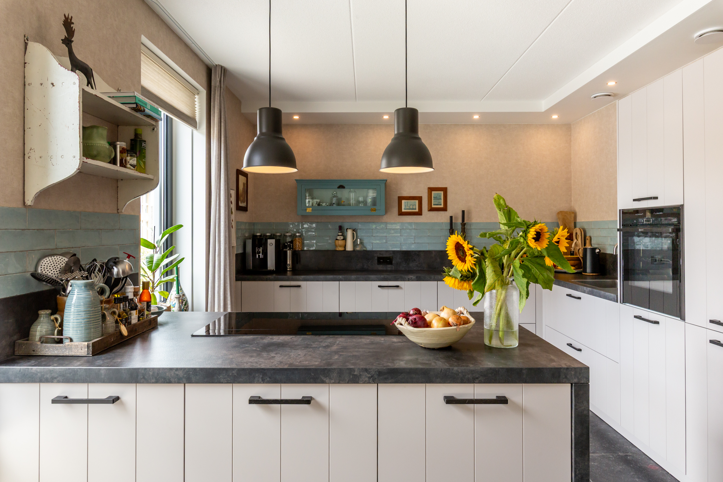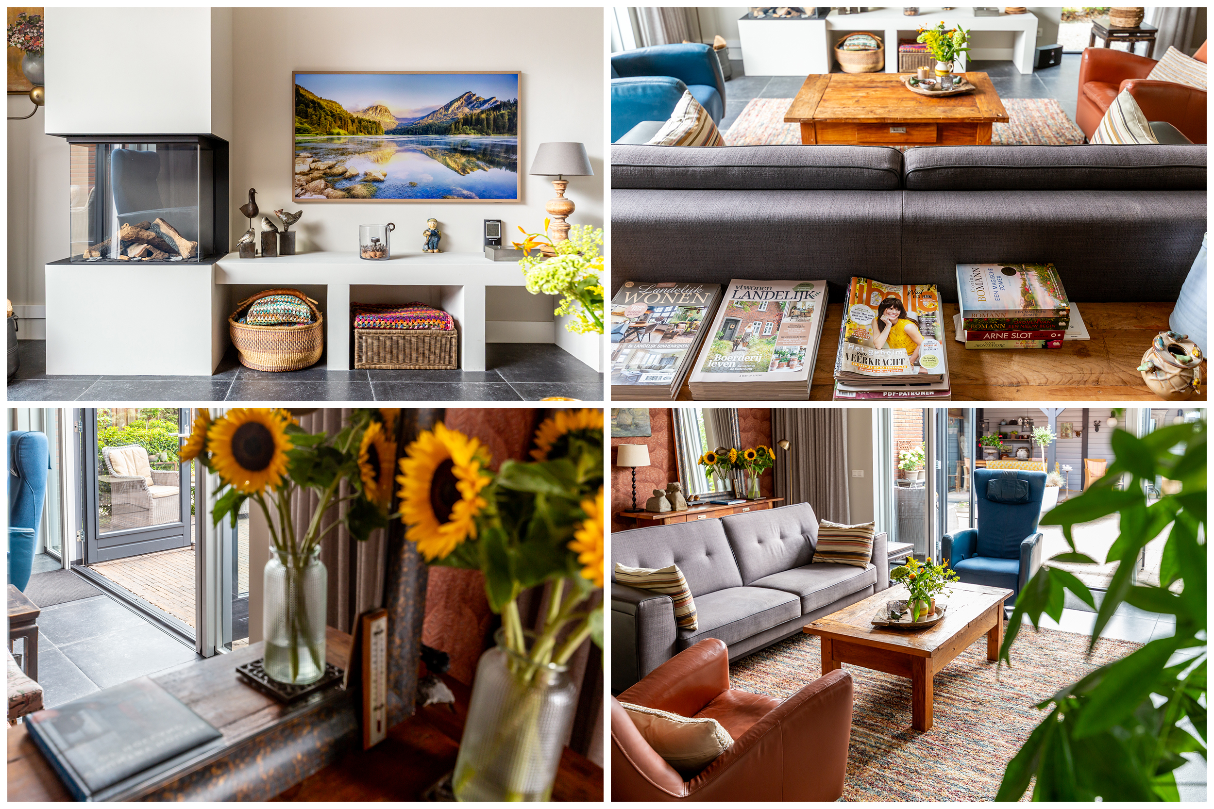 Binnenkomst in de hal met de trapopgang naar de 1e verdieping, de meterkast met daarin de waterontharder, de toegang tot de woonkamer en de toiletruimte, die in een moderne kleurstelling is betegeld en is voorzien van een zwevend toilet en een fonteintje. Door de moderne glazen deur loop je de woonkamer binnen. De keuken bevindt zich aan de voorzijde en is geplaatst in een hoekopstelling met een kookeiland en beschikt over inbouwapparatuur zoals een inductiekookplaat met geïntegreerde afzuiging (met plasmafilter), een koel-/vriescombinatie, een vaatwasser met comfortlift en een oven (Neff). Ter plaatse van de eethoek is er ruimte voor een grote eettafel. De woonkamer op het zuiden is tuingericht en is dankzij de uitbouw van maar liefst 2,40 meter heerlijk ruim, de sfeervolle haard maakt het plaatje compleet. De 2e hal (eventueel afsluitbaar door een schuifdeur) geeft toegang tot de bijkeuken/berging aan de voorzijde en de slaap- en badkamer aan de achterzijde van de woning. In de slaapkamer heb je alle ruimte voor een royaal tweepersoons bed en de grote kastenwand blijft zelfs achter in de woning! Ook vanuit deze slaapkamer loop je zo de tuin in door een draai-kiep deur, die is voorzien van een hordeur en een elektrisch bedienbaar rolluik. De en-suite badkamer is van vloer tot plafond betegeld in natuurtinten en is ingericht met een inloopdouche met hand- en regendouche, een zwevend toilet, een designradiator, een breed wastafelmeubel met 2 kranen en een spiegel met verlichting en verwarming. De badkamer is middels een schuifdeur af te sluiten van de slaapkamer. De bijkeuken/berging beschikt over een wastafel met meubel met koud water, de warmtepomp, opbergruimte en een deur naar de oprit.