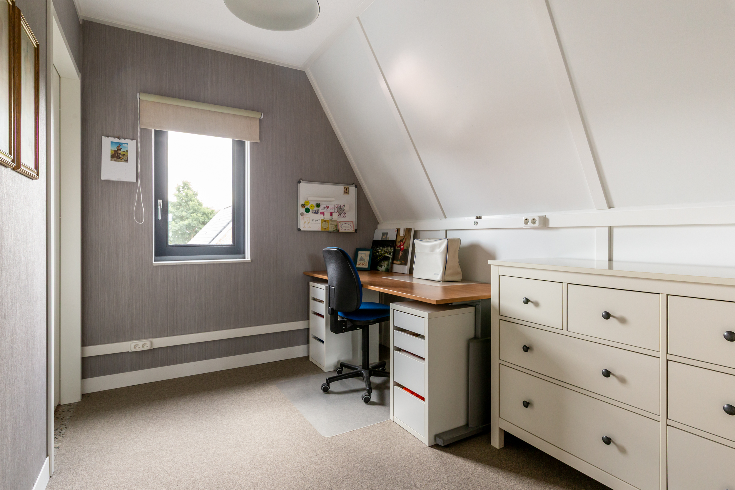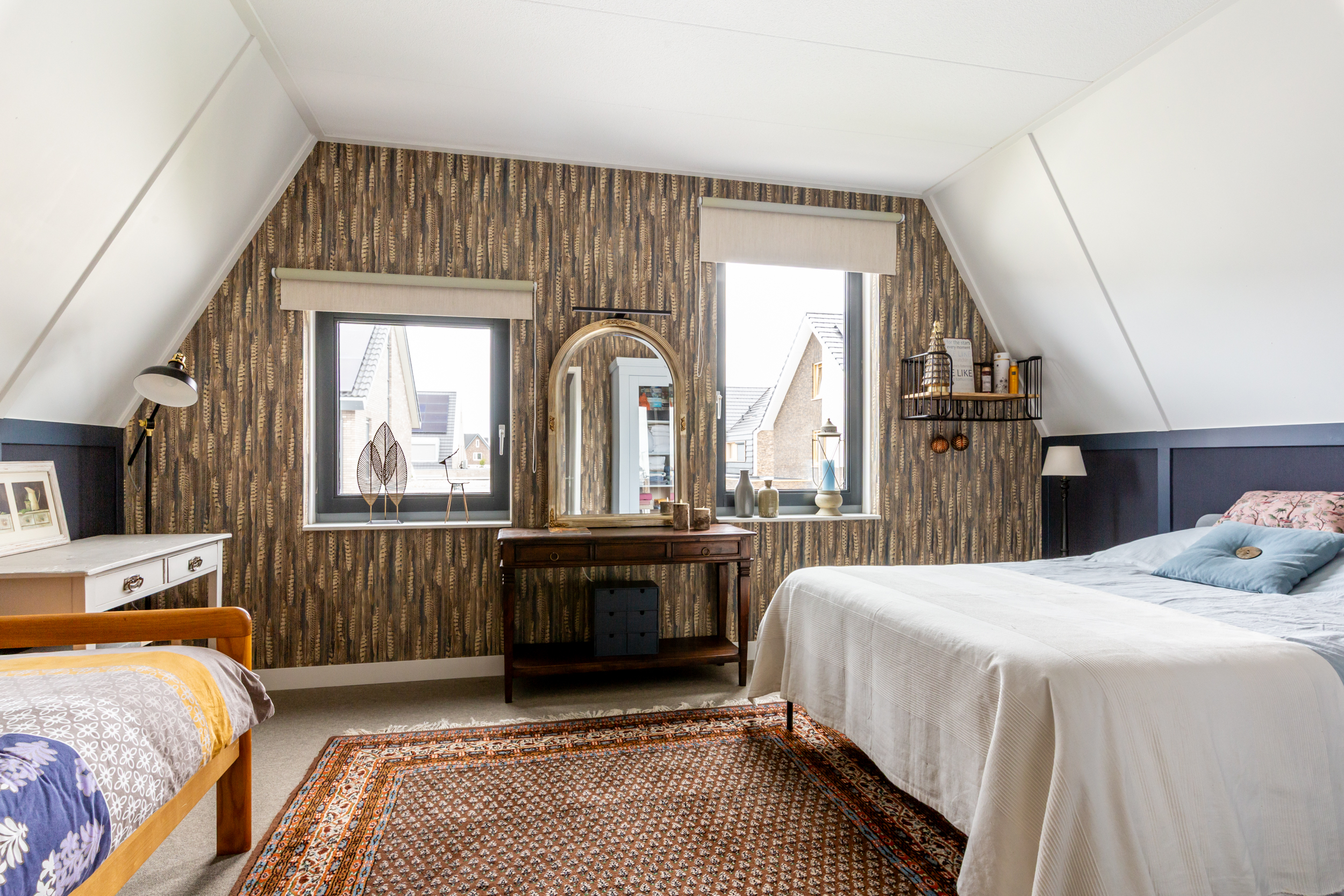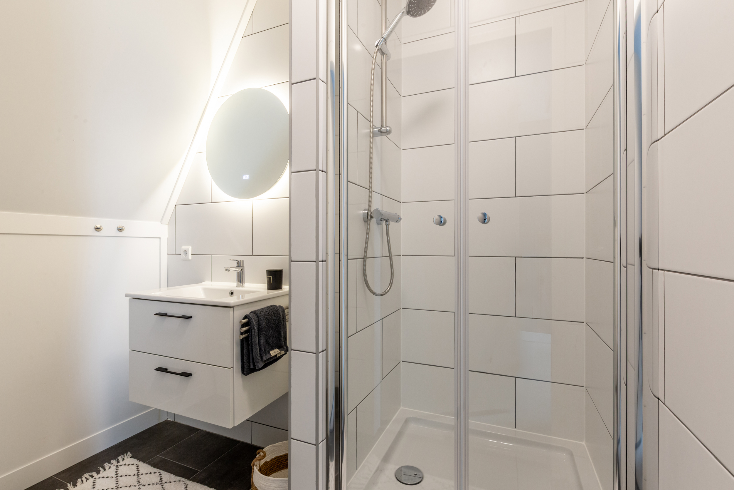 Deze verdieping beschikt over een ruime overloop die toegang geeft tot de 2 kamers en de tweede badkamer. De vliering is bereikbaar middels een luik met vlizotrap. Het dakraam zorgt voor natuurlijk daglicht op de overloop. De grootste kamer is aan de voorzijde van de woning gesitueerd en is over de gehele breedte gelegen, deze kamer kan eventueel gesplitst worden in 2 kamers. De kamer aan de achterzijde biedt toegang tot de wasruimte (deze kan ook dienst doen als kledingruimte), hier staat ook de WTW-unit. Mooi uit het zicht dus! De kamer en de wasruimte zijn beide voorzien van een elektrisch bedienbaar rolluik. De tweede badkamer is in een lichte kleurstelling betegeld van vloer tot plafond en is ingericht met een toilet, een wastafel met meubel, een spiegel met verlichting en verwarming en een douchecabine.