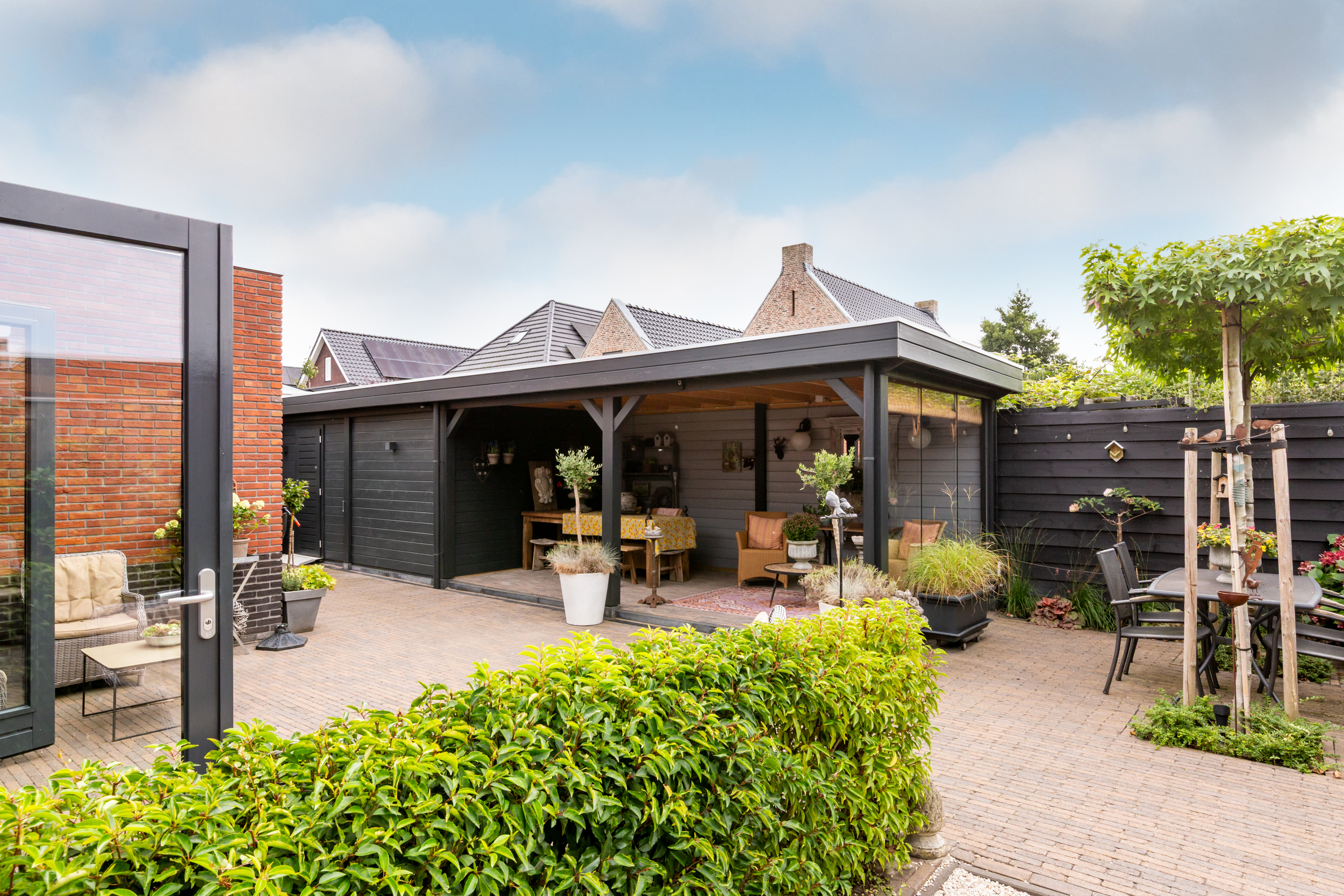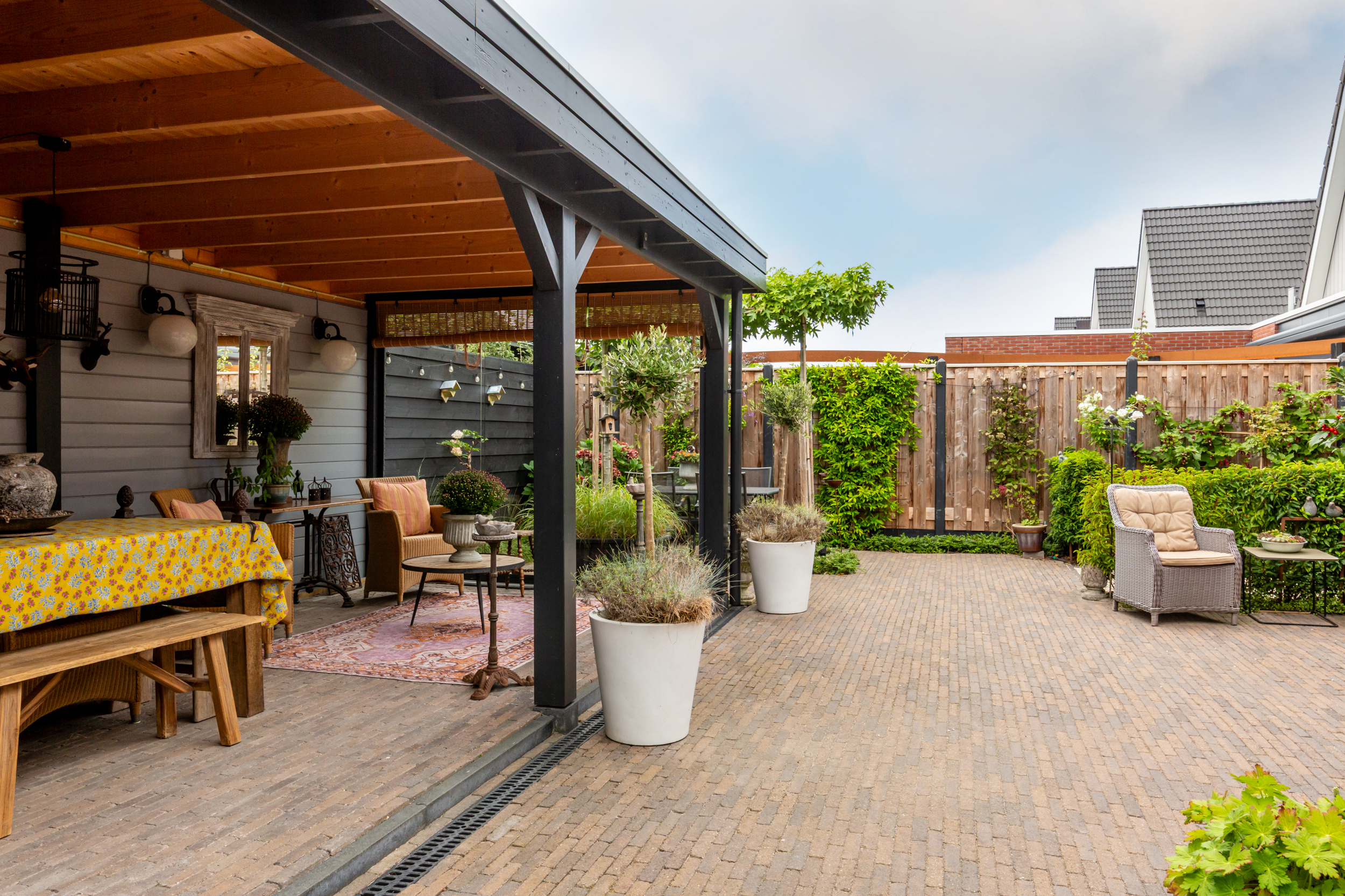 In deze tuin, die op het zuiden is gelegen, is het meteen genieten! Sla de dubbele tuindeuren open en het valt meteen op dat er over deze tuin is nagedacht. Een fijne dosis groen, mooie bestrating en een sfeervolle grote veranda met glazen zij-/schuifwand. Dat klinkt goed toch? Dankzij het formaat van de veranda kun je deze helemaal inrichten zoals je wilt: een grote eettafel, een loungeset of zelfs beiden! Aansluitend aan de veranda is een grote berging aanwezig, die je alle ruimte geeft voor het opslaan van tuingereedschap en om de fiets in te kunnen stallen. De tuin (voor en achter) en berging zijn voorzien van elektra. Door bijna de gehele tuin is een waterdruppel systeem aanwezig. De achtergevel is voorzien van een groot elektrisch bedienbaar zonnescherm. Aan beide kanten van de woning zijn afsluitbare poorten gerealiseerd. Altijd fijn!