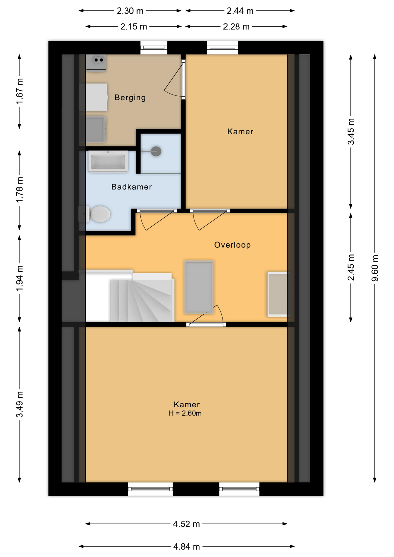 Maak gemakkelijk gebruik van de vlizotrap en je bereikt de grote vliering/zolder over de gehele lengte van de woning, waar je alle ruimte hebt voor het opslaan van extra spullen. Door de nokhoogte van 2.60 meter is dit een zeer bruikbare ruimte.