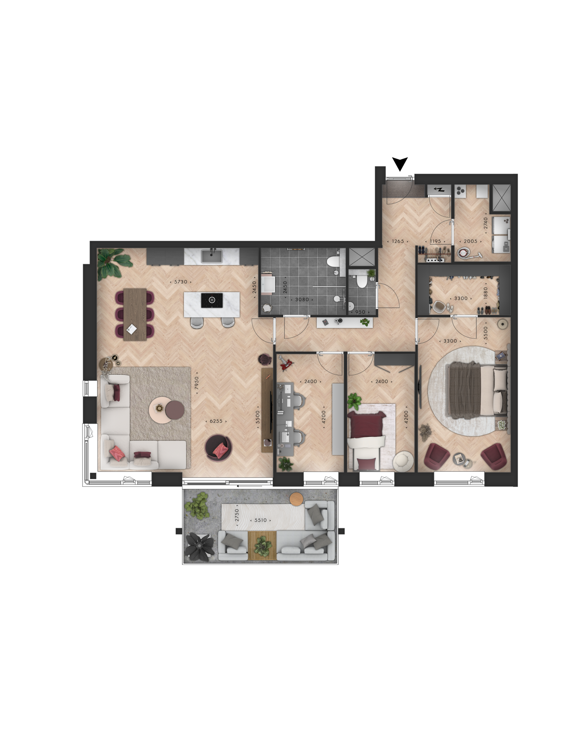 Dit is uw ruime vierkamergevoel, met een living waar u echt wat mee kunt. De open keuken met eiland is de plek waar u eindeloos kunt tafelen met familie of goede vrienden. Uw appartement heeft drie (slaap)kamers waarvan u er eentje slim kunt inzetten als inloopkast, werkplek of logeerkamer. En ja, dat balkon aan de zuidzijde nodigt uit tot lang buiten zitten. Wat een ruimte en wat een luxe!
